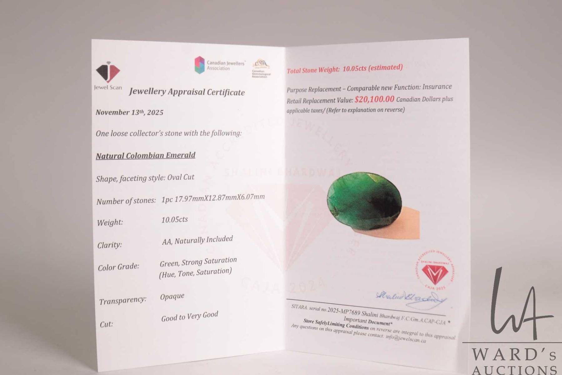 10.05 ct. Columbian Emerald oval cut gemstone with certificate provided by consignor