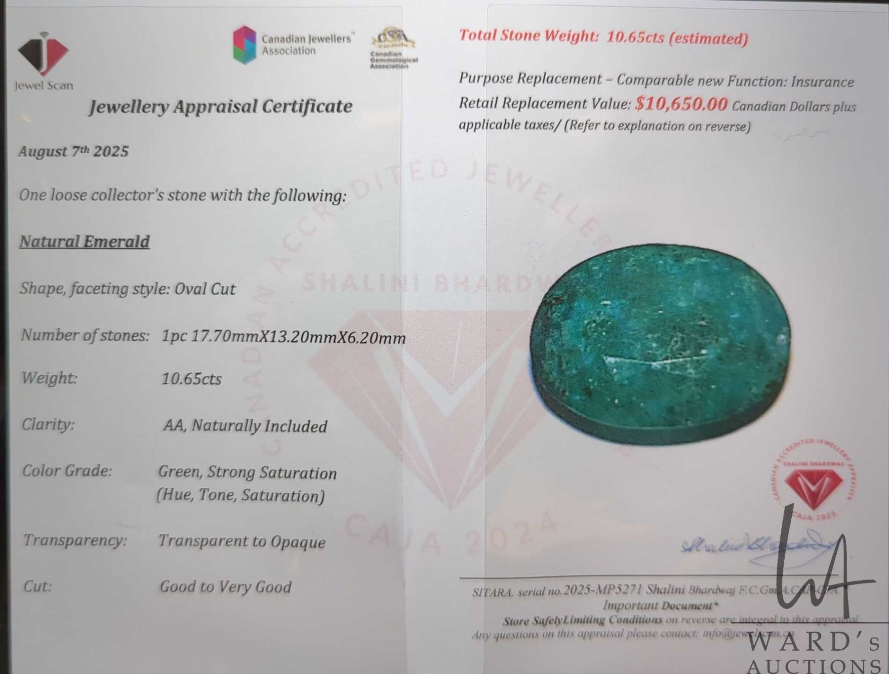 10.65 ct certfied Emerald gemstone, Certificate provided by consignor