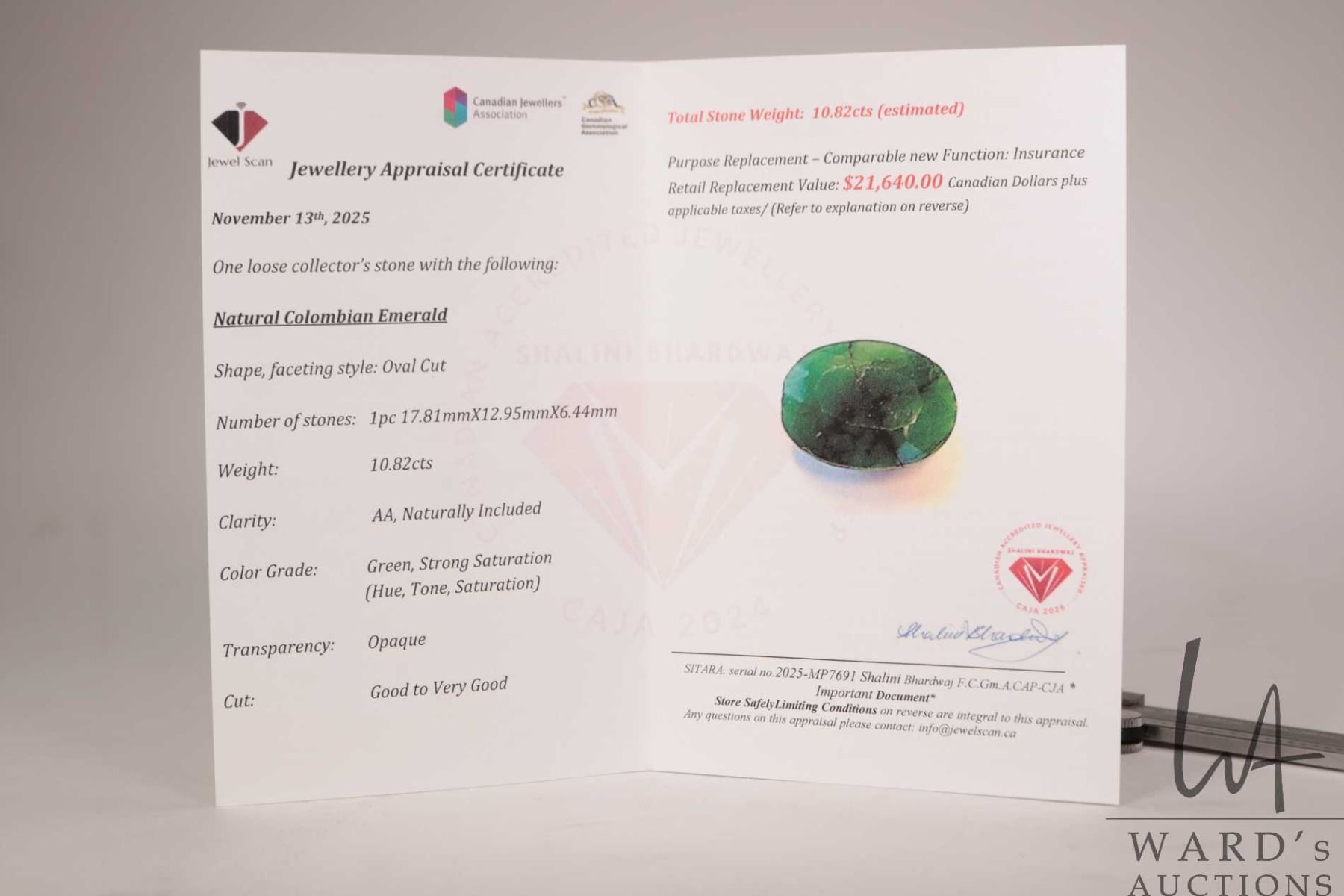10.82 ct Columbian emerald oval cut gemstone with certificate provided by consignor