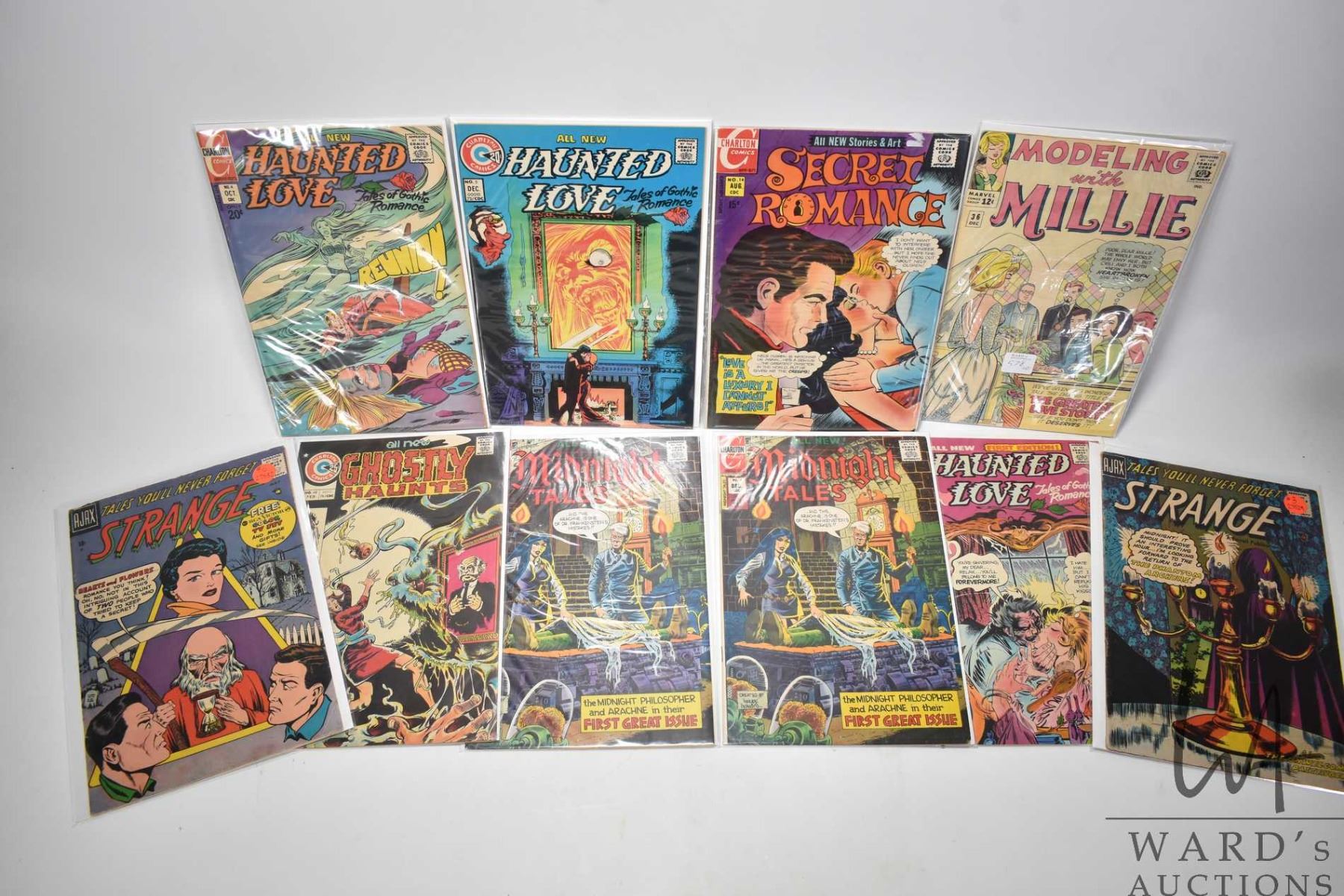 10 assorted comics including 7 Charlton Comics; 3 Haunted Love, 2 Midnight Tales, 1 Ghostly Haunts and 1 Secret Romance, 2 Ajax Strange and 1 Marvel "Modeling with Millie"