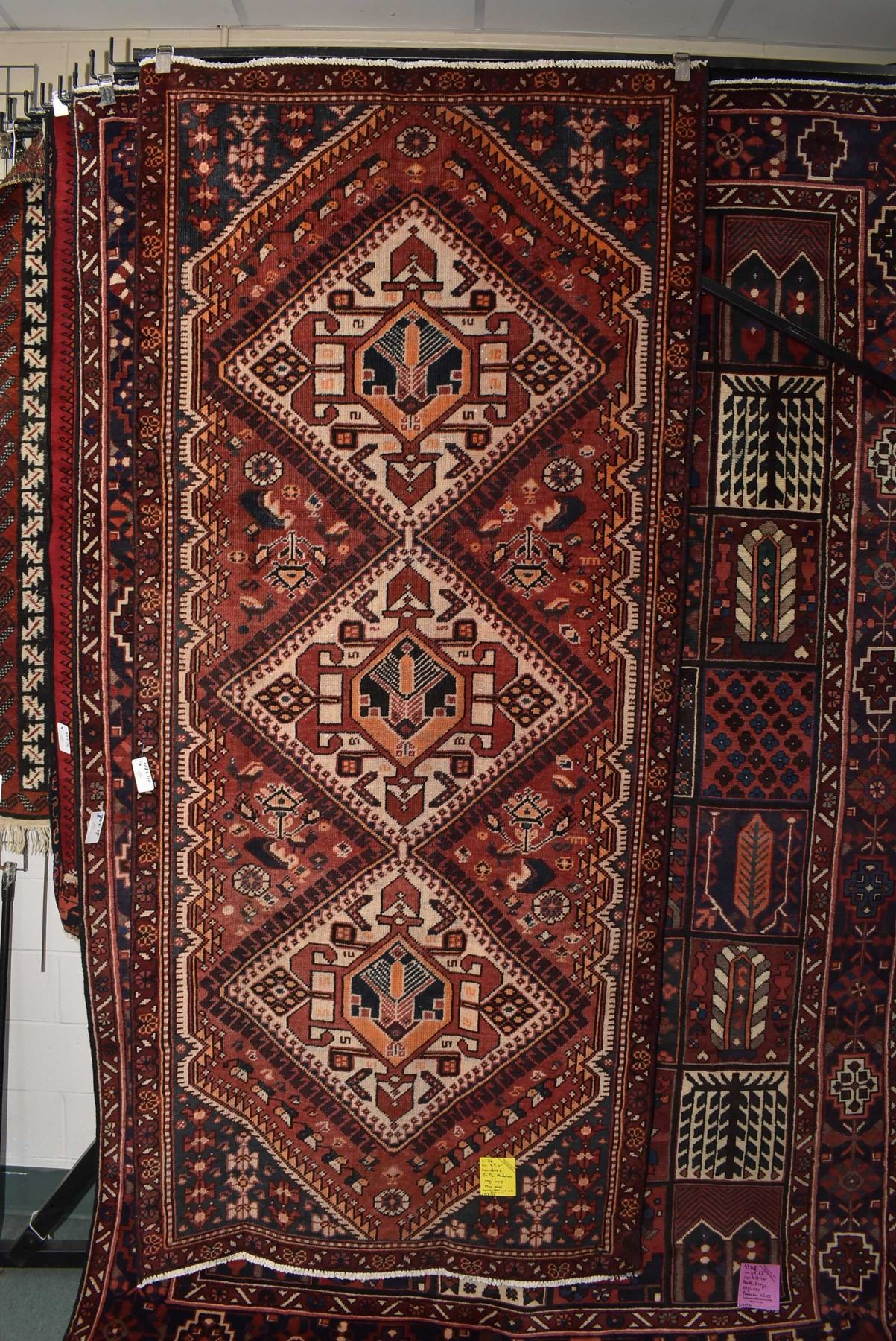 100% Handmade Iranian Shiraz area carpet with triple medallion, red background with overall geometric floral and animal designs, highlights are orange, cream, blue etc. 48" X 110"