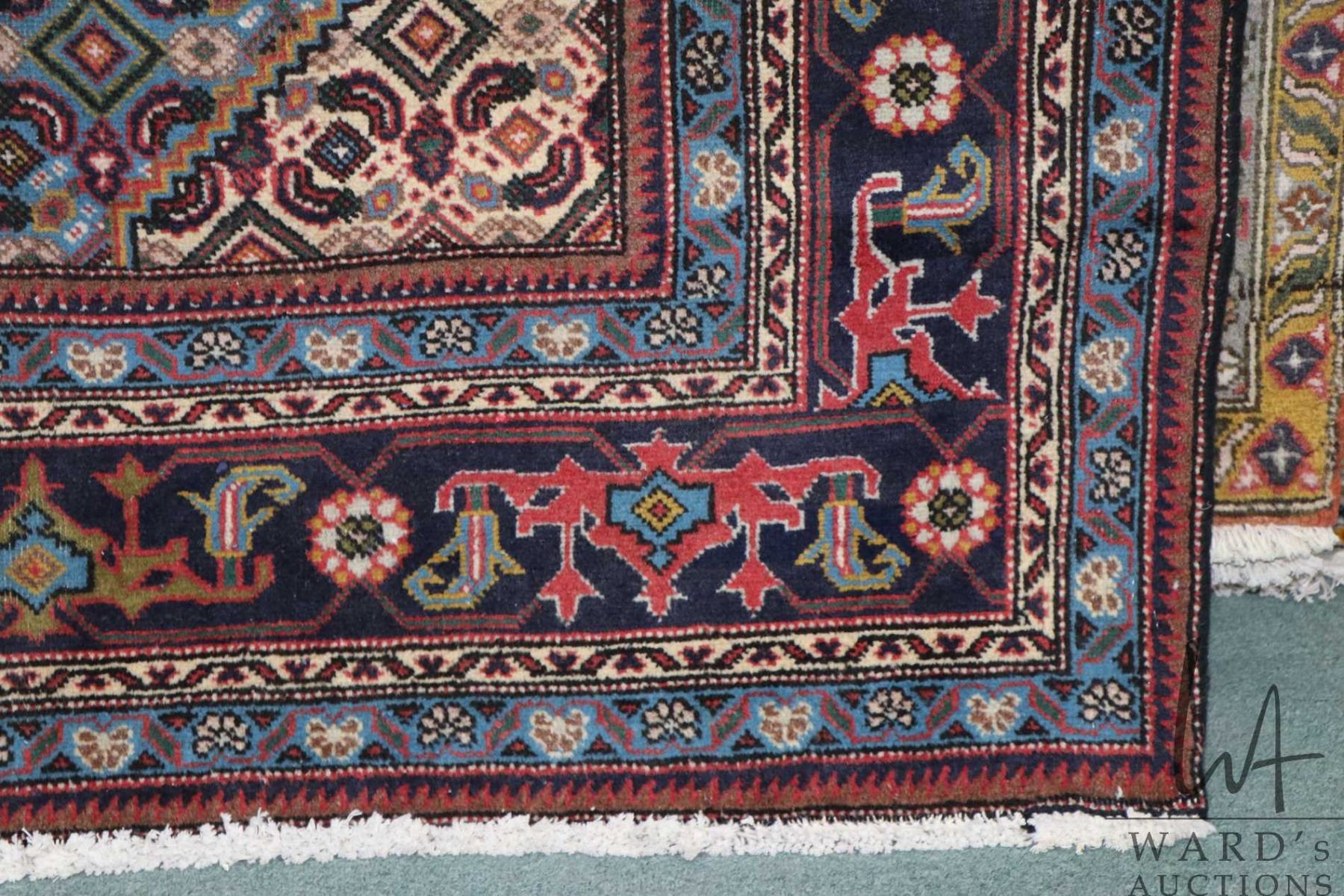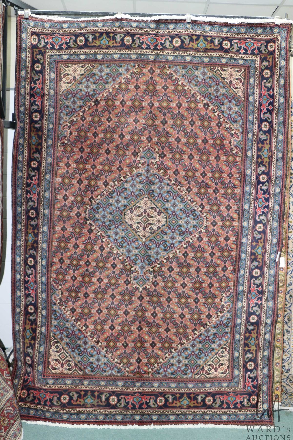 100% Iranian wool carpet "Ardedil" with center medallion, overall geometric pattern and multiple borders, highlights of blue, sage and red, 81" X 118"