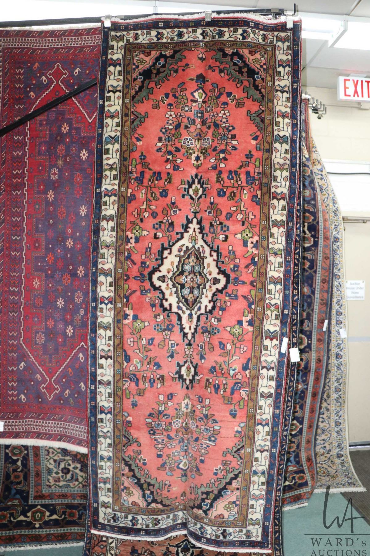 100% Iranian wool carpet runner "Hamedan" with center medallion, red background and highlights of blue, taupe, cream etc. 42" X 106"