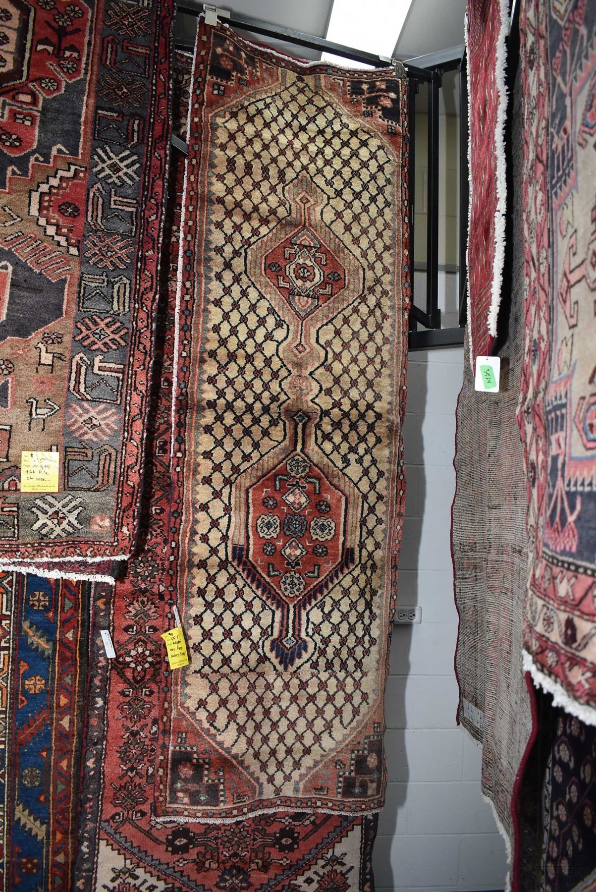 100% Iranian wool carpet runner with unusual double medallion, soft taupe background, geometric crisscross pattern, highlights in blue, cream etc. 27" X 79"