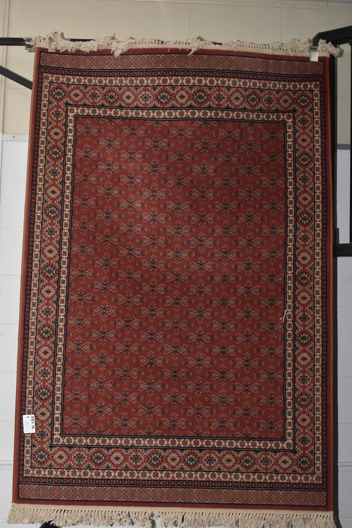100% Virgin wool American Classic area carpet with brick coloured background, multiple border and highlights of cream, grey, blue etc. 48" X 72"