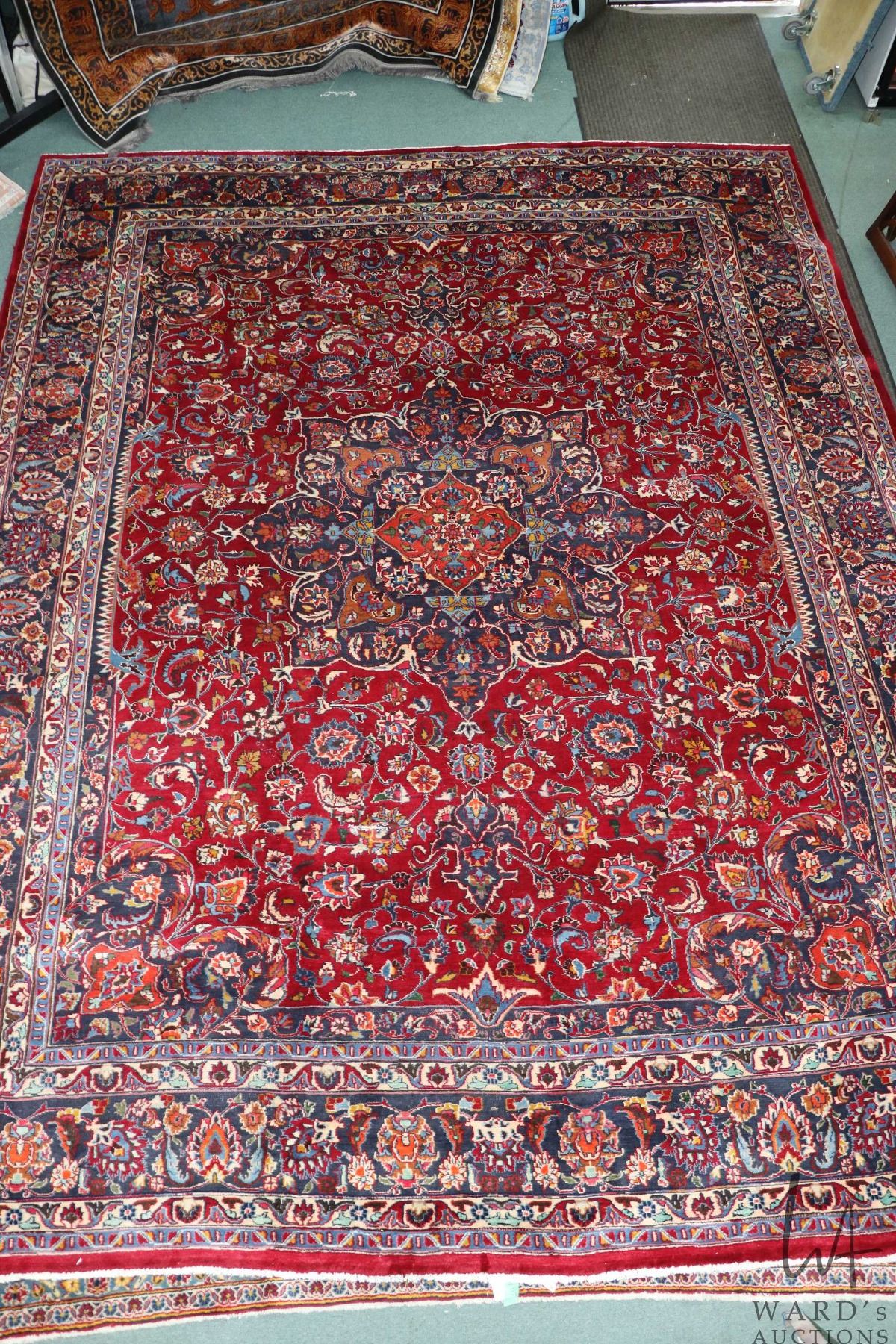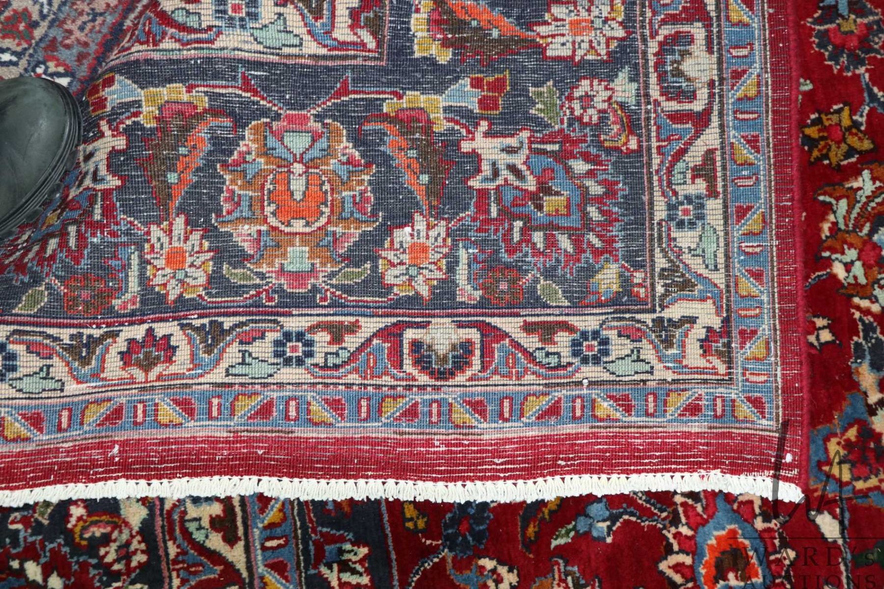 100% hand made Iranian "Mashad" carpet signed by Weaver with center medallion, multiple boarders, red background, highlights of navy, teal, cream and orange. 116" x 152" .Note: 4" tear. See photos.