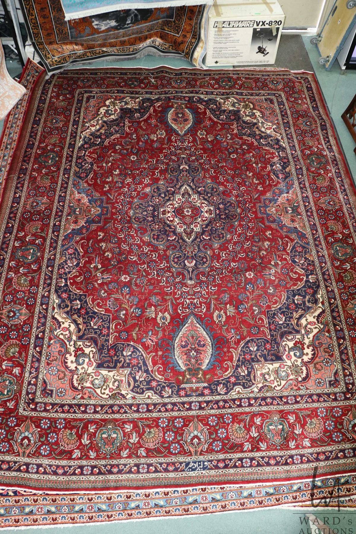 100% hand made Iranian "Tabriz" carpet artist signed with centre medallion, multiple boarders, red background and highlights of blues, cream, purple, etc. 117" x 157"