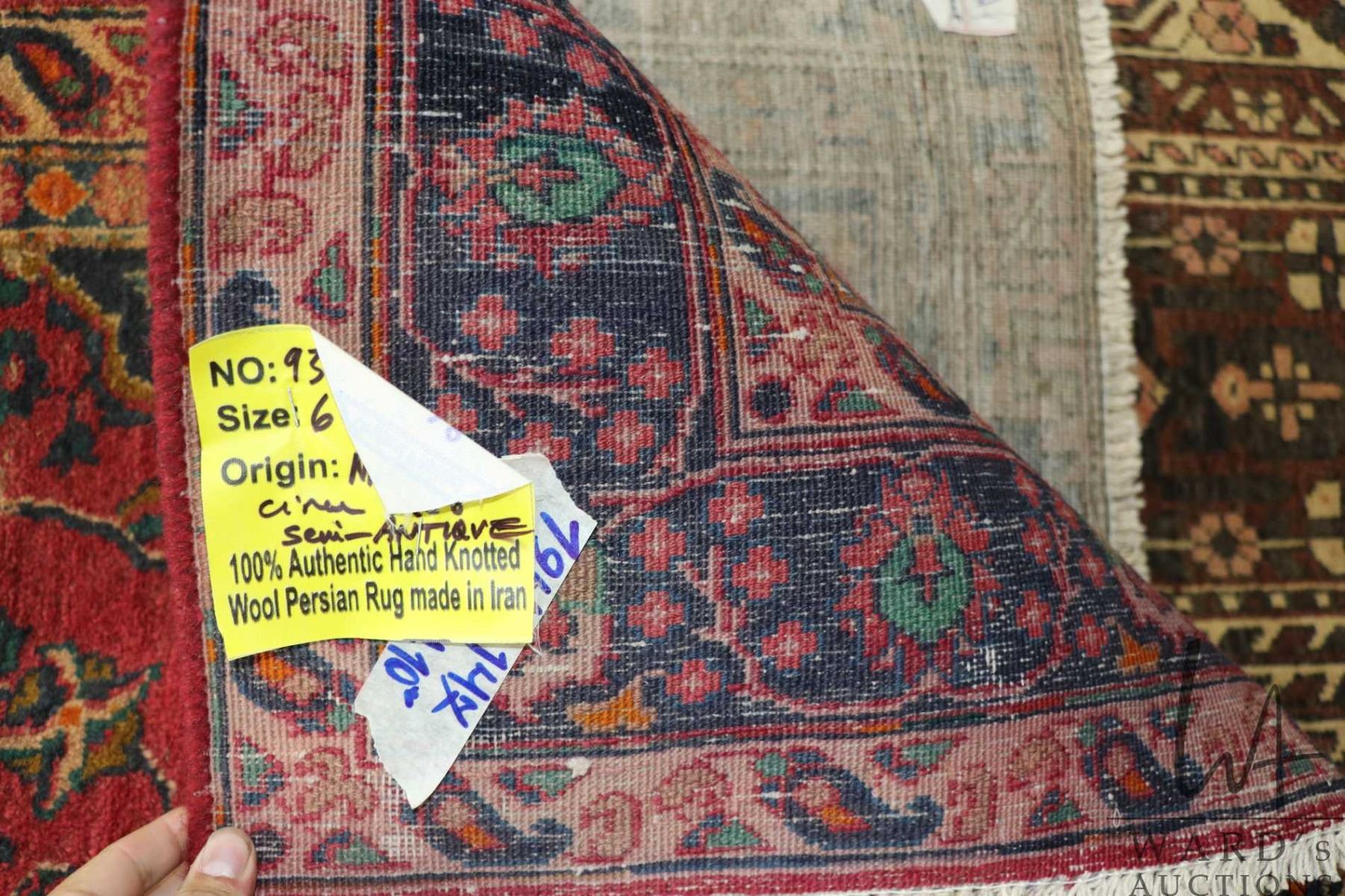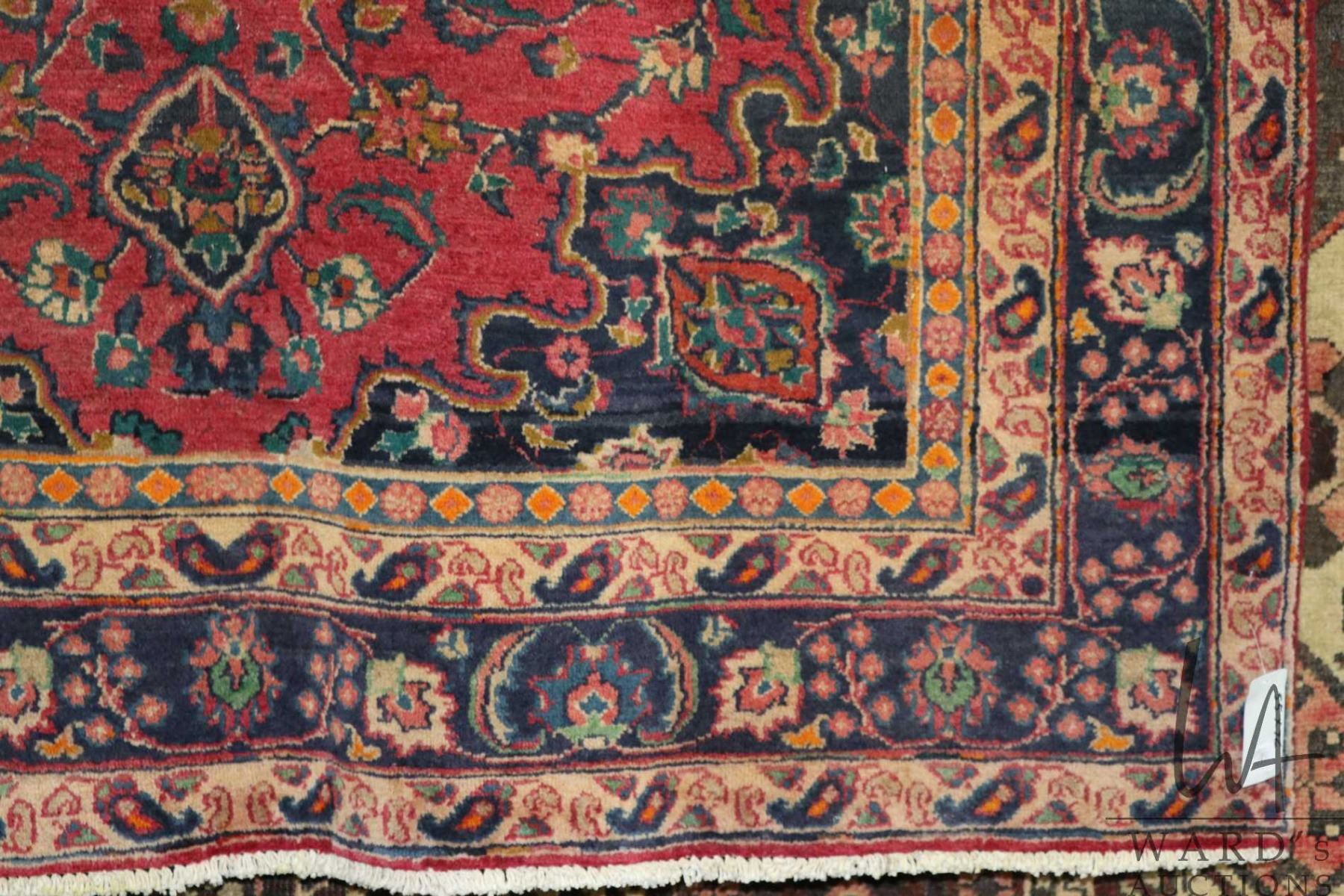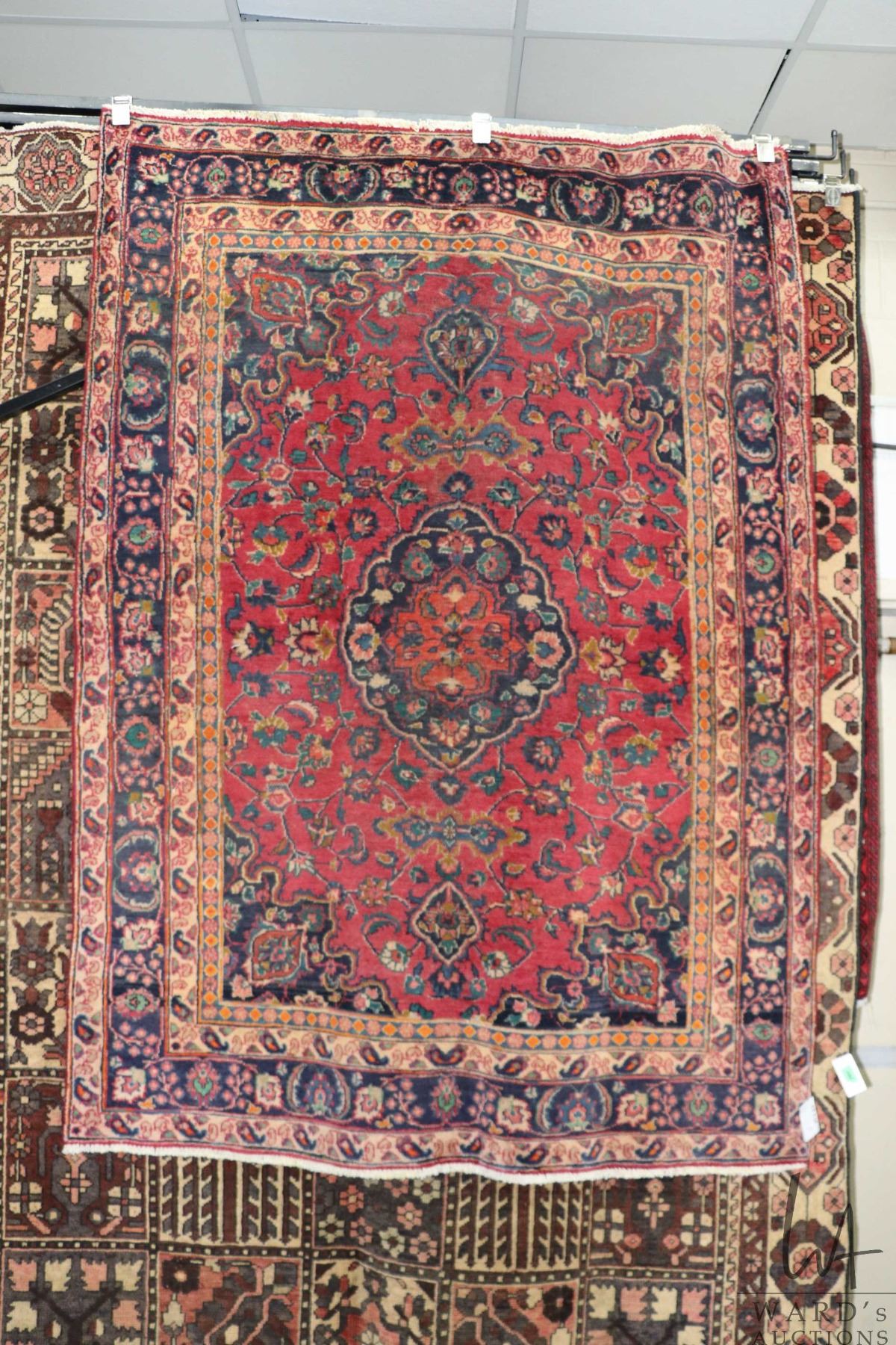 100% hand made Iranian carpet "Mashad" with center medallion, red background and floral design, highlights of taupes, blue and orange etc. 55" X 76"