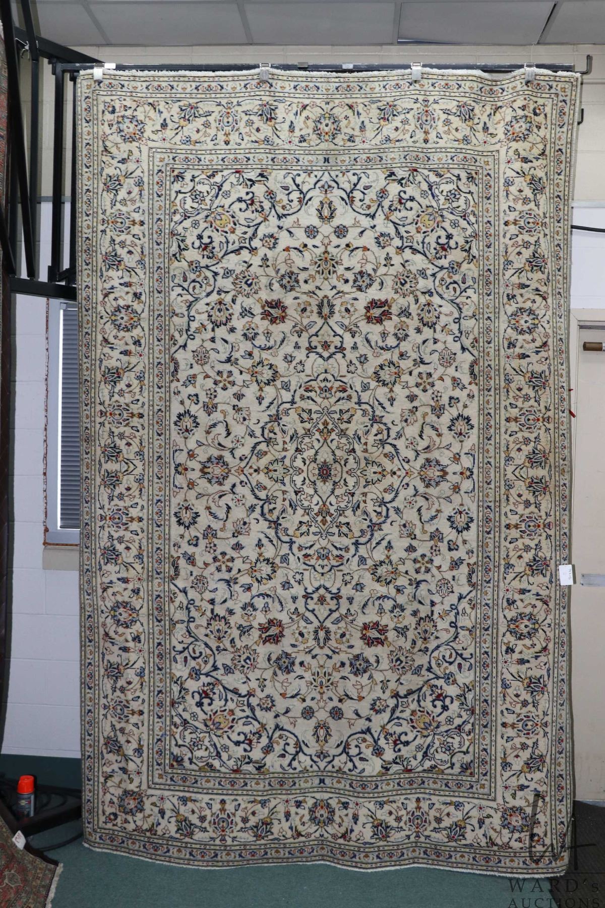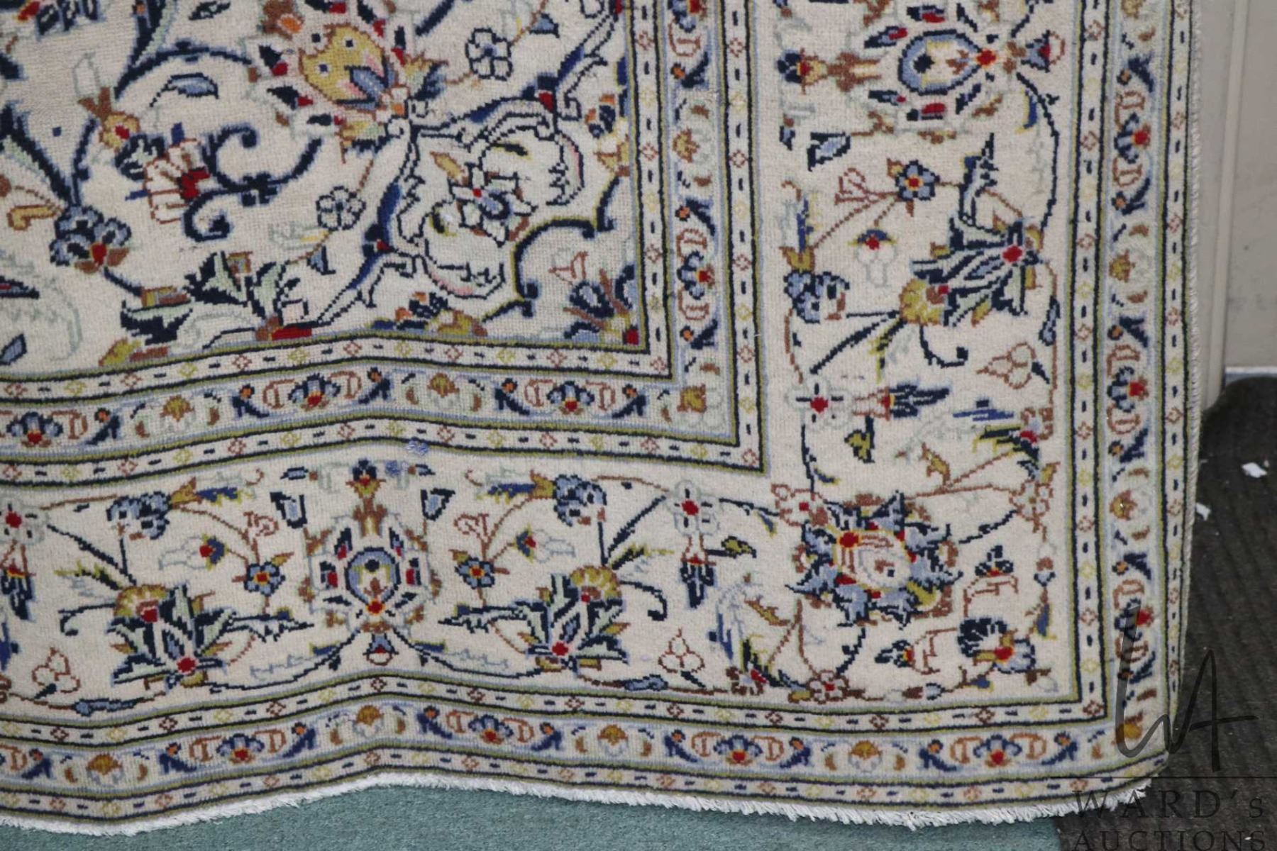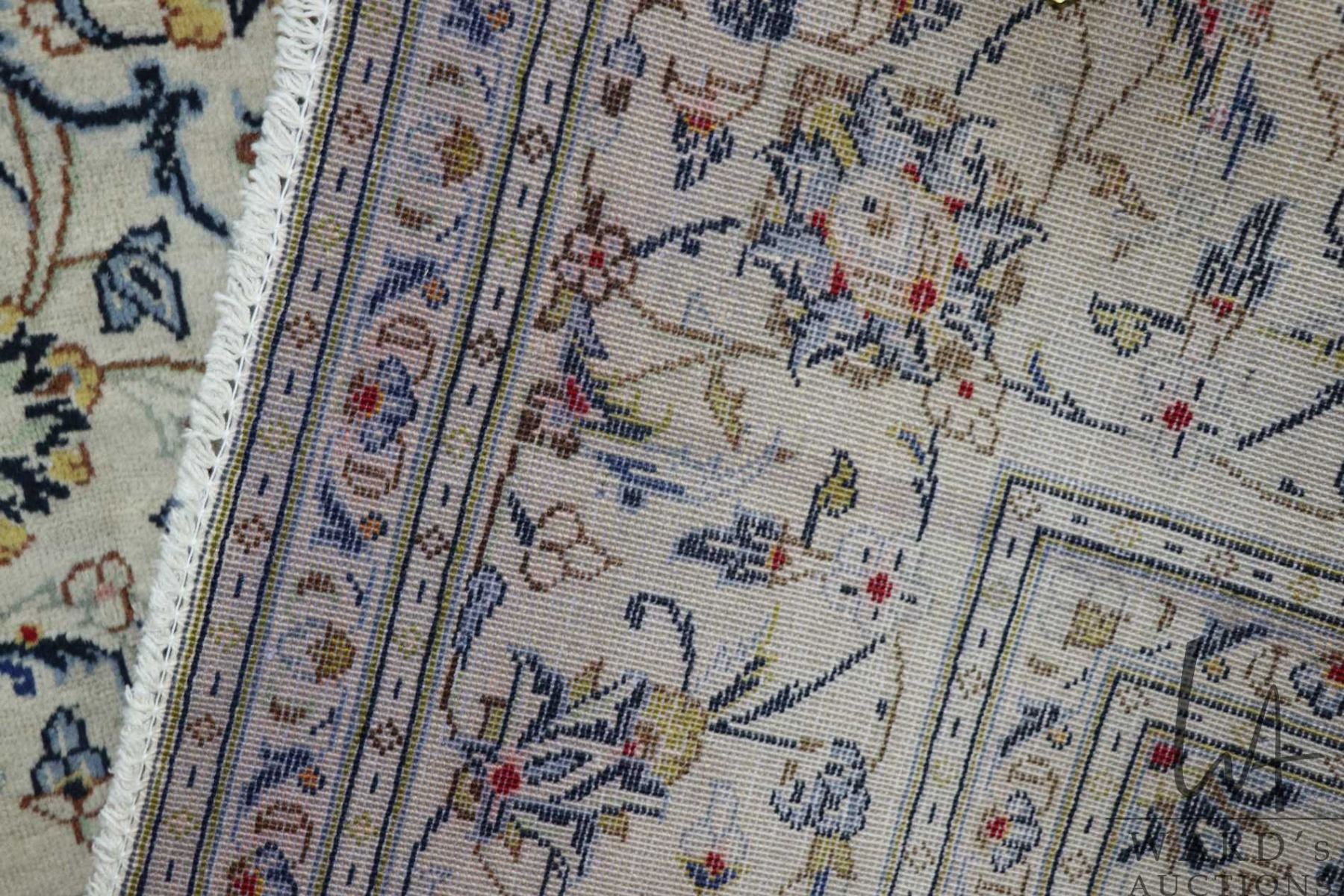 100% hand made Iranian wool "Kashan" area carpet with center medallion, cream background and overall floral design, highlights of blue, taupe and red etc. 74" X 116"