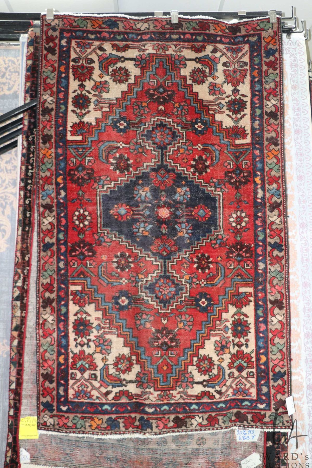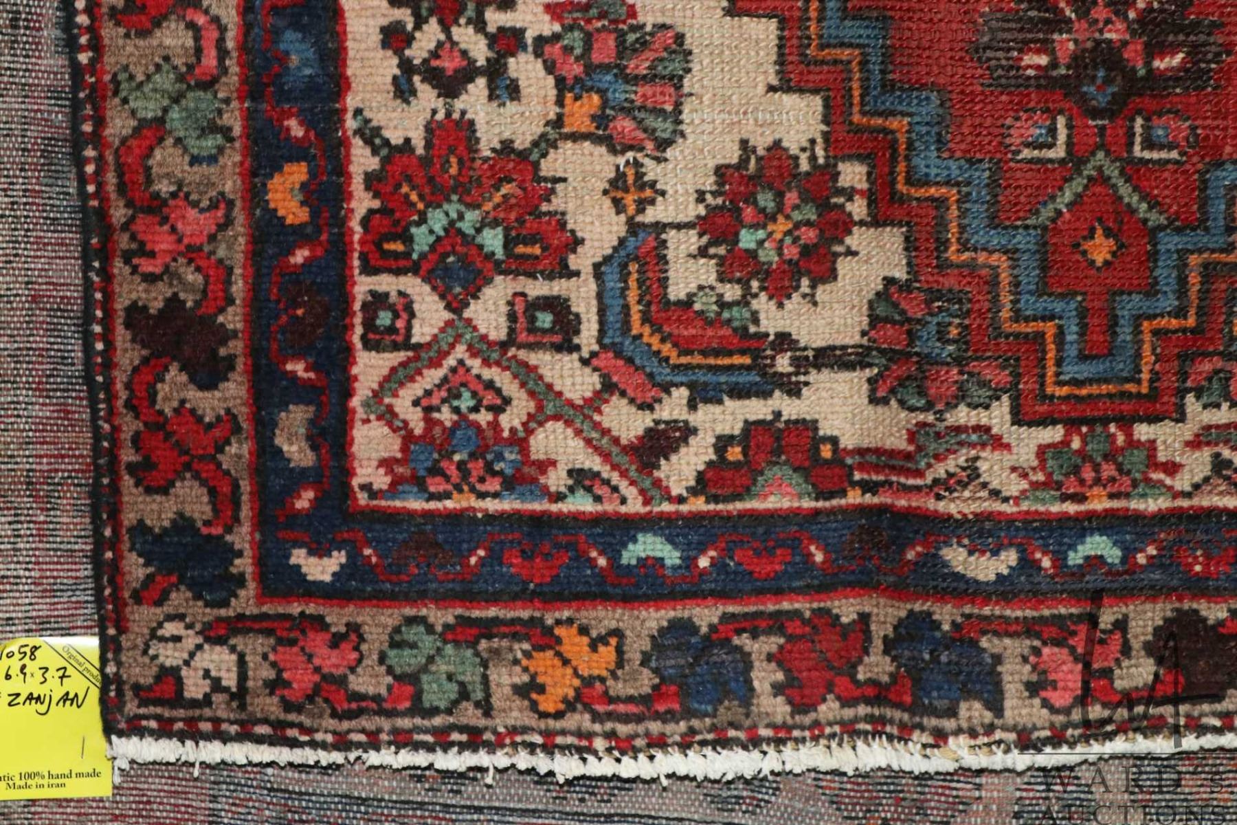 100% hand made Iranian wool carpet "Zanjan" with center medallion, red background and highlights of blues, orange, green etc. 44" X 74"
