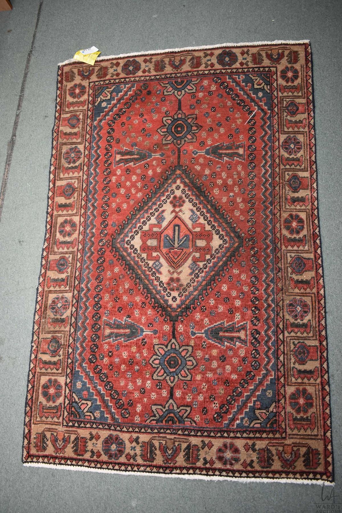 100% handmade Abadeh throw carpet with center medallion, red background, blue, tan, orange highlights etc. 40" X 63"