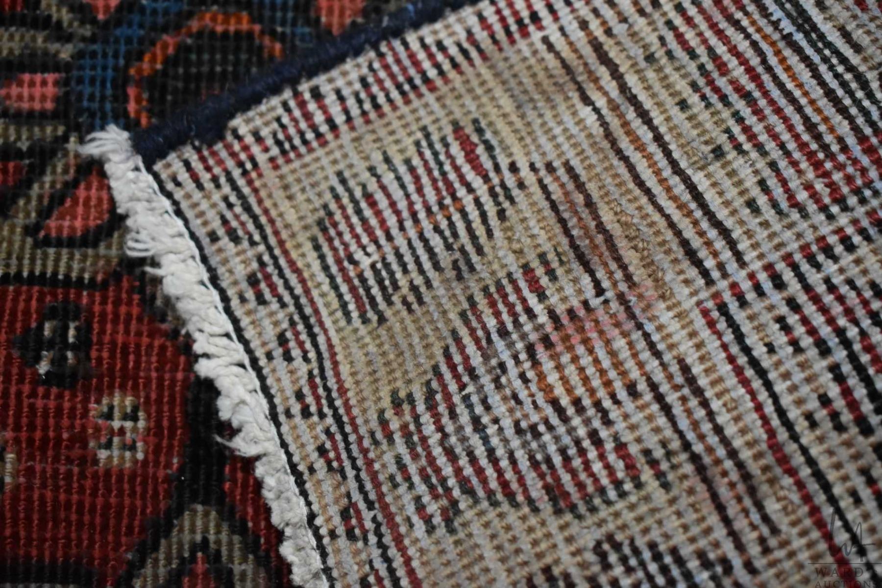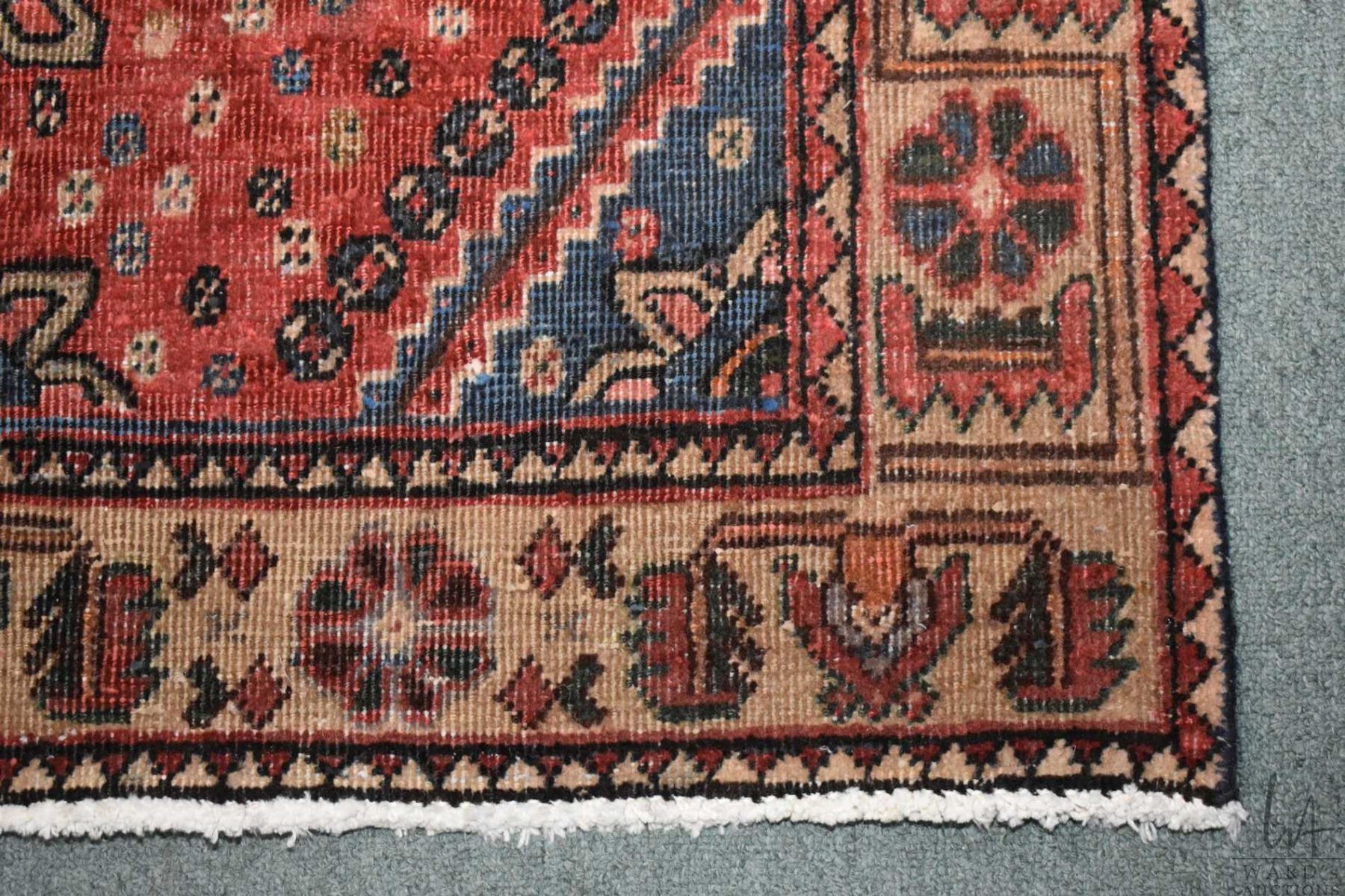 100% handmade Abadeh throw carpet with center medallion, red background, blue, tan, orange highlight