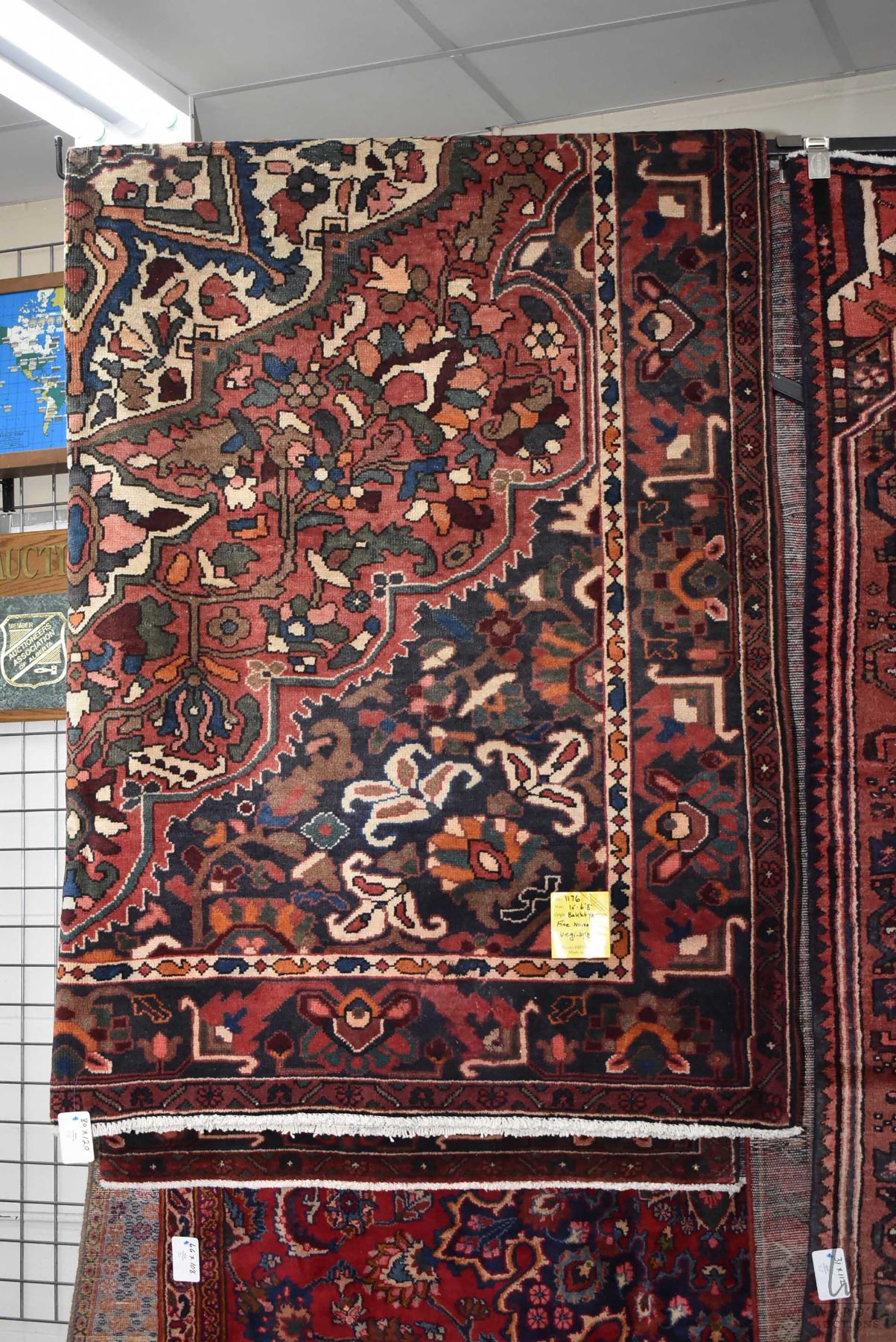 100% handmade Iranian Bakhtyar carpet with center medallion, overall floral design in tones of red, royal blue, teal, taupe etc. 80" X 120"