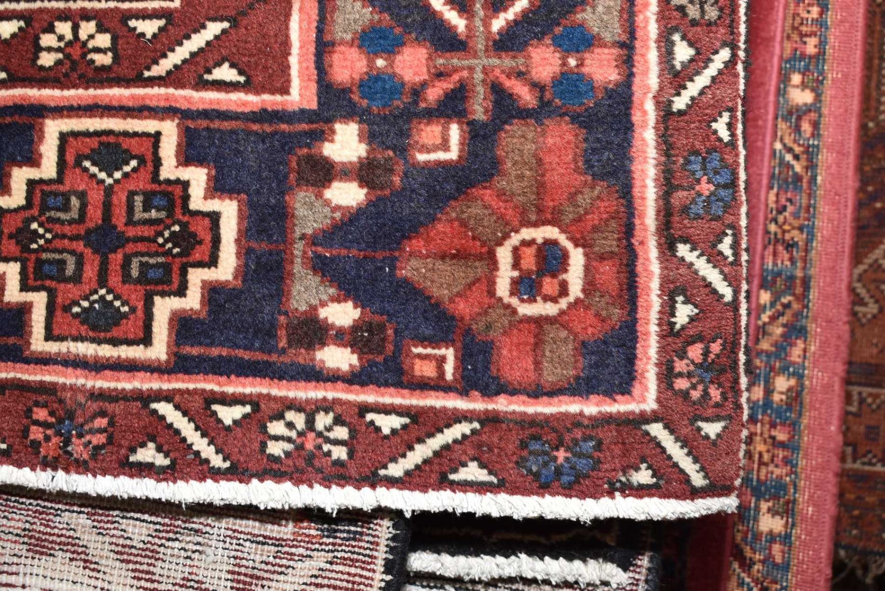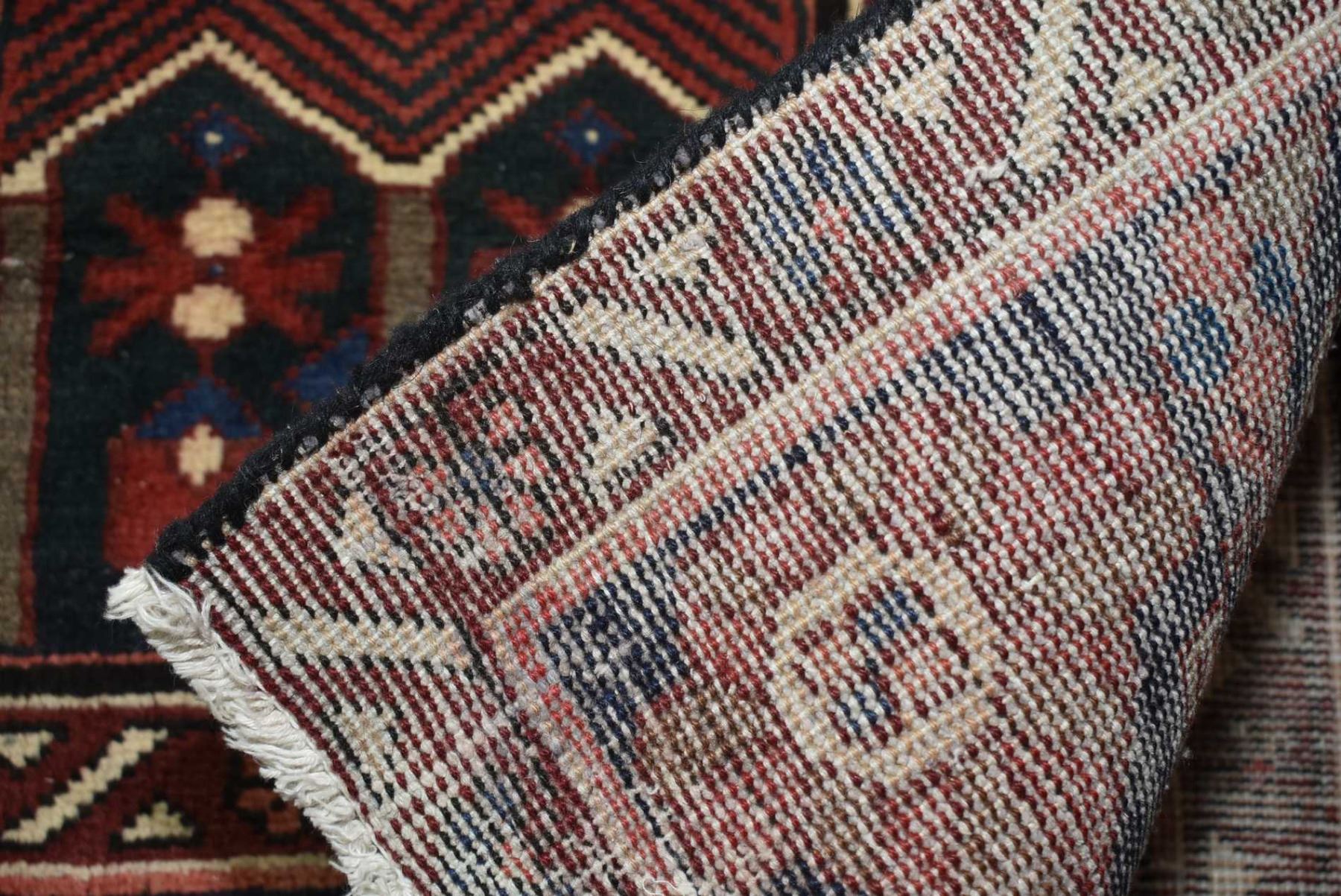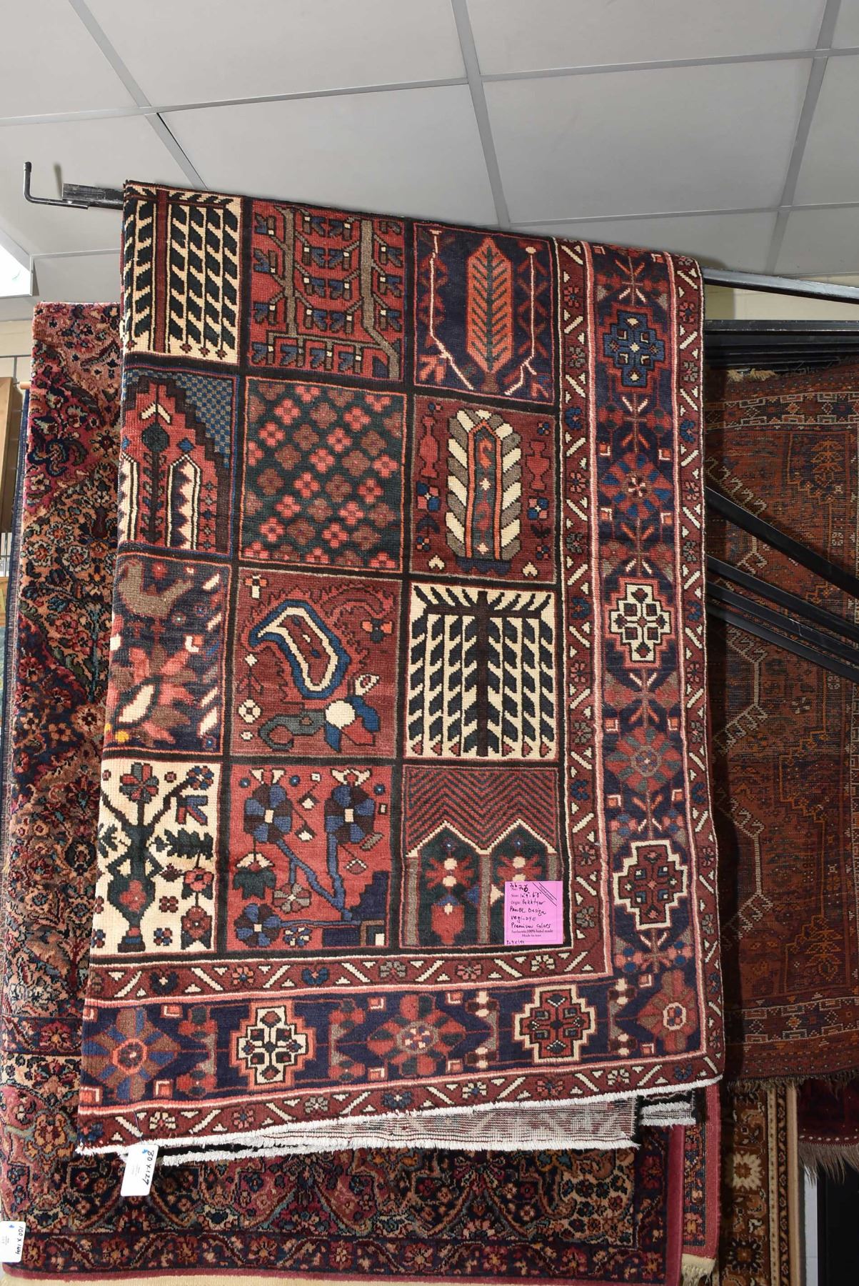 100% handmade Iranian Bakhtyar wool carpet in tile design with multiple borders in shades of reds, blues, cream etc. 80" X 129"