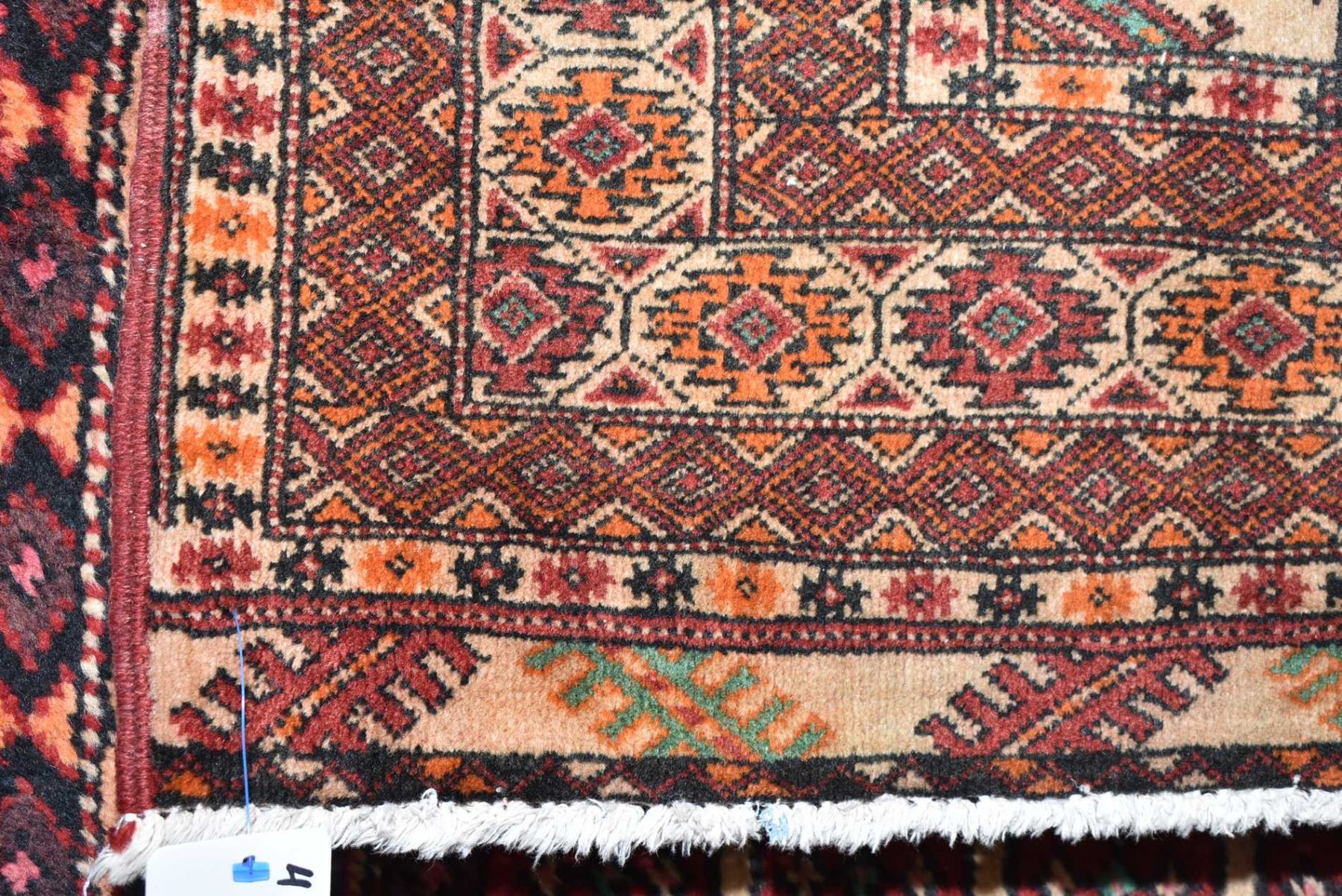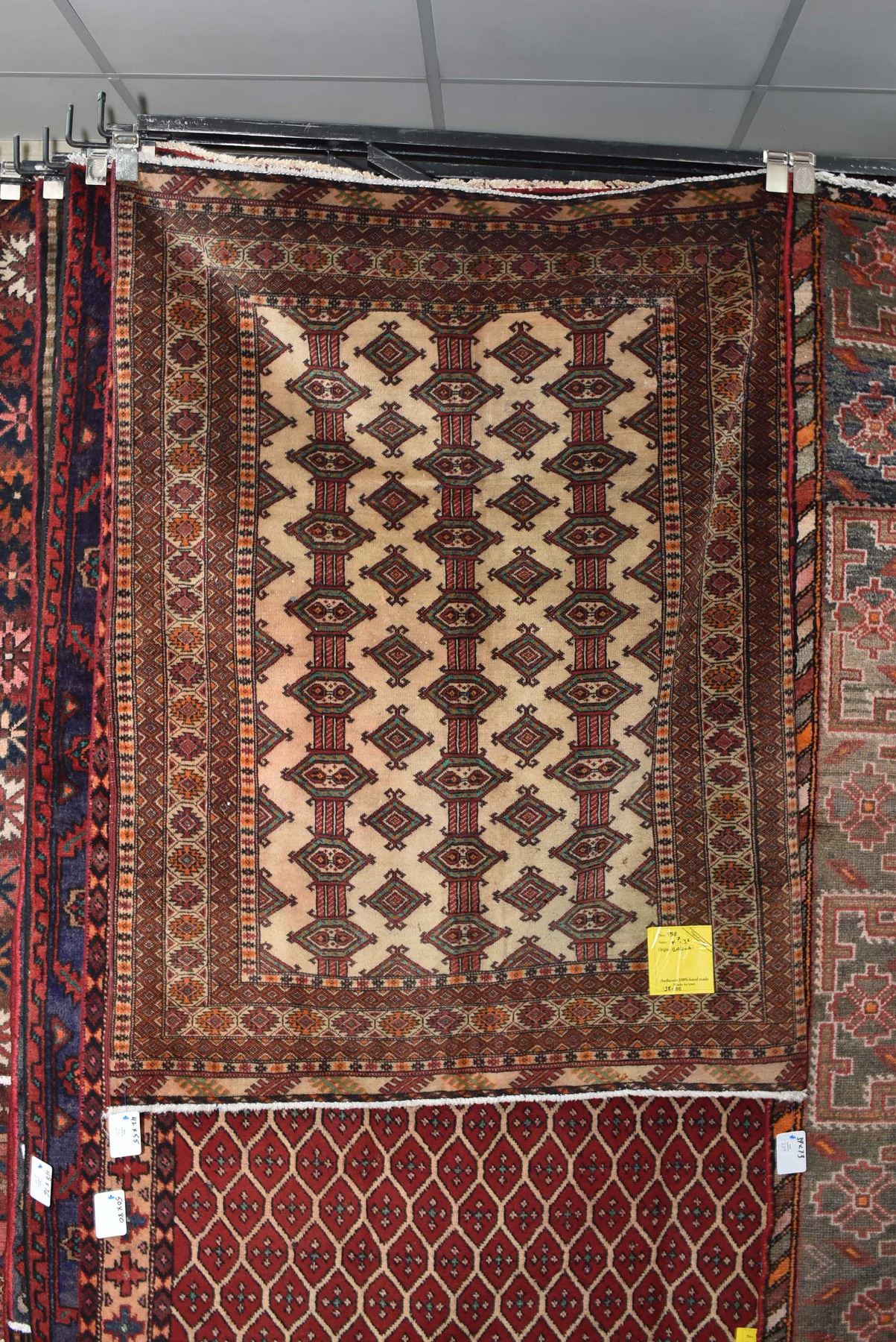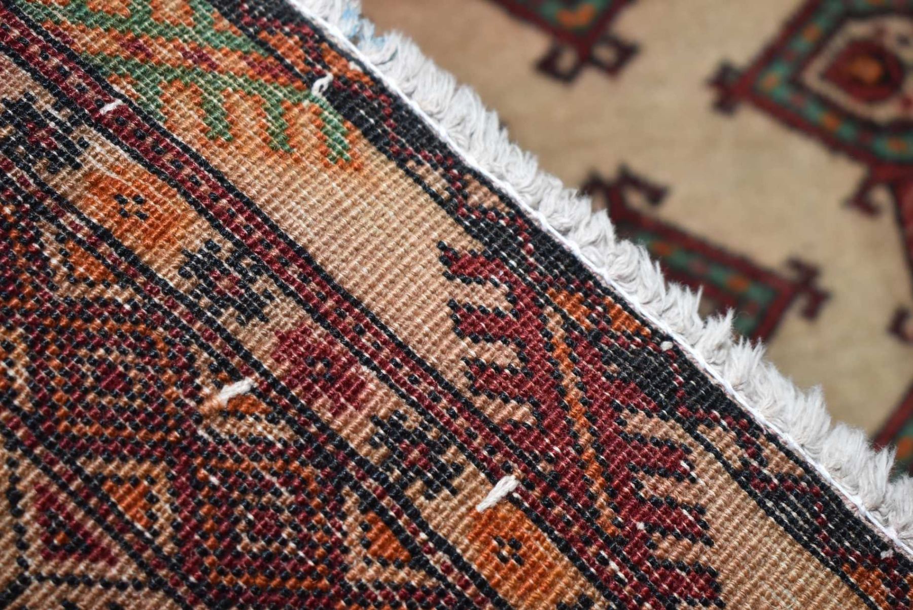 100% handmade Iranian Balochi area carpet with overall geometric design, multiple border in shades of sand, orange, green etc. 42" X 55"