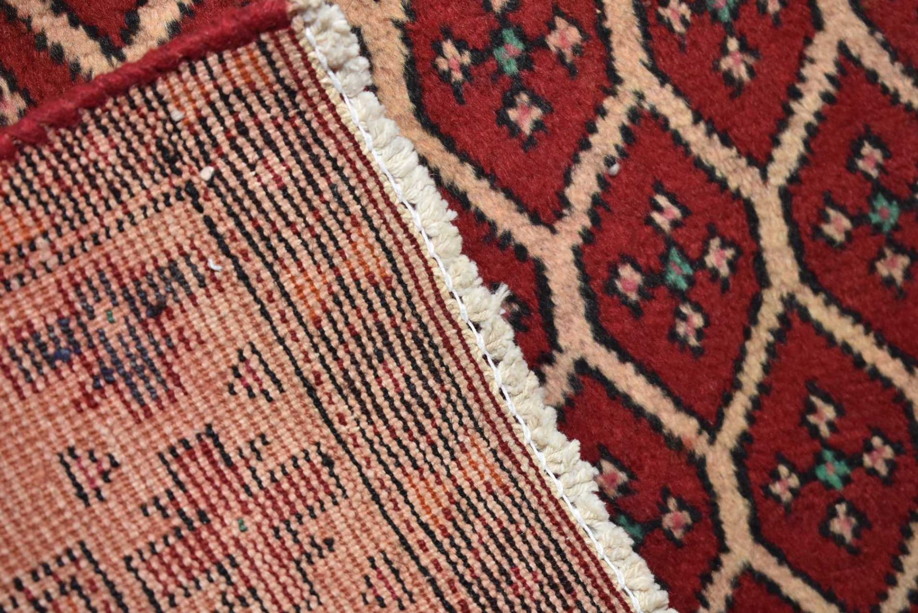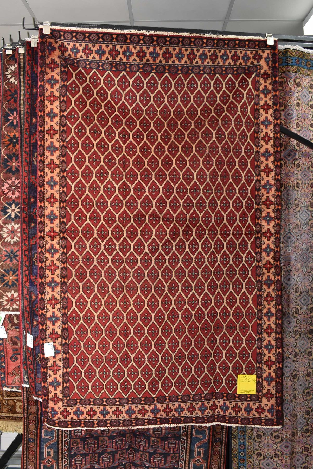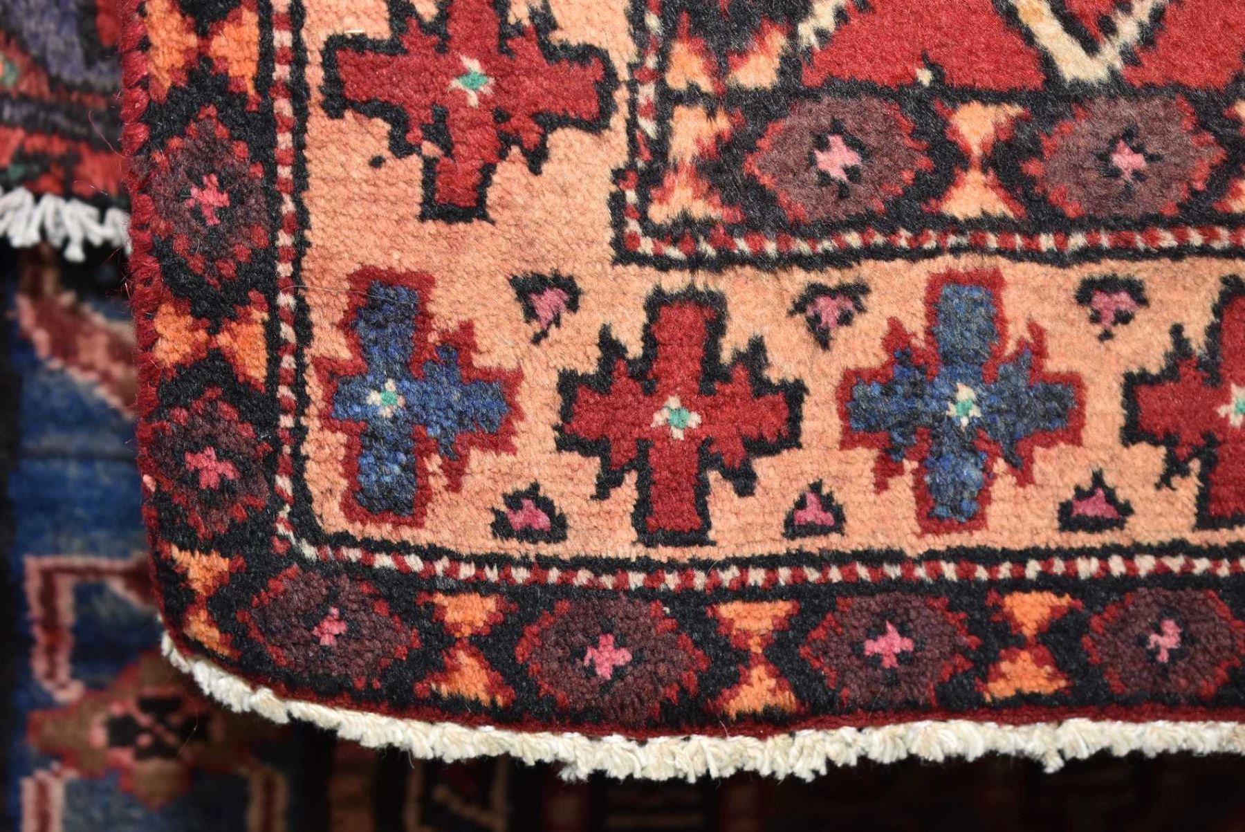 100% handmade Iranian Feroos area carpet with overall geometric design, triple border with red background and highlights of blue, orange, taupe etc. 50" x 80"