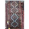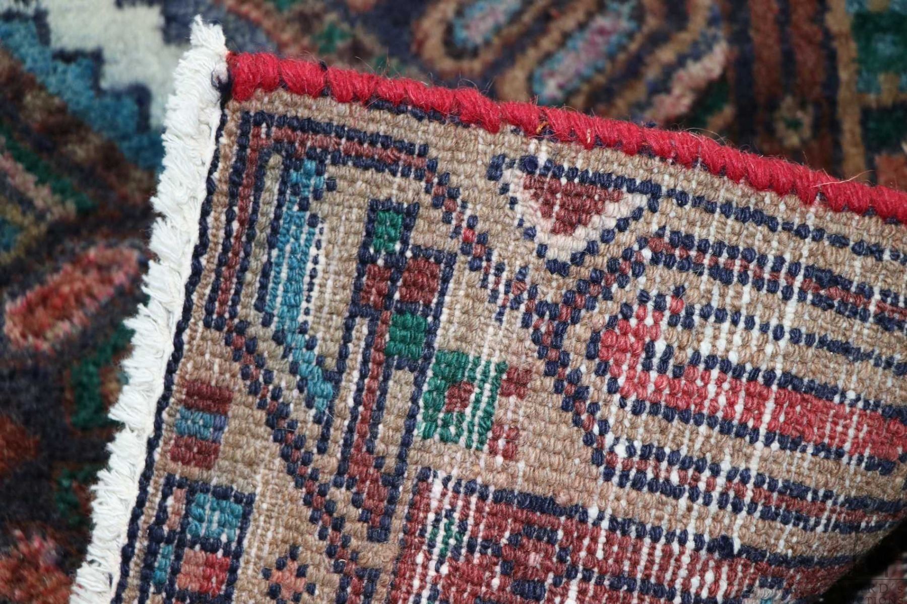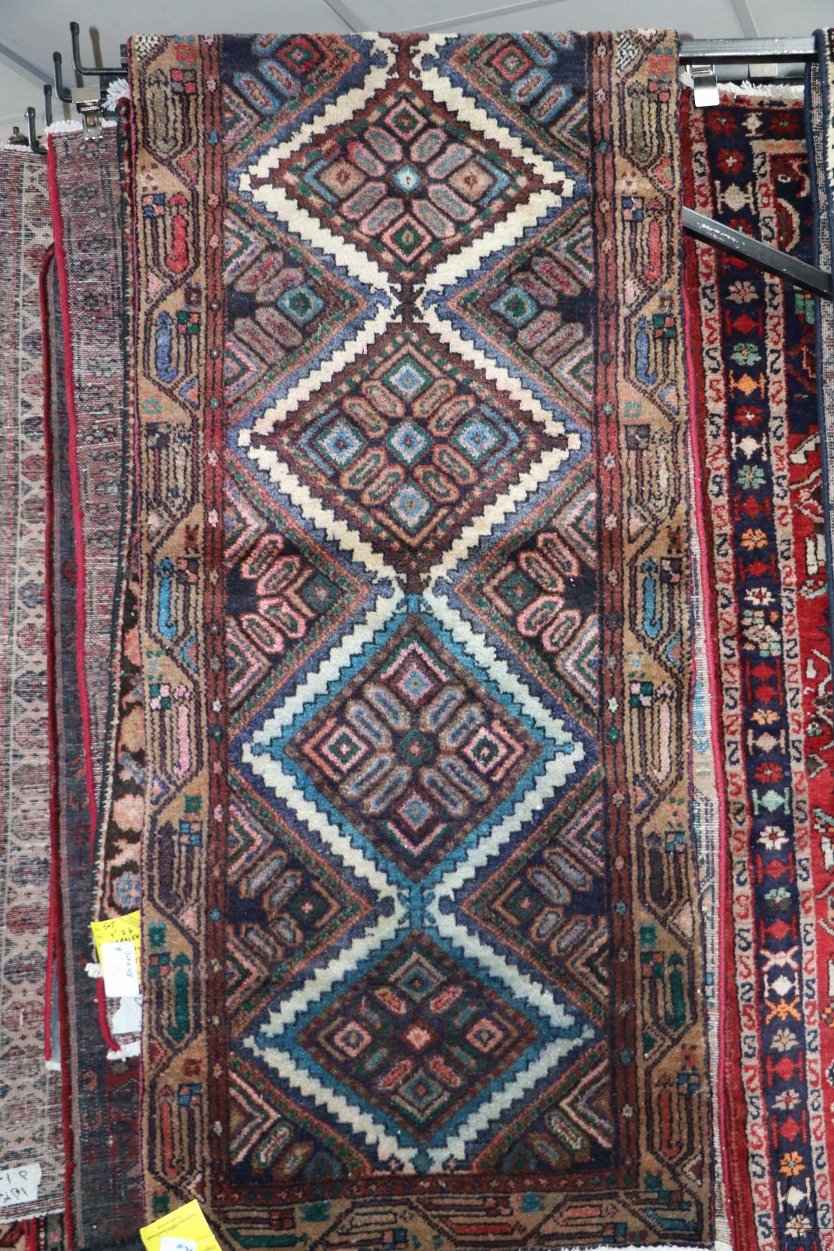 100% handmade Iranian Hamden wool carpet runner with overall geometric design and highlights of blue, green, taupe etc. 29" X 128"
