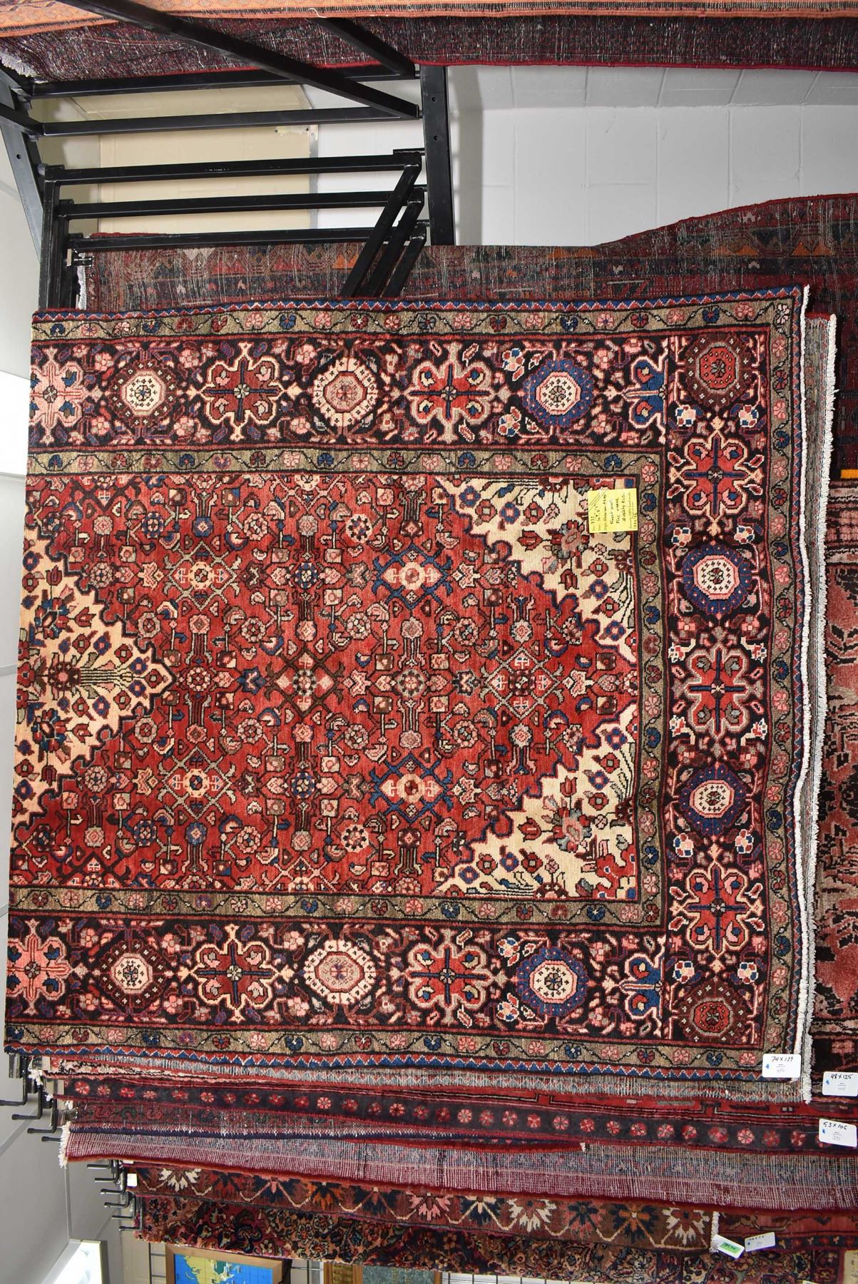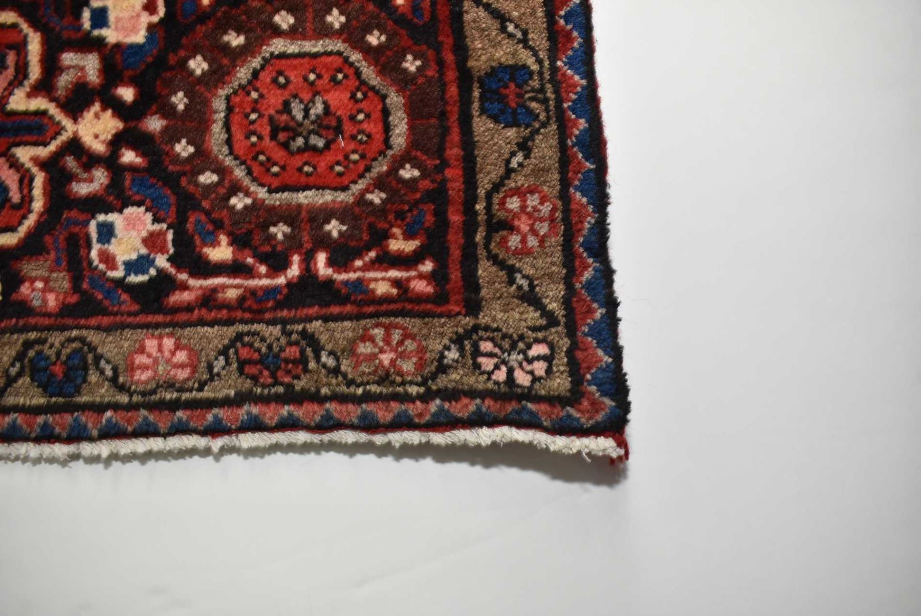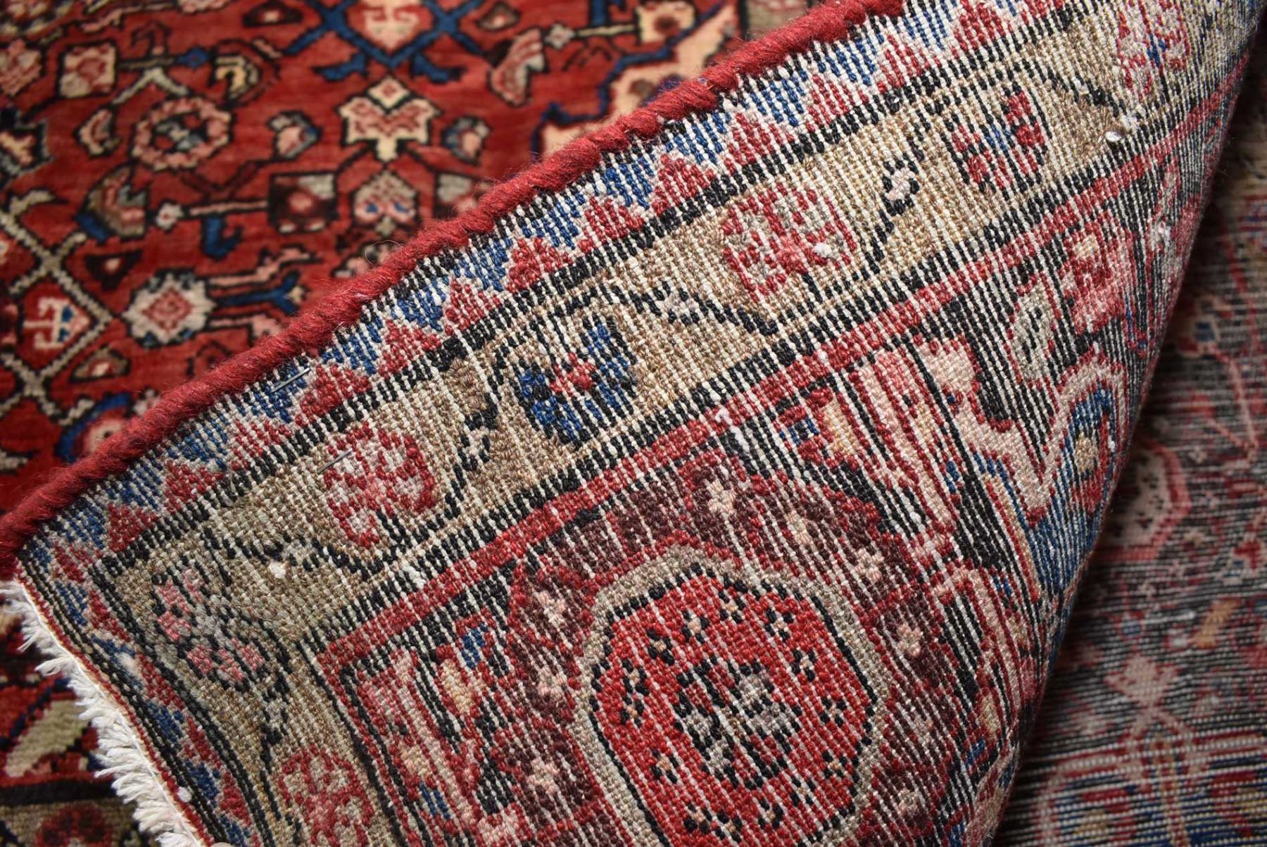 100% handmade Iranian Hossien Abad area carpet with center medallion and highlights of red, cream, blues, taupe etc. 74" X 129"