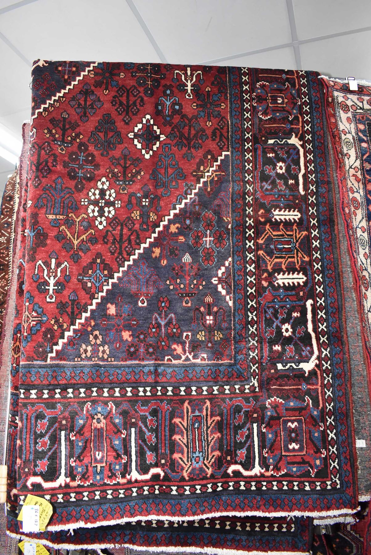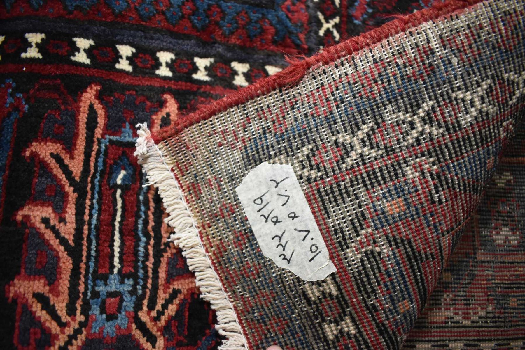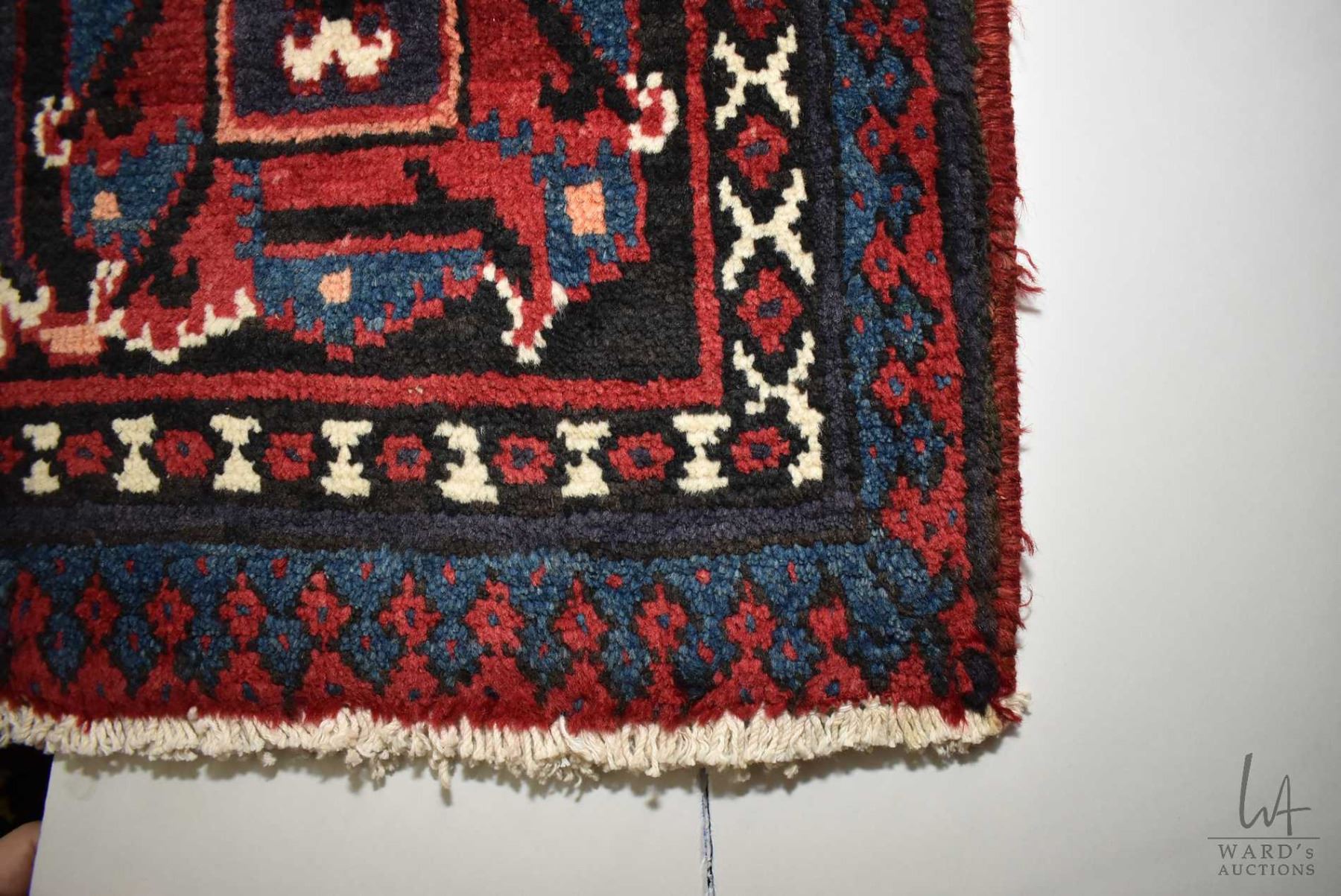 100% handmade Iranian Joshegan carpet with center medallion, red background, stylized florals and multiple borders with highlights of black, cream, blue etc. 86" X 127"