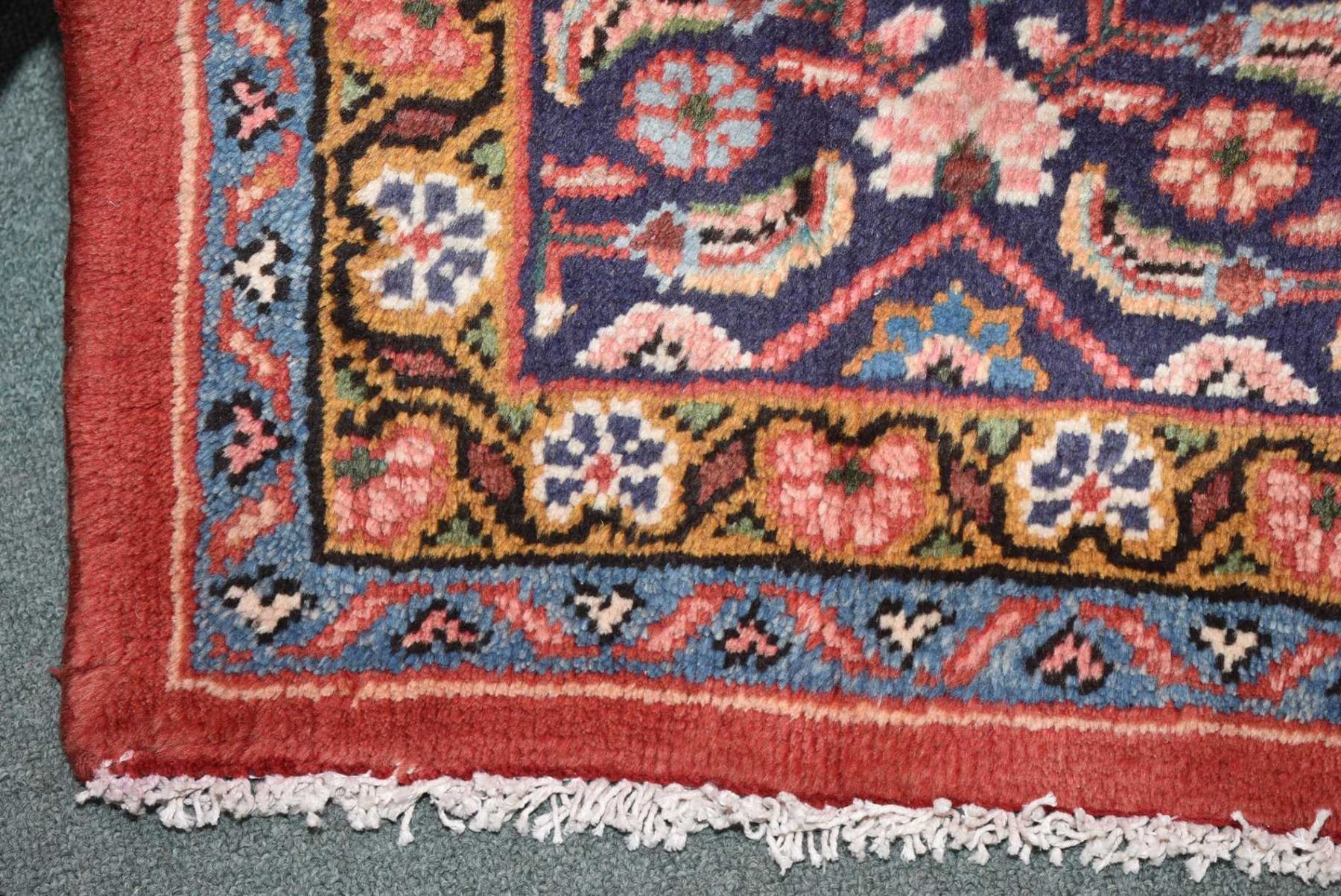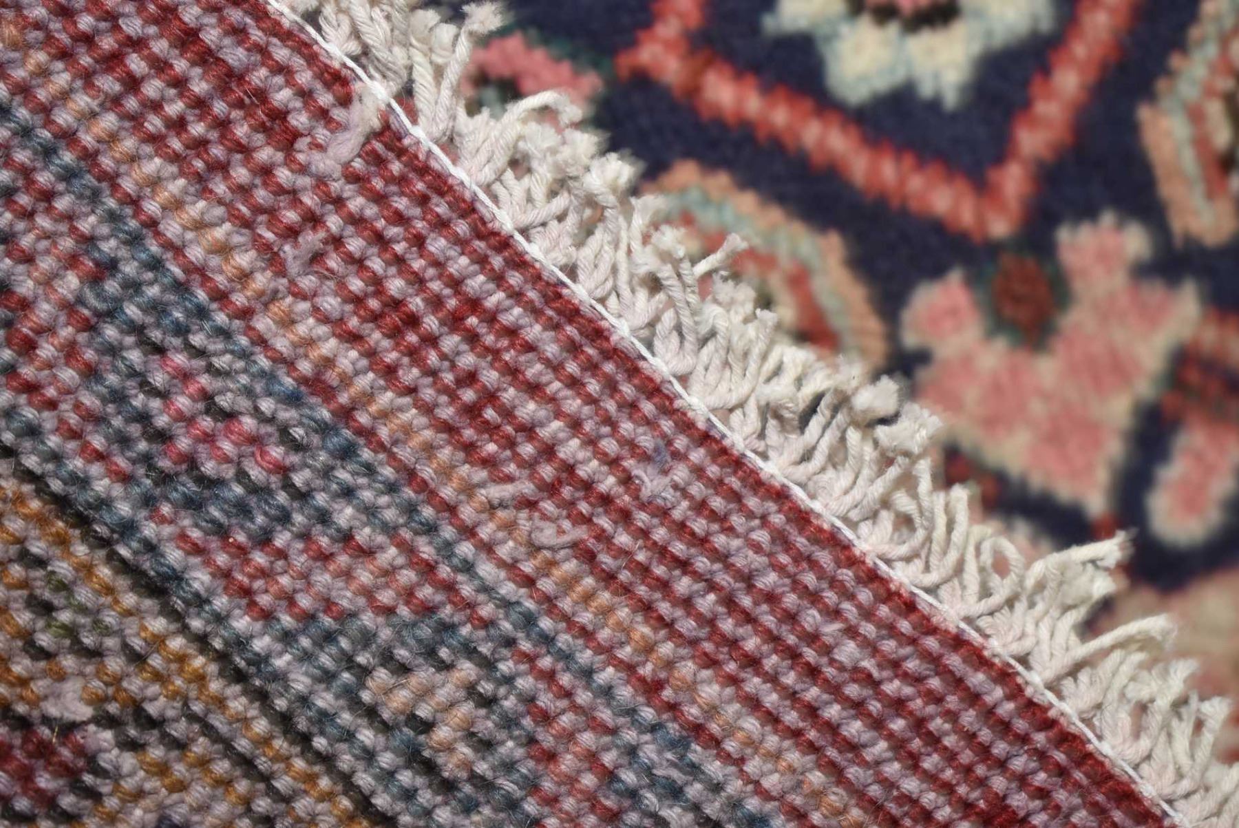 100% handmade Iranian Mahal area carpet with center medallion and tones of red, cream, blues, purple