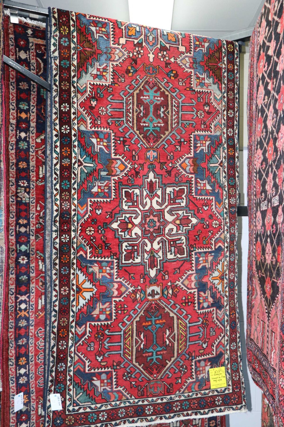 100% handmade Iranian Qarajeh wool carpet runner with multiple medallions and red background plus highlights of orange, green and blue etc. 38" X 144"