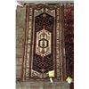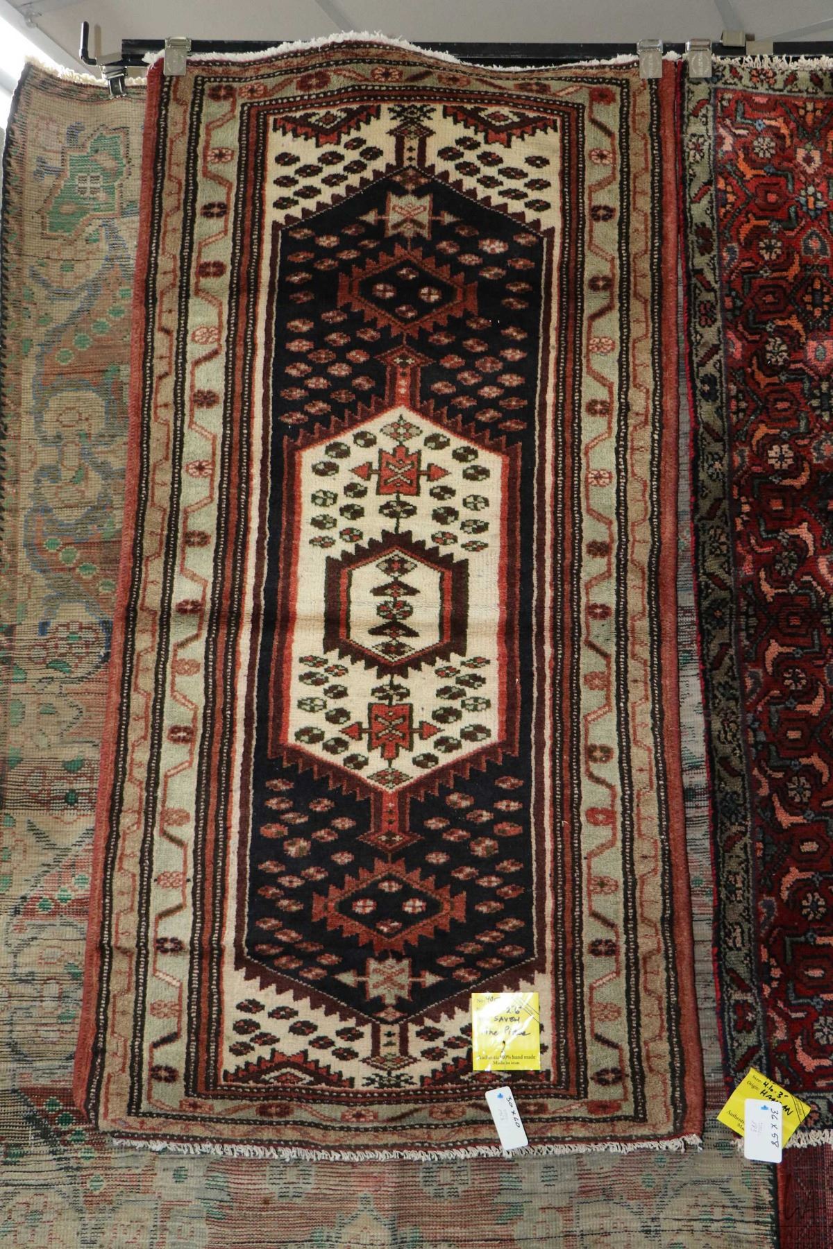 100% handmade Iranian Sabeh throw rug, with center medallion, deep blue background, multiple borders and highlights of cream, brown and taupe, 30" X 60"