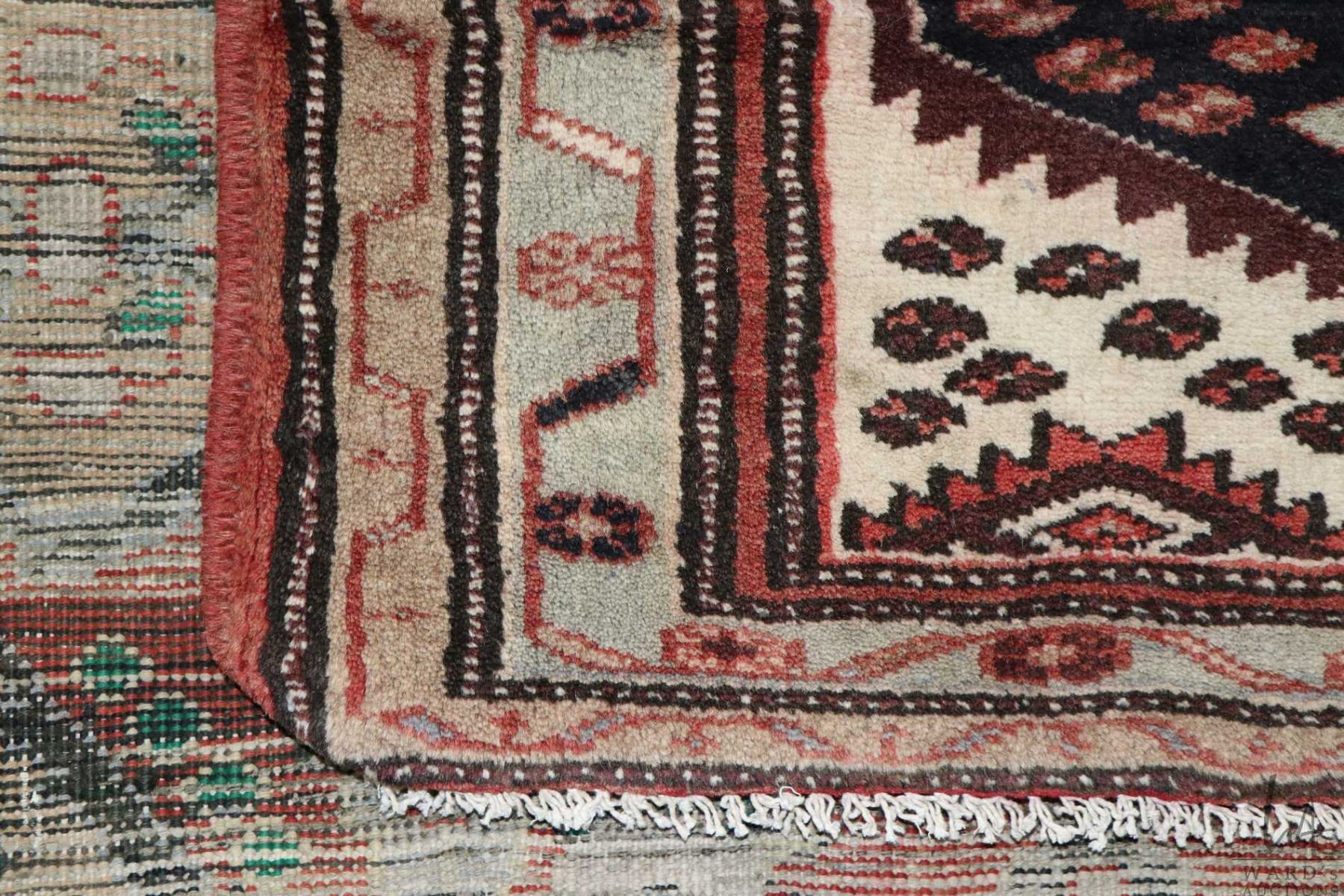 100% handmade Iranian Sabeh throw rug, with center medallion, deep blue background, multiple borders
