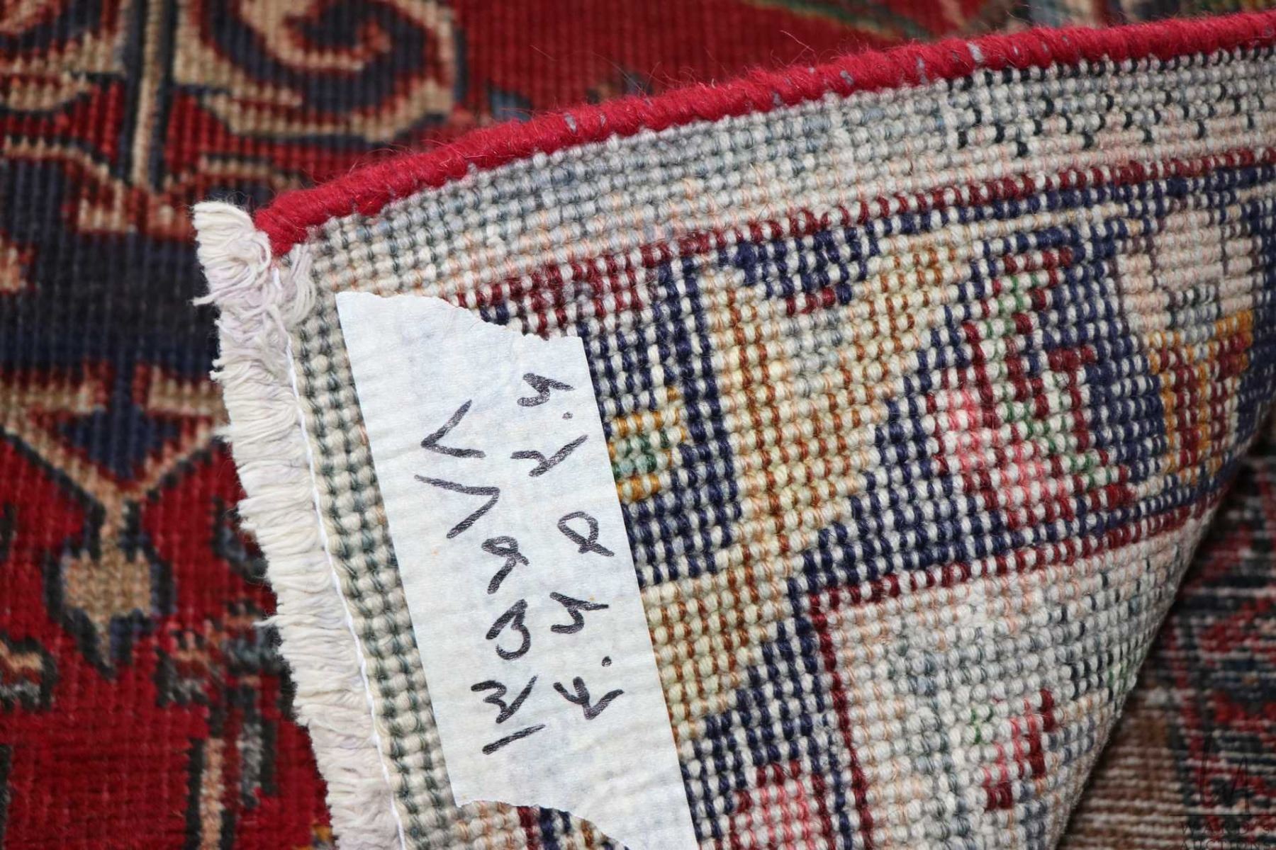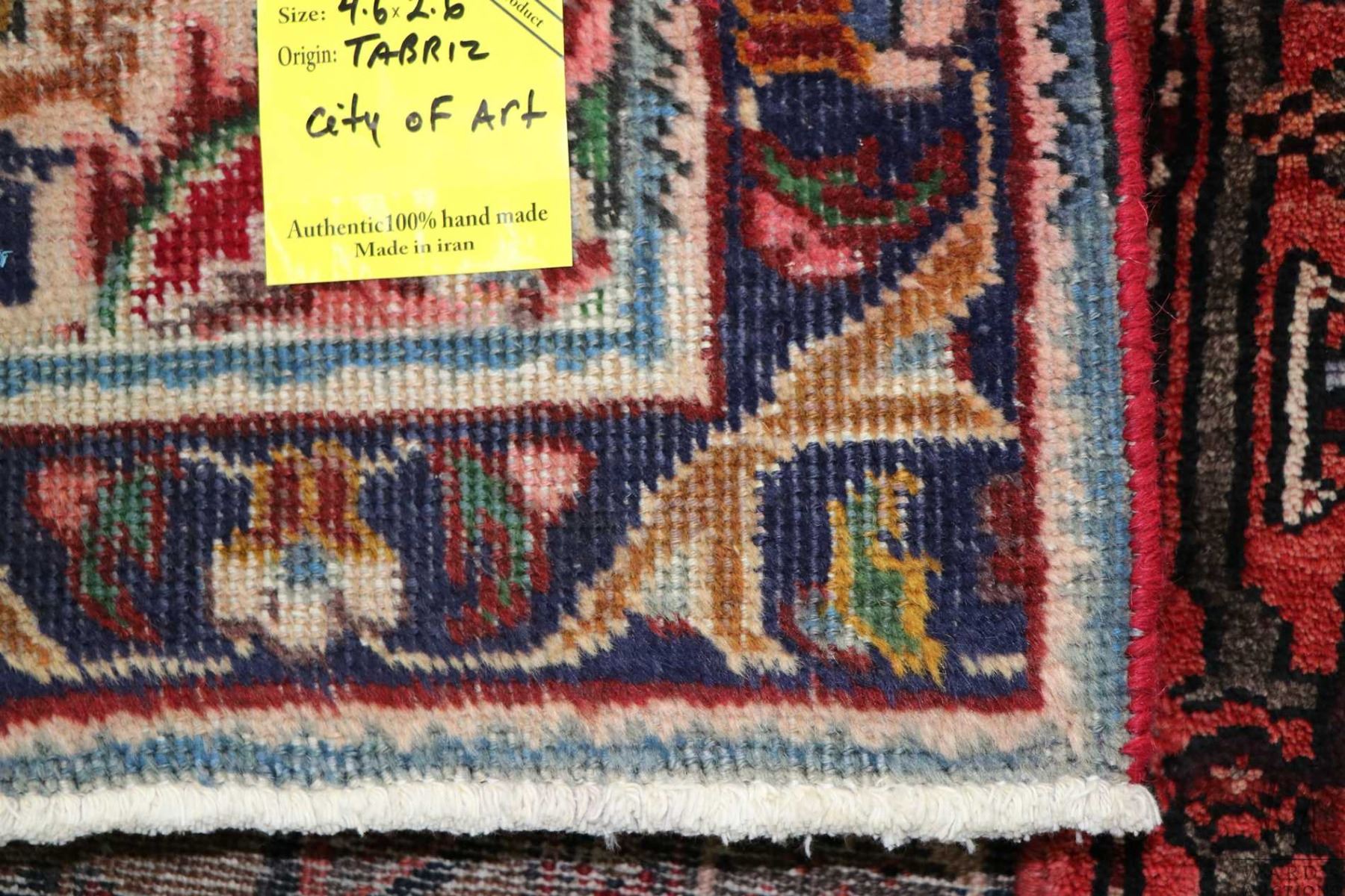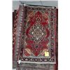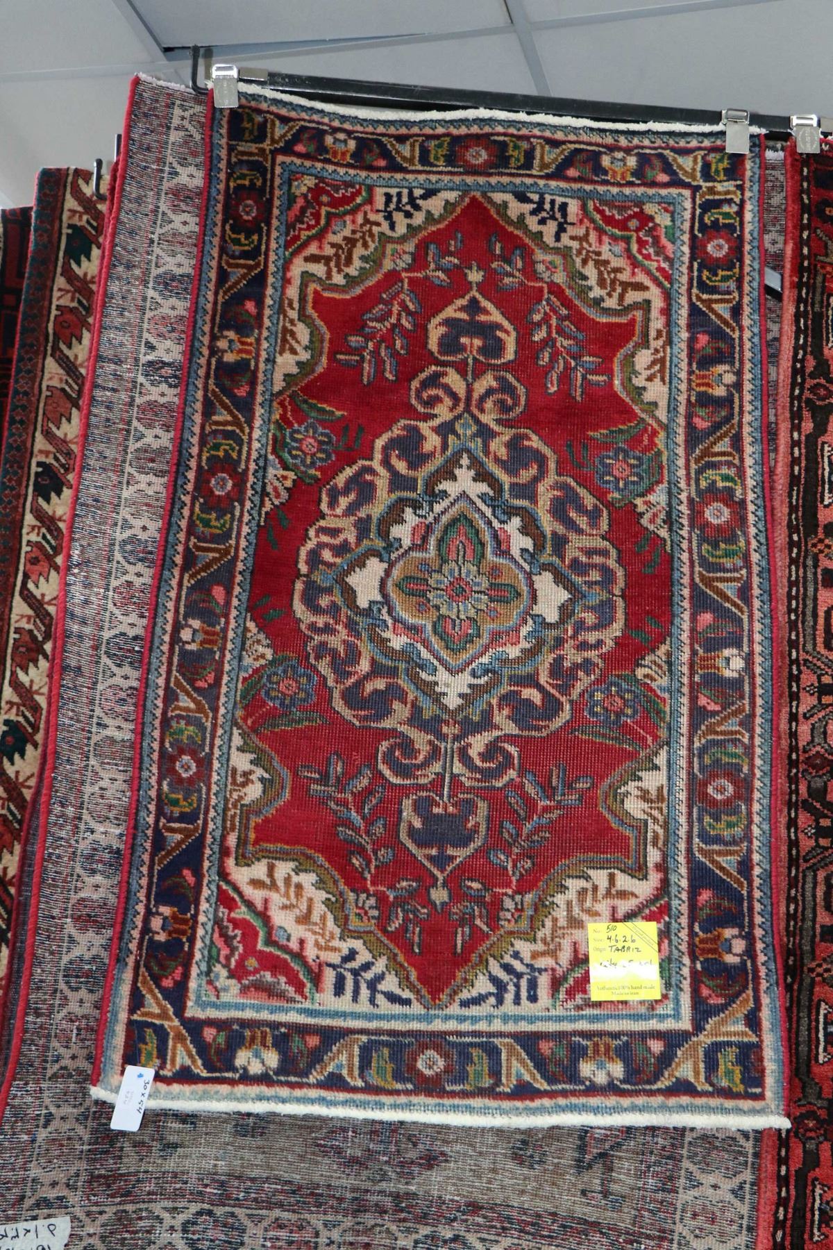 100% handmade Iranian Tabriz wool throw rug with center medallion, floral design, red background and highlights of blues, cream, green etc. 30" X 54"