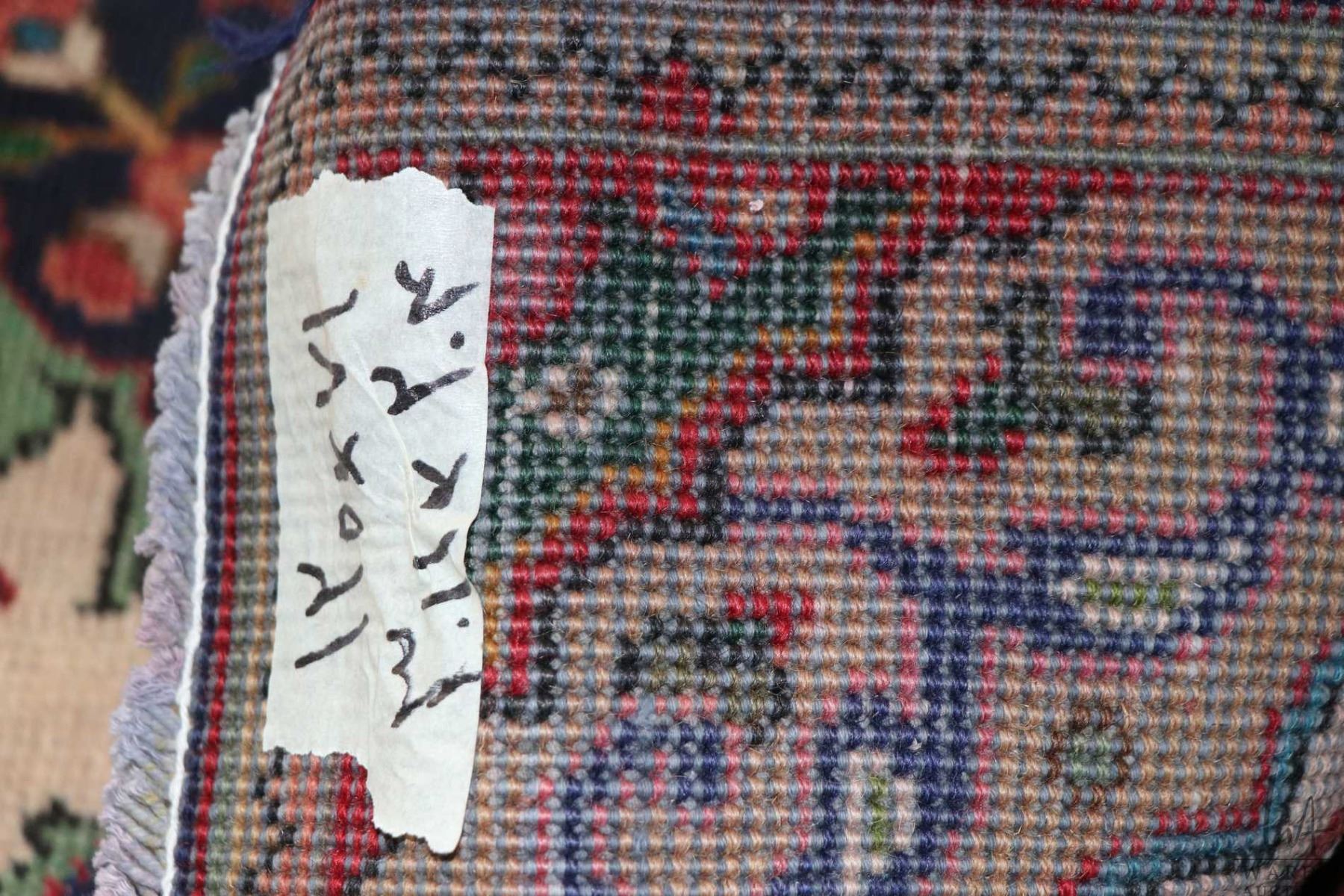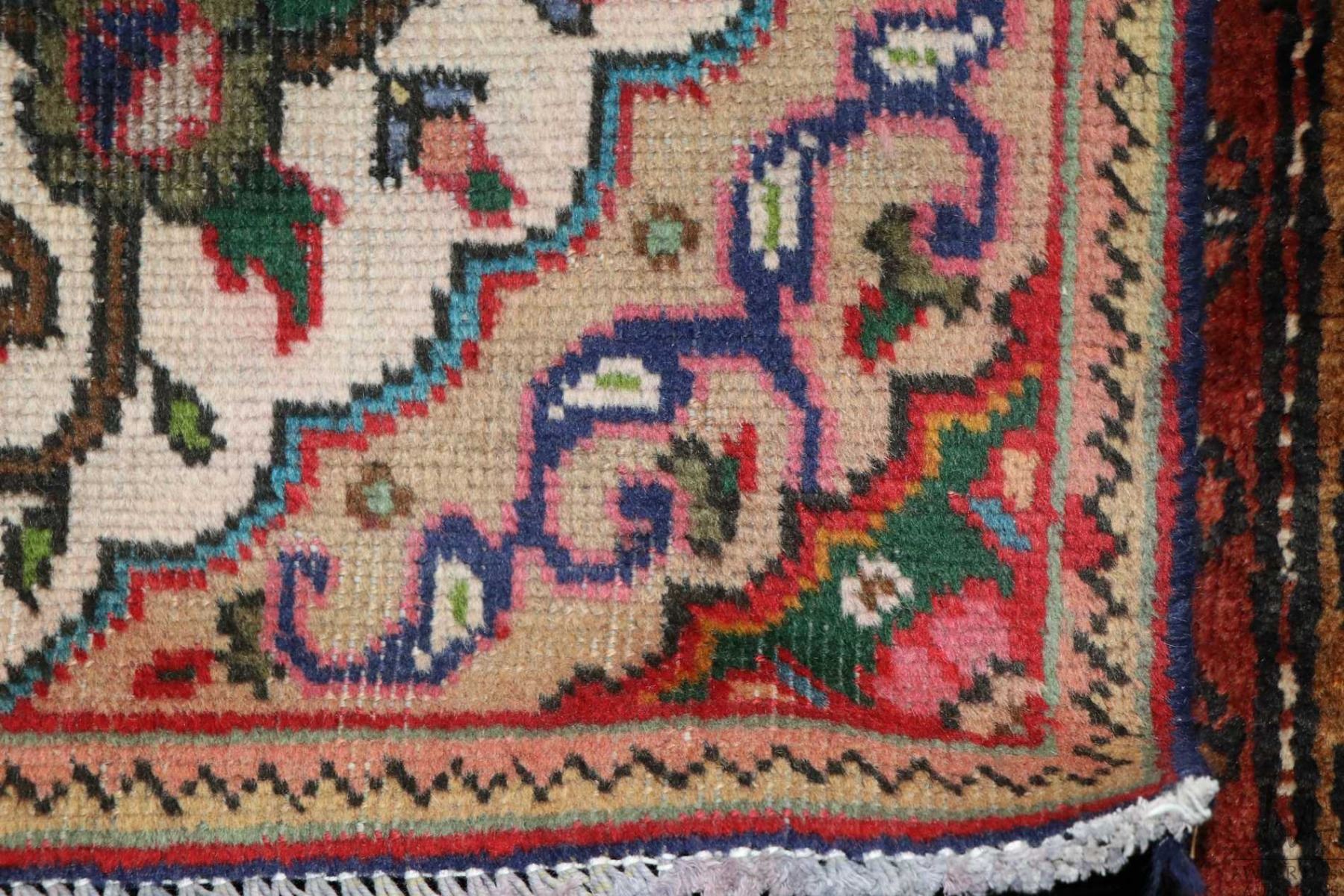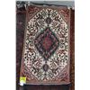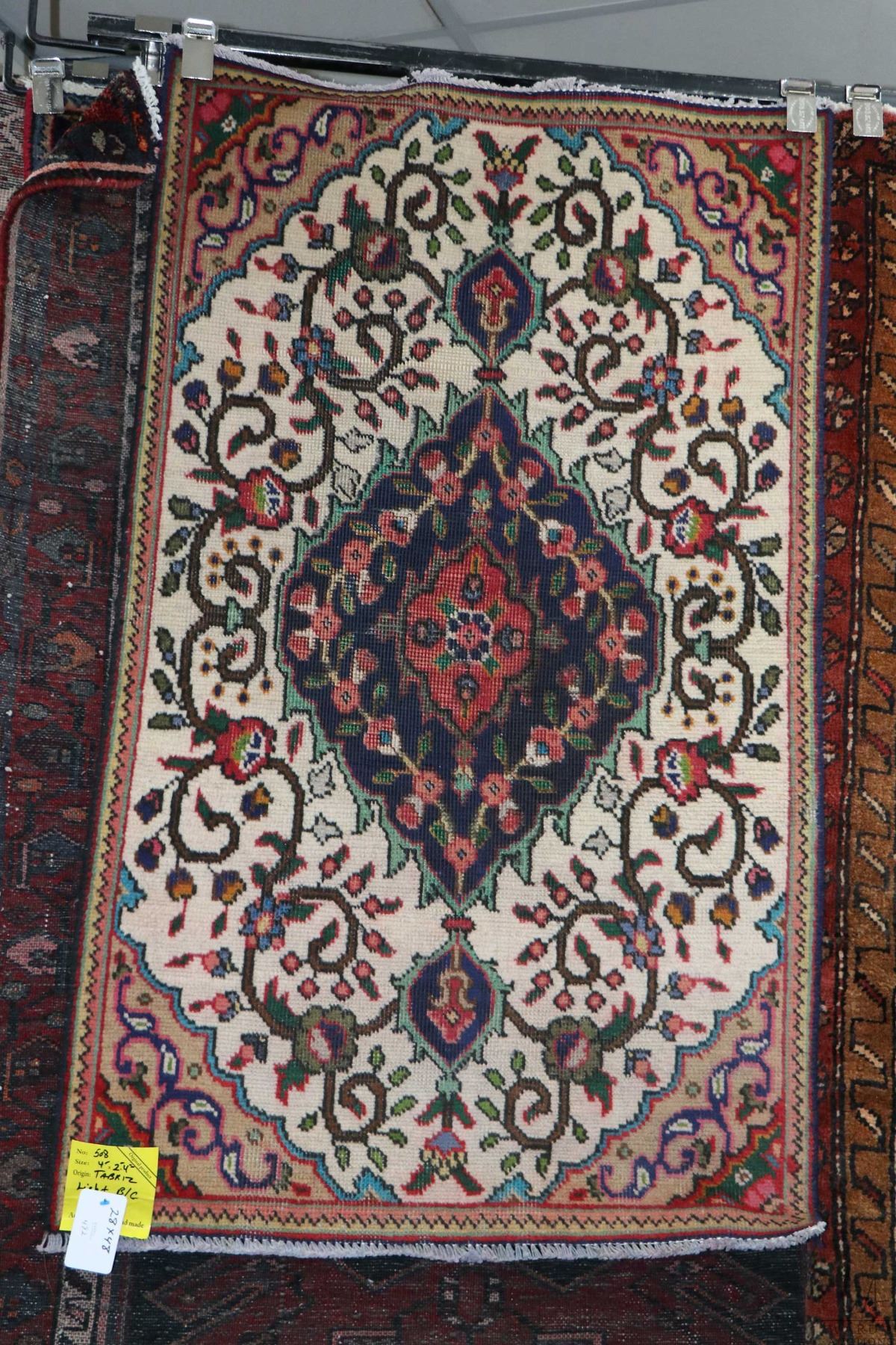 100% handmade Iranian Tabriz wool throw rug with center medallion, overall floral design on cream background and highlights of blue, taupe, green etc. 28" X 48"
