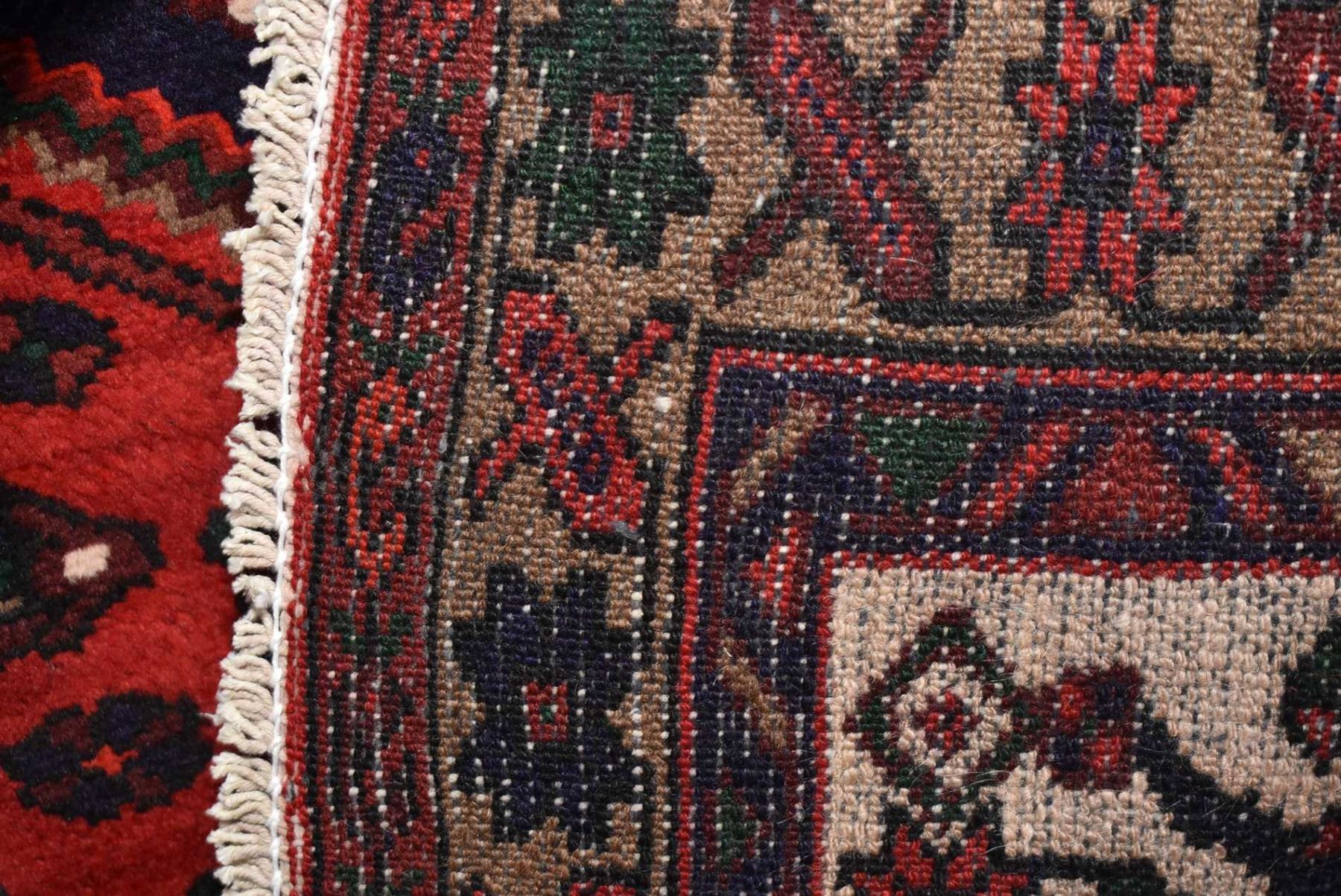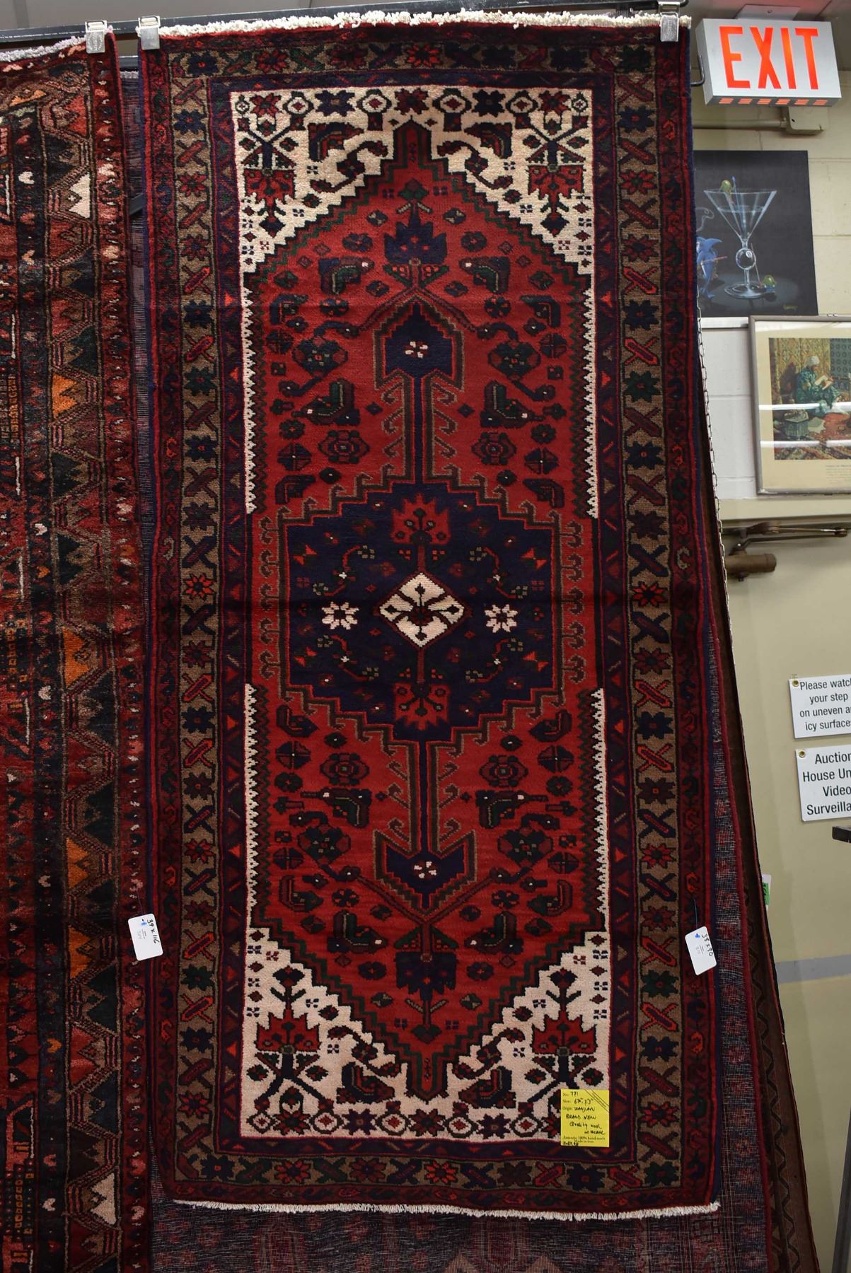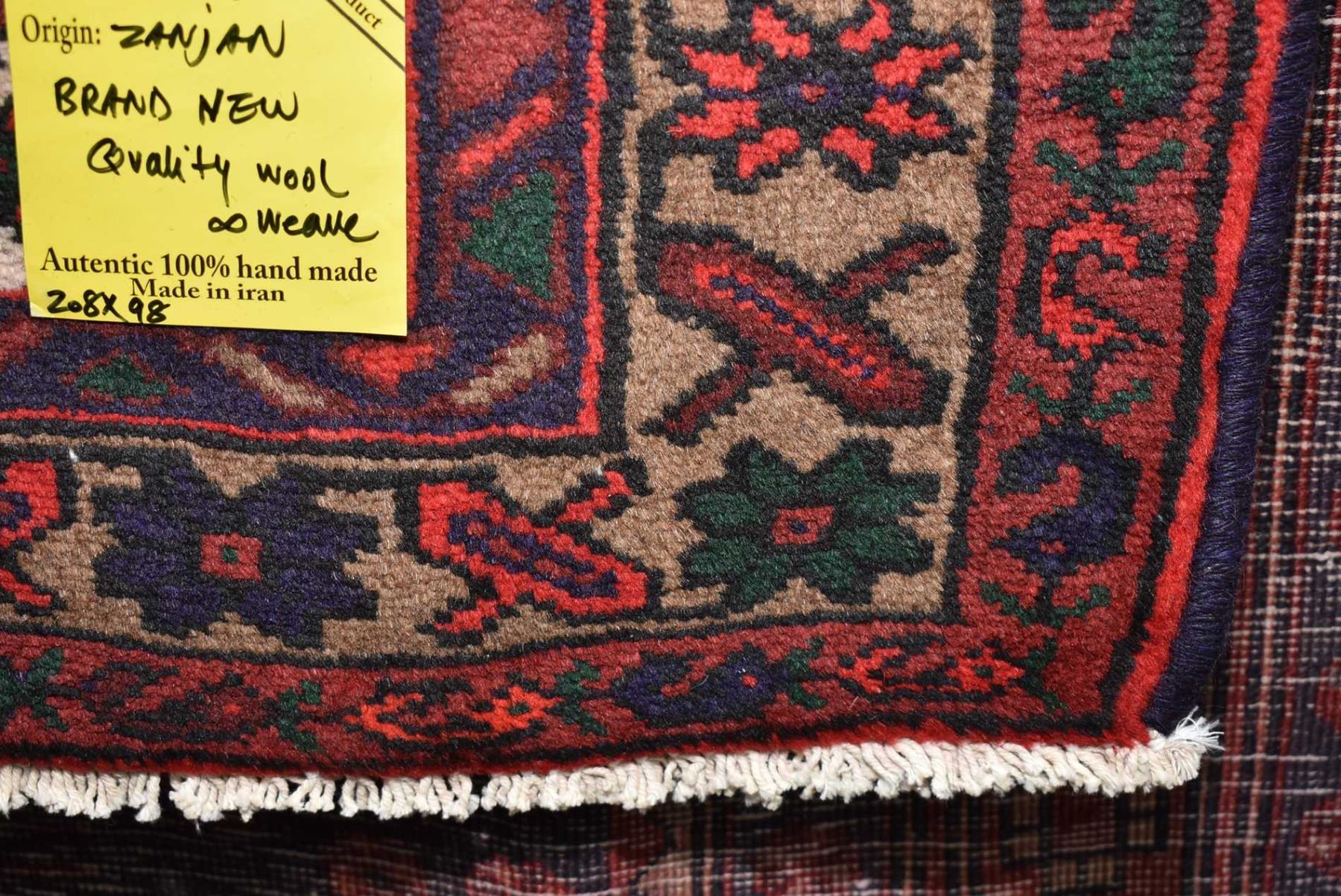 100% handmade Iranian Zanjan area carpet with center medallion, red background and highlights in blue, cream, green, taupe etc. 38" X 80"