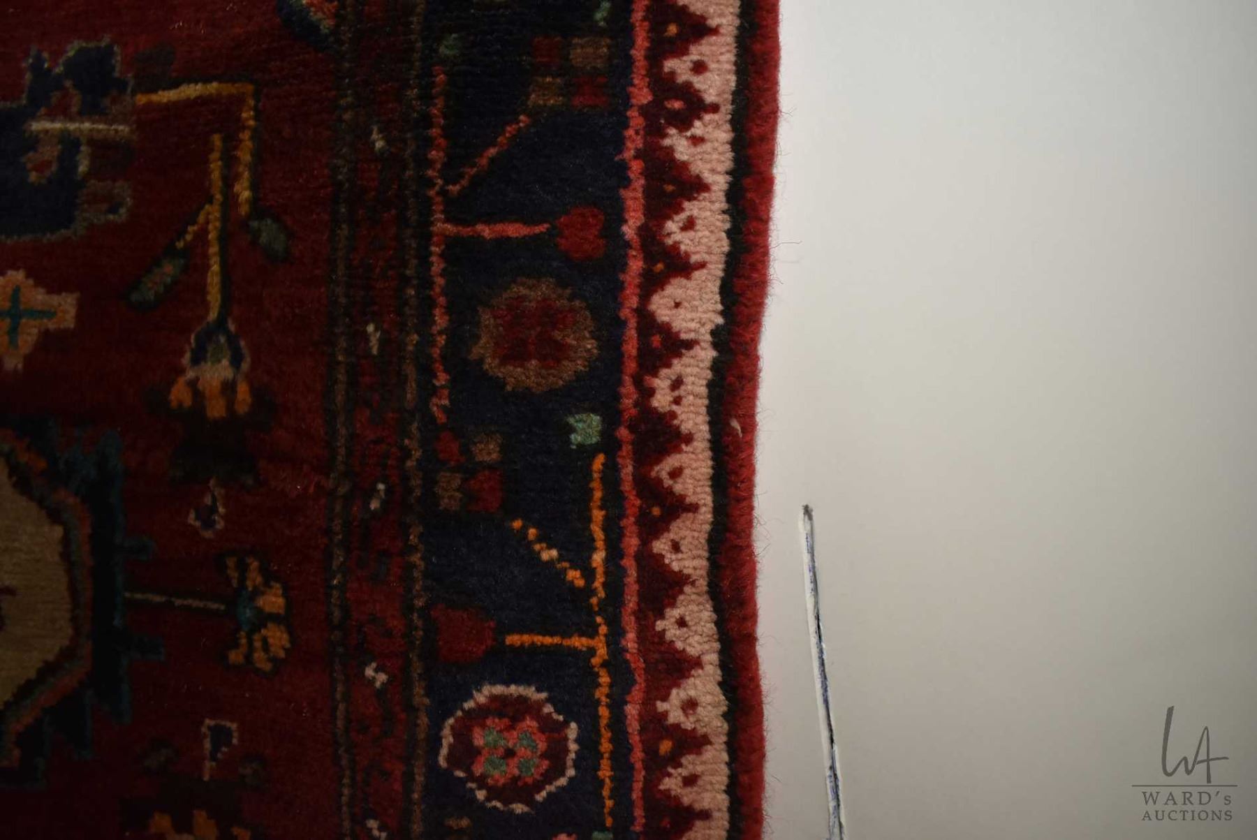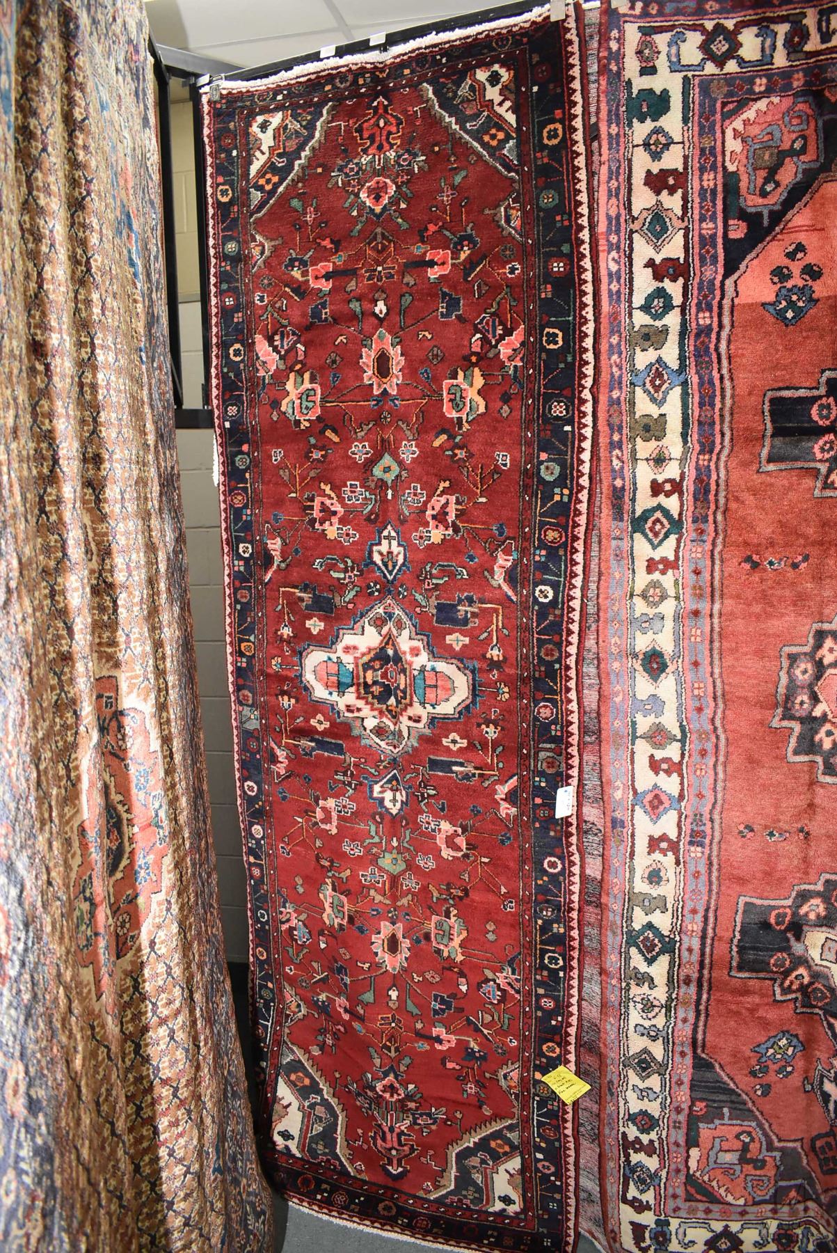100% handmade Iranian Zanjan carpet runner with center medallion, red background, stylized floral pattern and highlights of blues, reds, cream etc. 41" X 120"