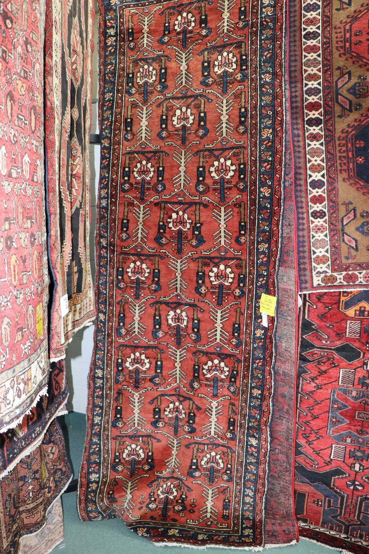 100% handmade Iranian Zanjan carpet runner with overall geometric design on red background and highlights of brown, blue and cream etc. 40" X 121"