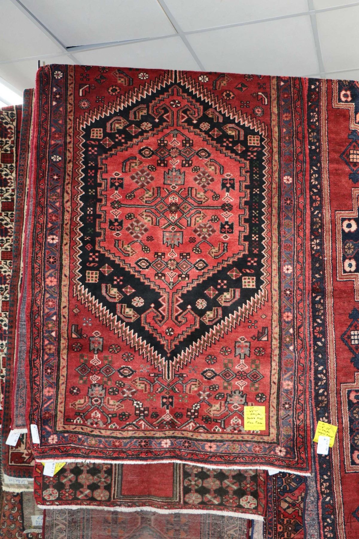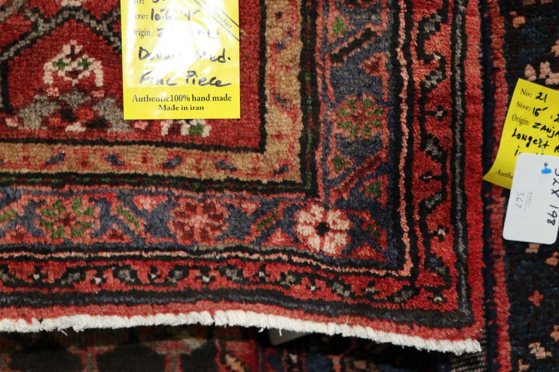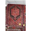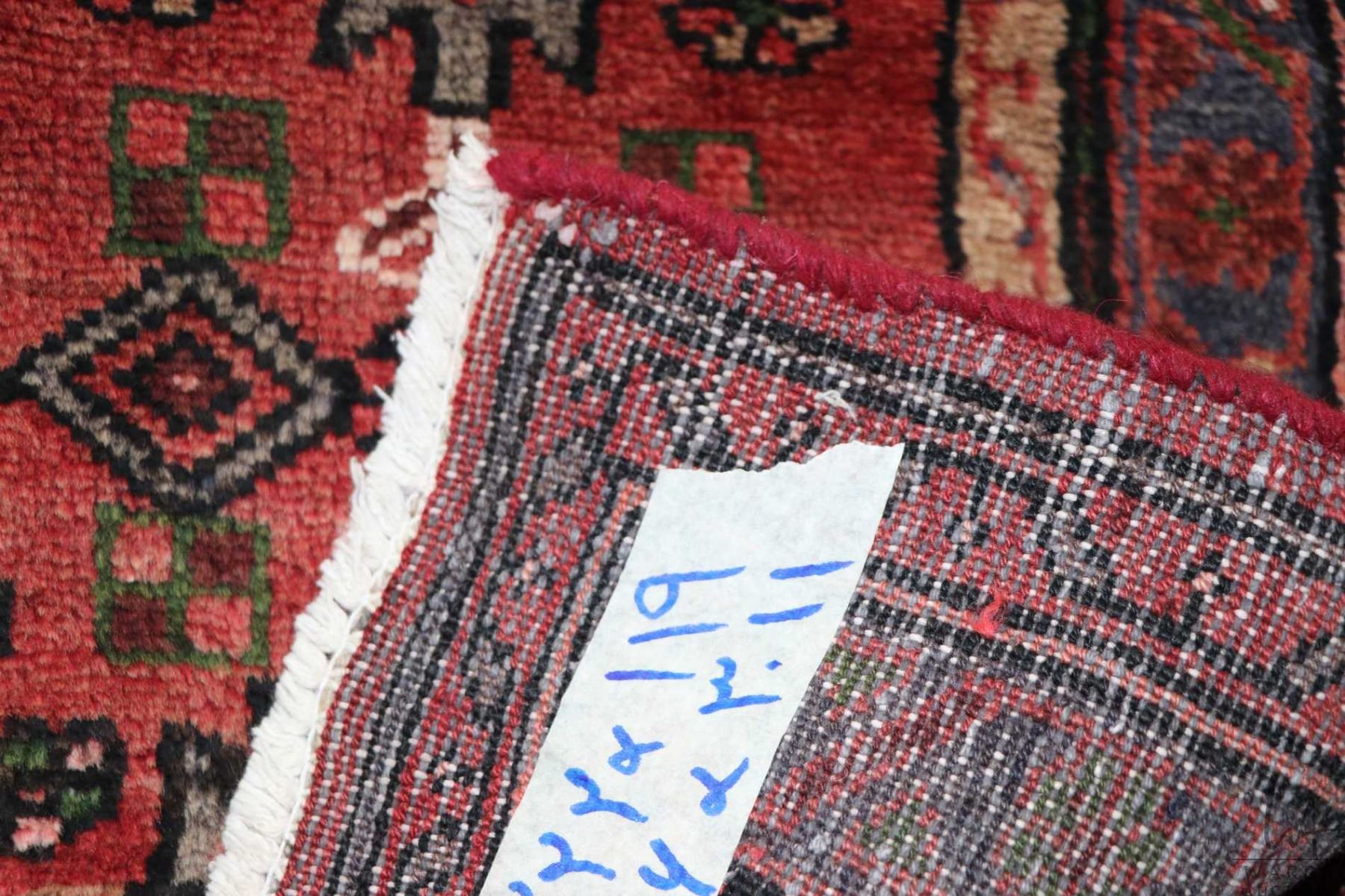 100% handmade Iranian Zanjan carpet runner with red background, double medallions and highlights of blues, black, taupe etc. 48" X 126"