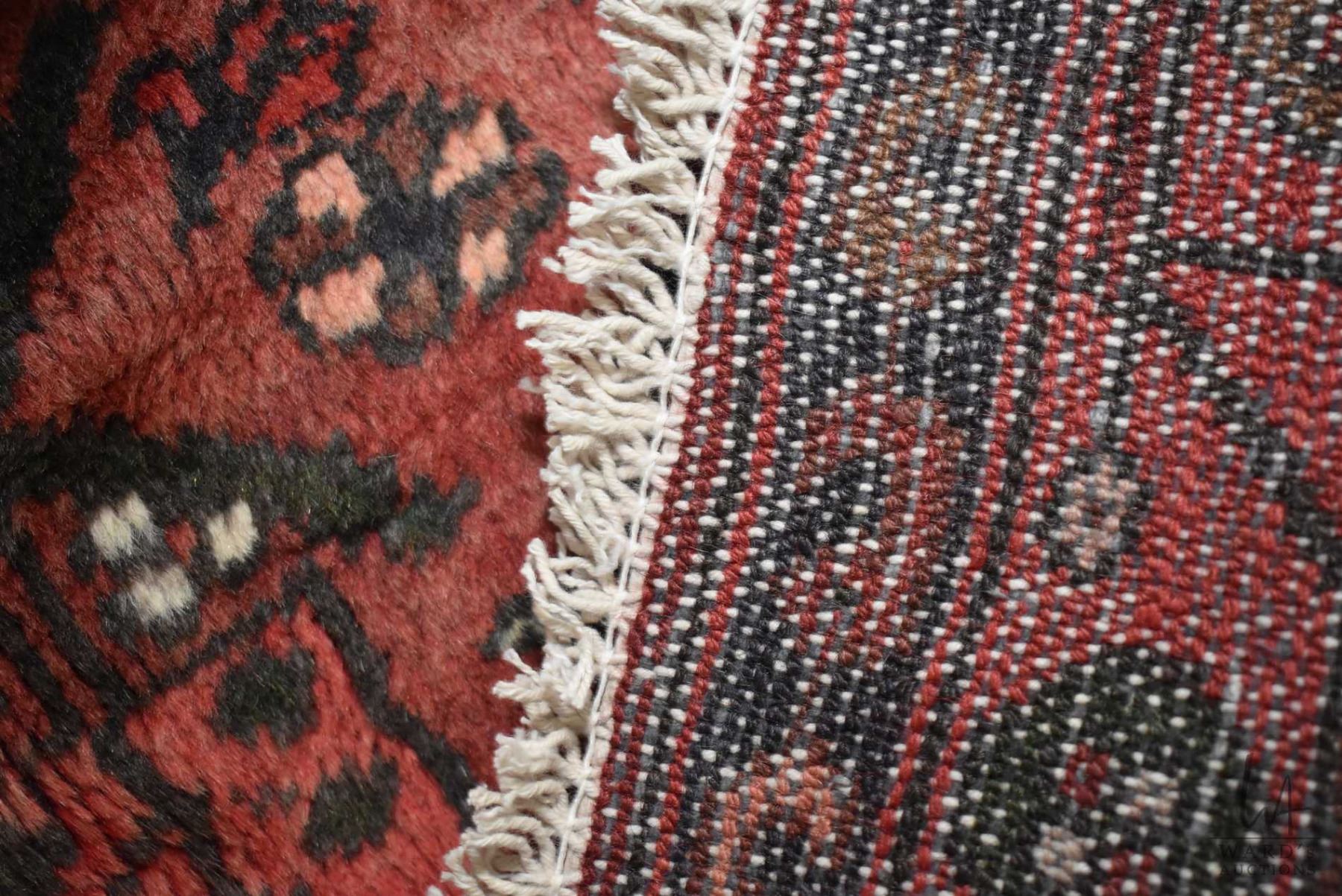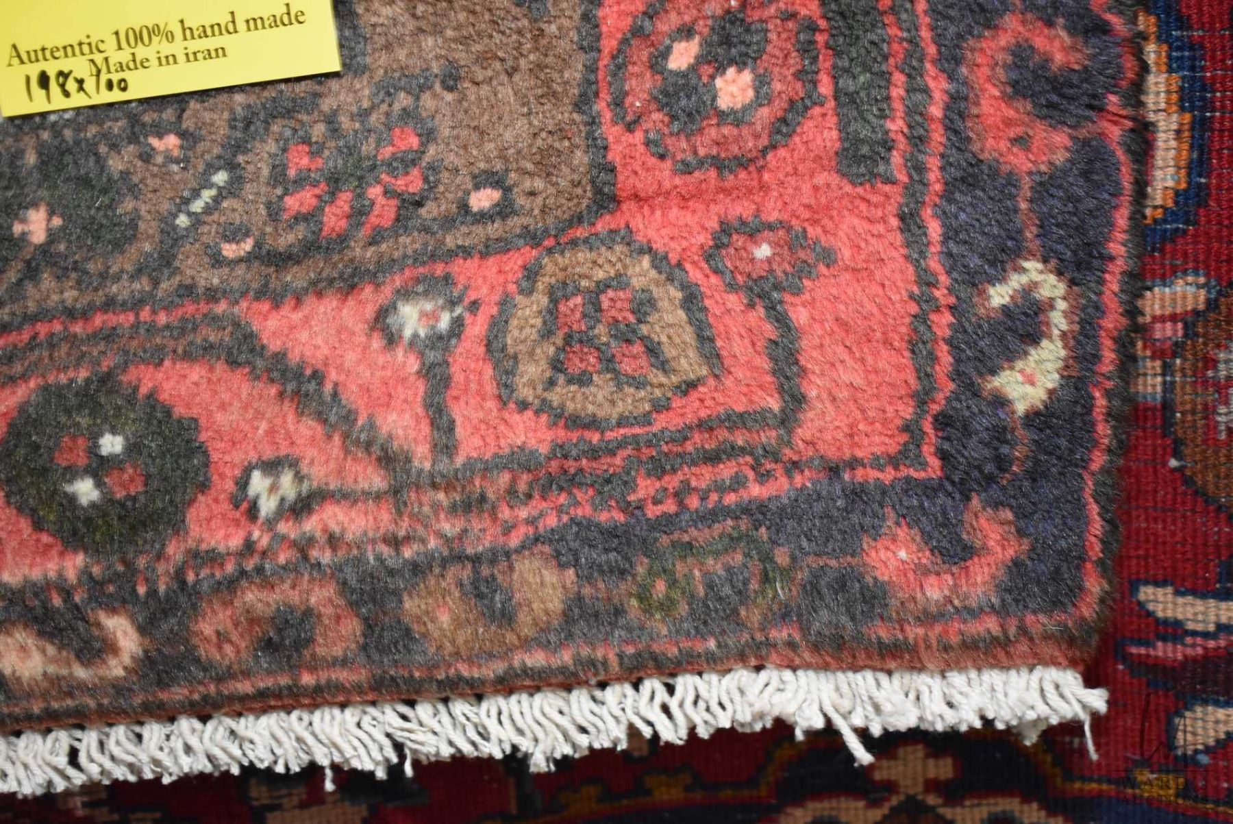 100% handmade Iranian Zanjan carpet with center medallion, overall geometric pattern with stylized foliage, in shades of reds, blues, cream, taupe etc. 40" X 76"
