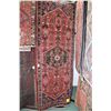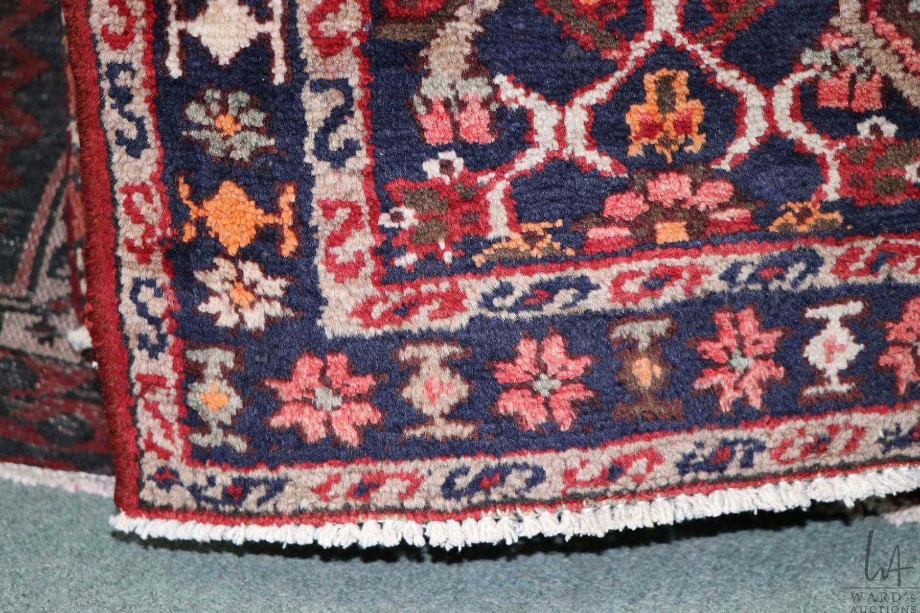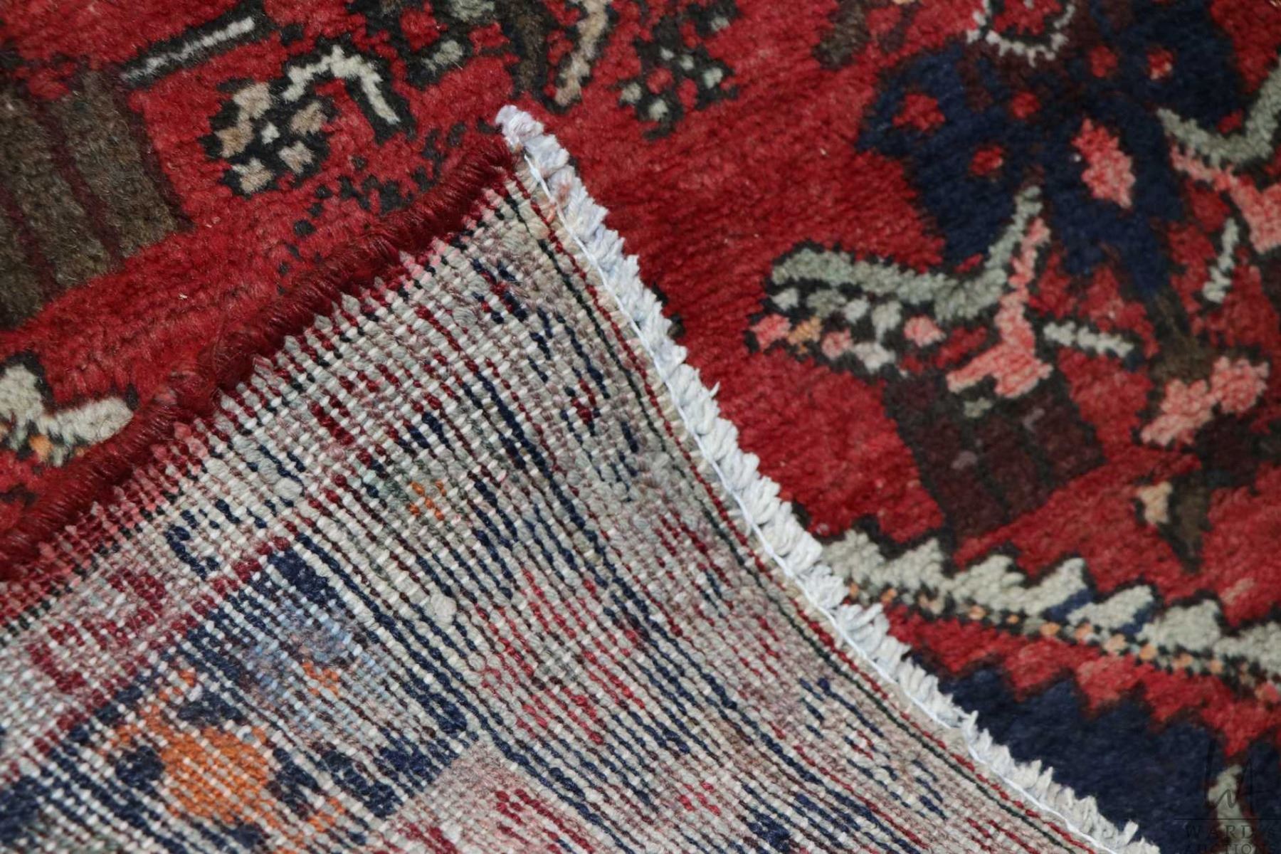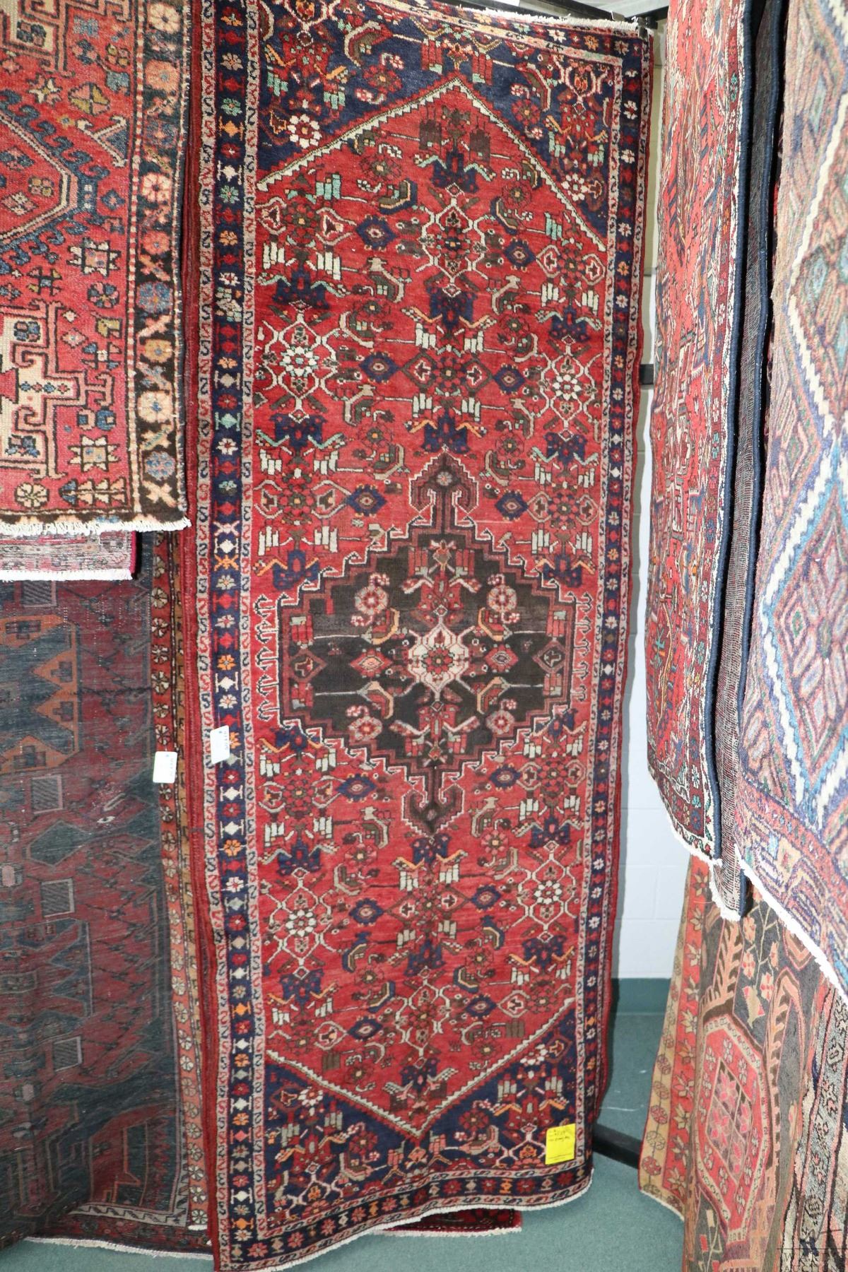 100% handmade Iranian Zanjan wool carpet runner with center medallion, red background and highlights in blue, cream, brown etc. 47" X 115"