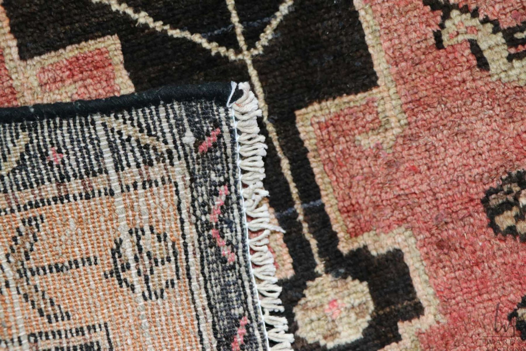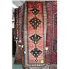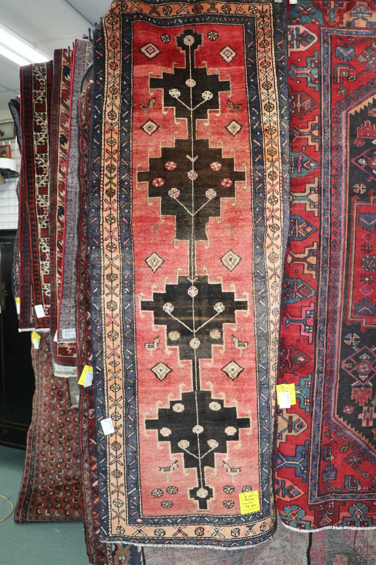100% handmade Iranian Zanjan wool carpet runner with multiple medallions on soft red background, triple border and highlights of brown, blue and orange, 33" X 96"