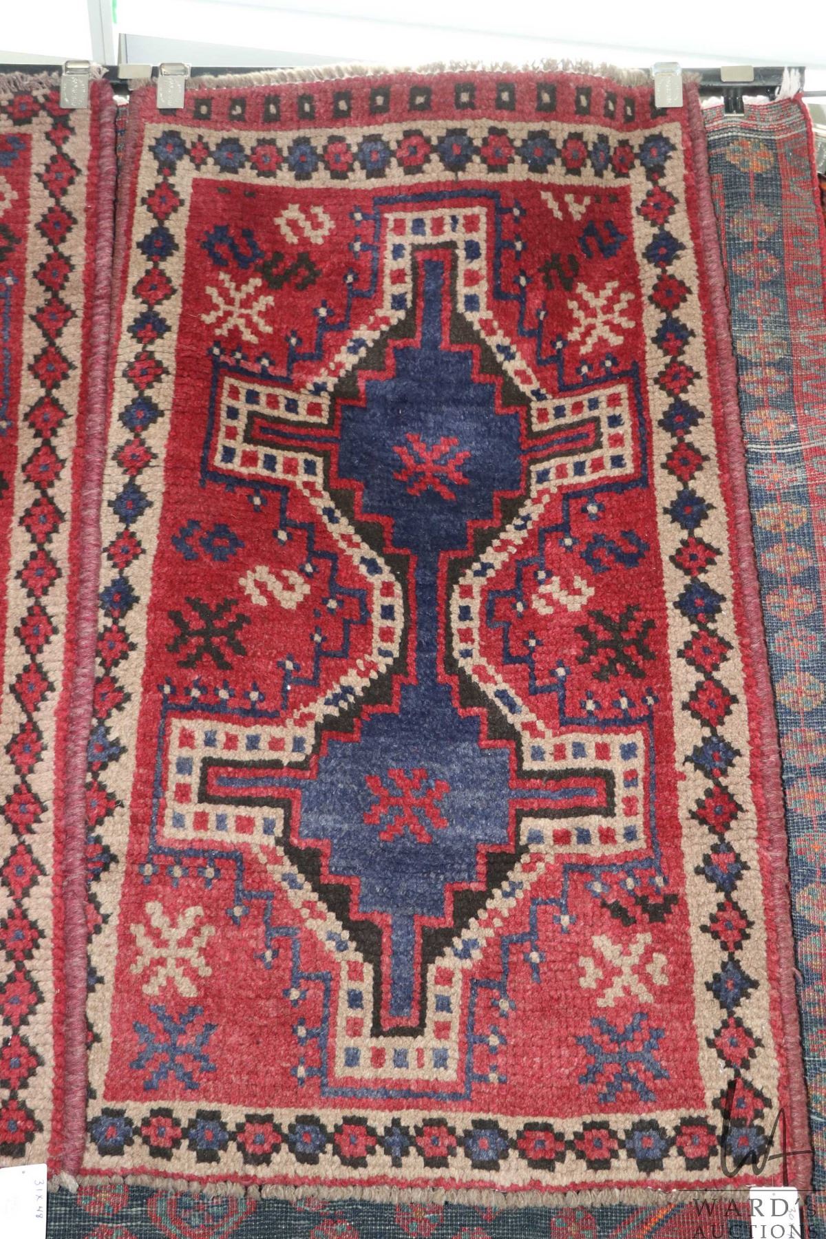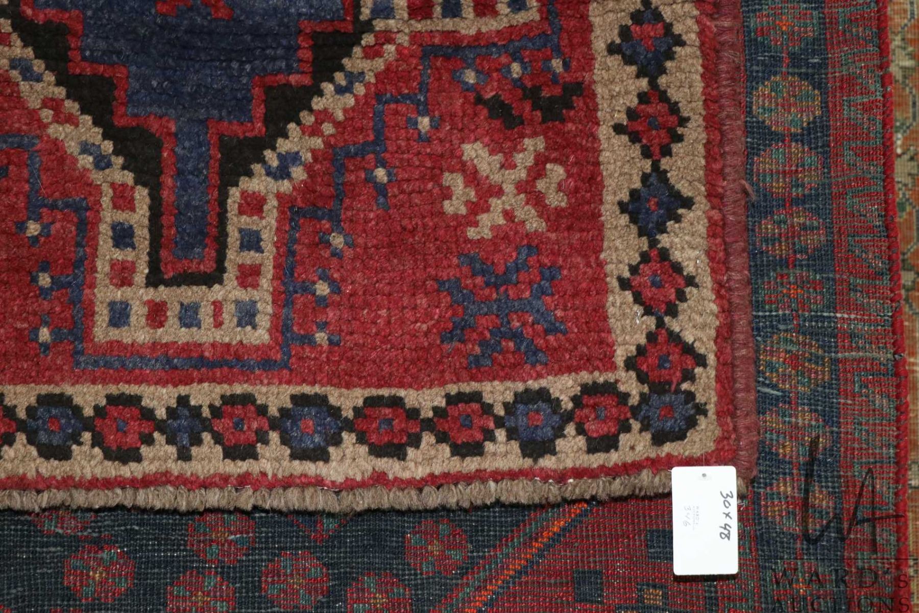 100% handmade Iranian scatter rug "Fasa" with double medallion, red background and highlights of blue, brown and taupe, 30" X 48"