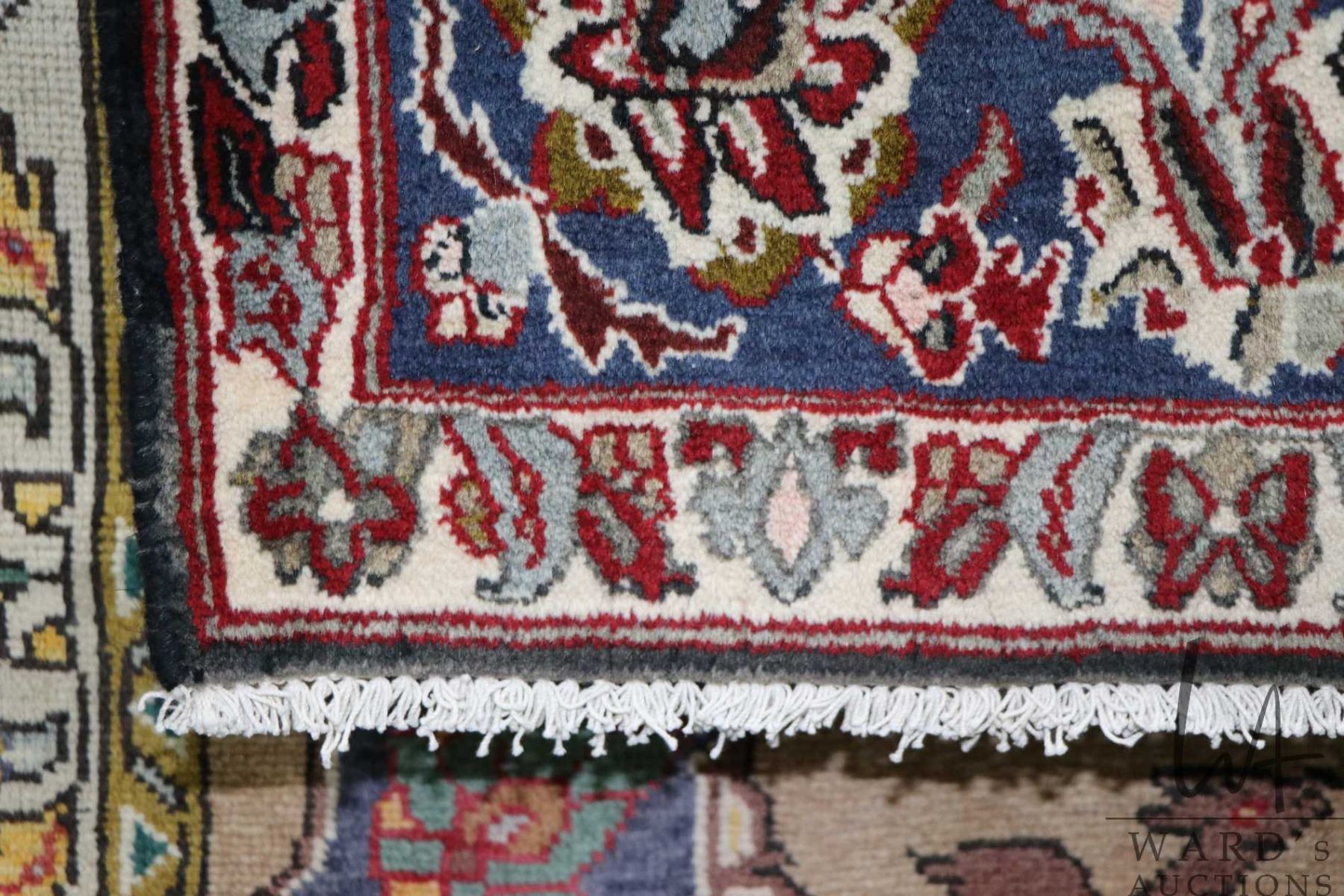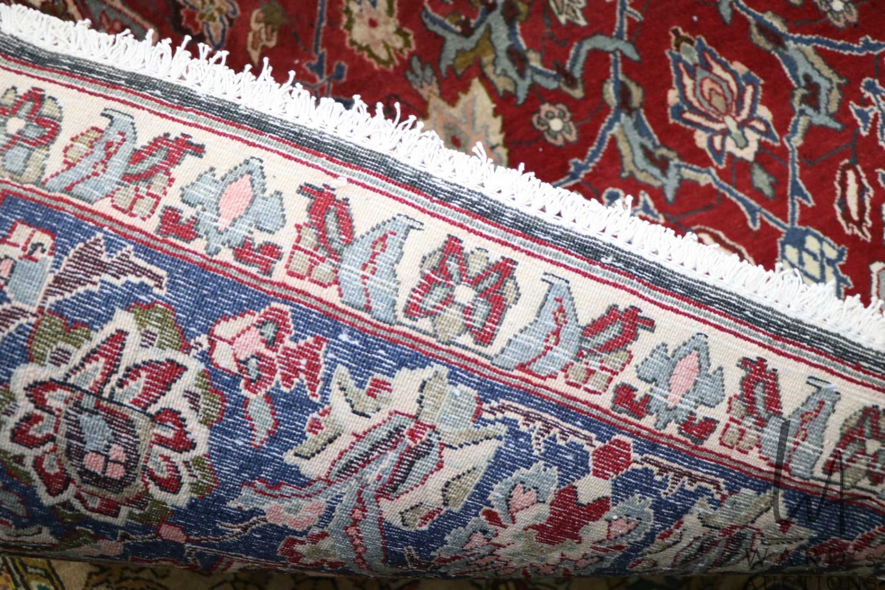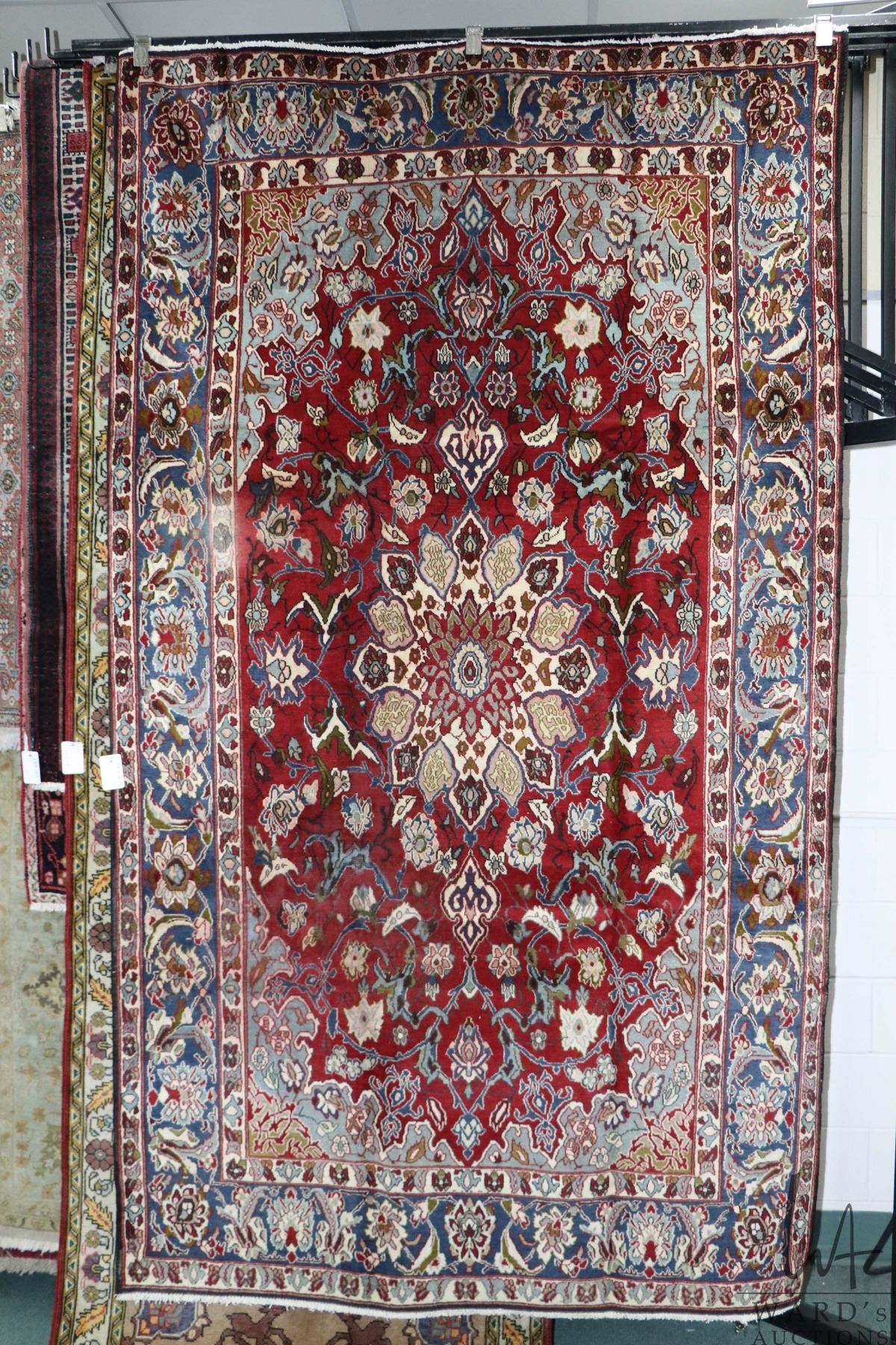 100% handmade Iranian wool "Isfahan" area carpet with center medallion, red background, overall floral design, hightlighs of pale blue, sage etc. 72" X 107"