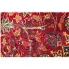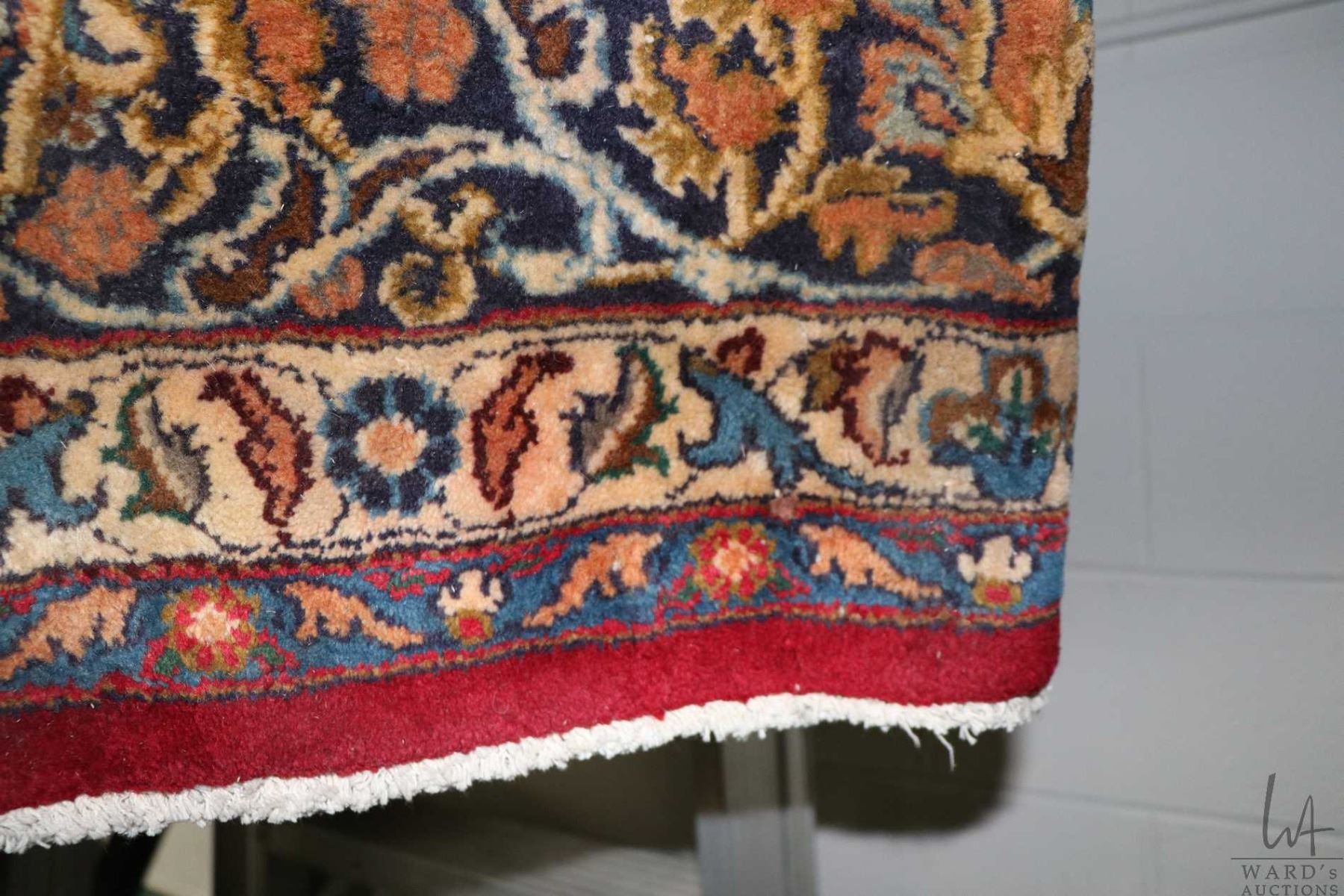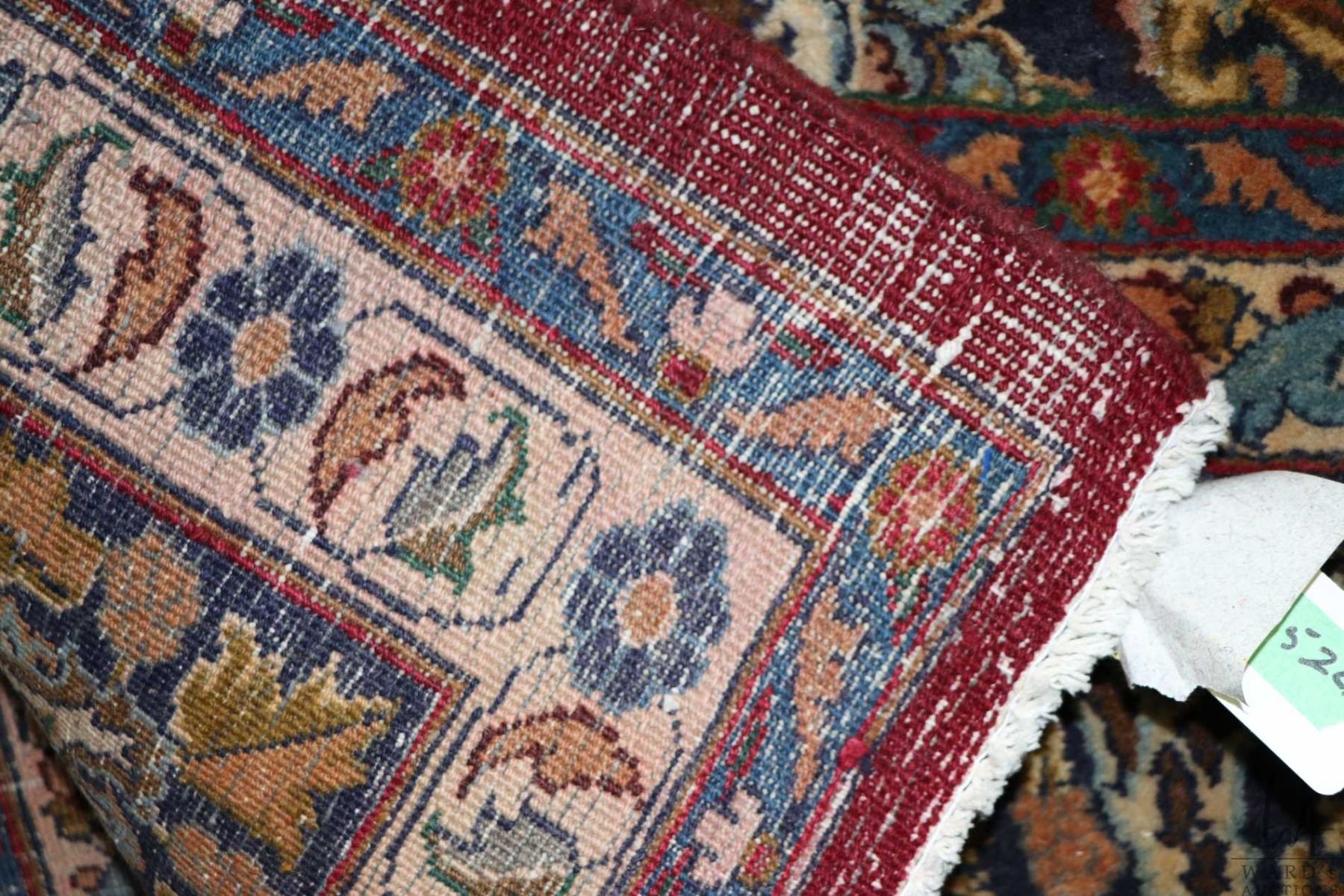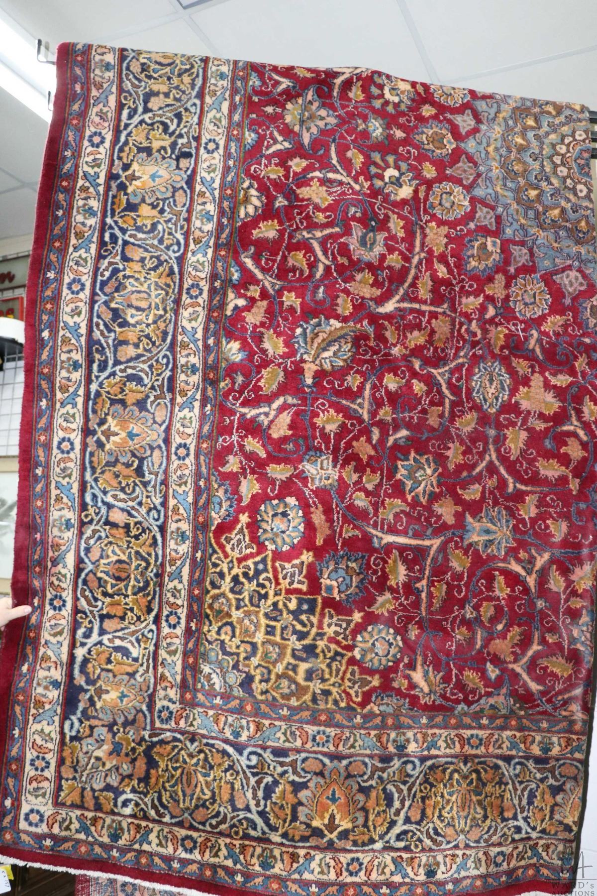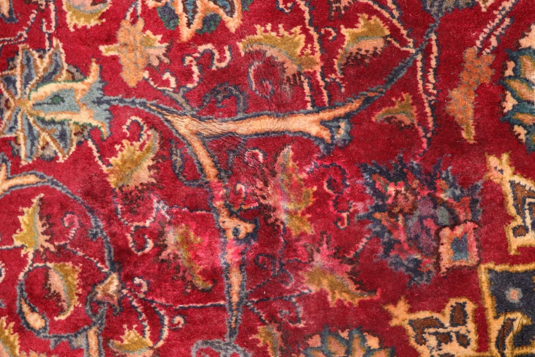 100% handmade Iranian wool Mashad area carpet with center medallion, overall floral pattern, red background and highlights of brown, blue and cream, 115" X 157" , note some colour run, see photo
