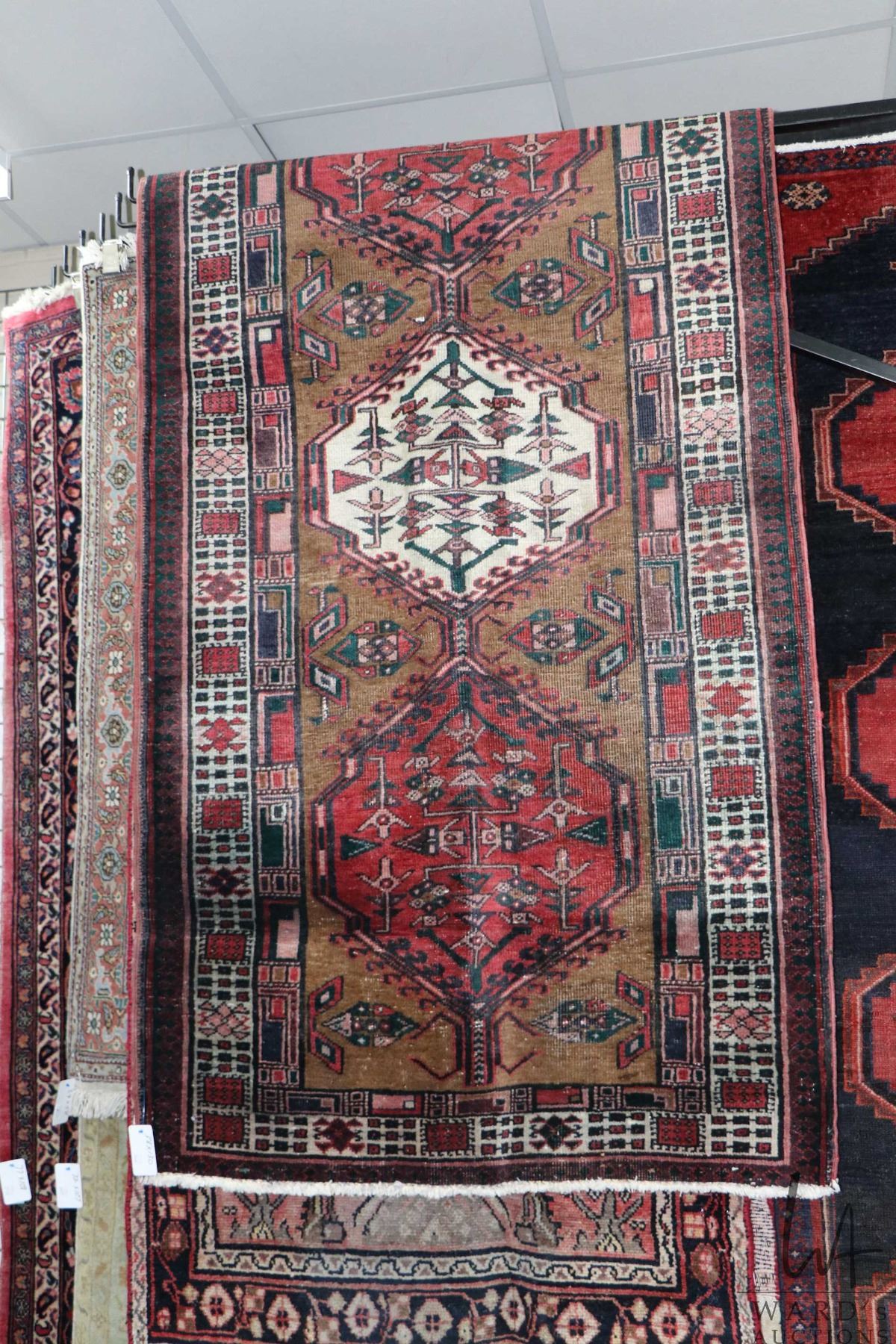 100% handmade Iranian wool "Sarab" carpet runner with milk chocolate background, multiple medallions and highlights of green, cream, pink etc. 38" X 130"