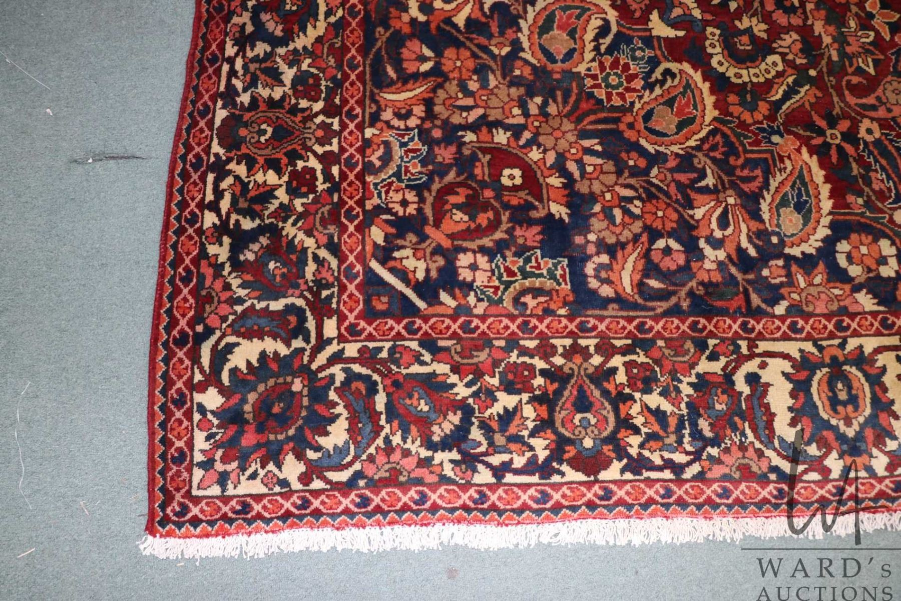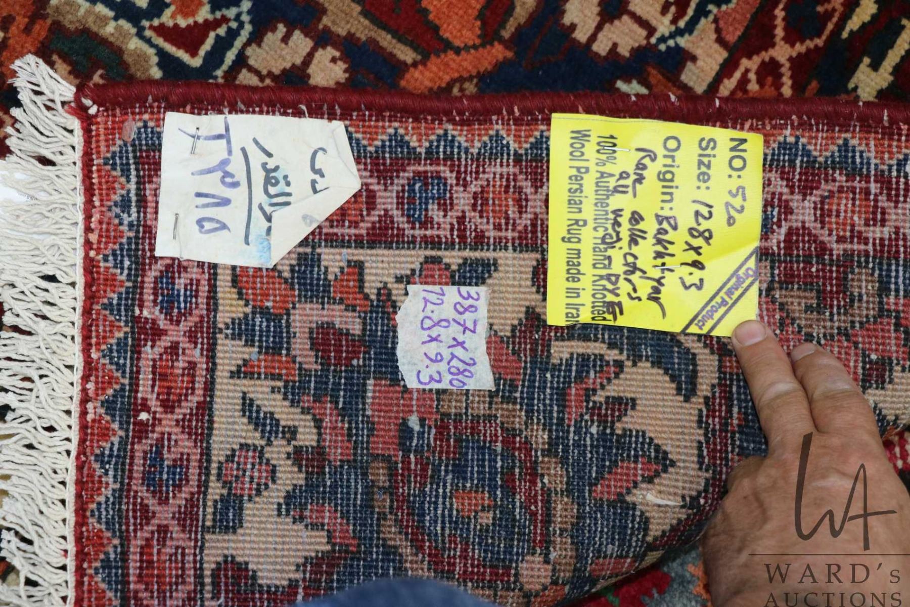 100% handmade Iranian wool carpet "Bakhtyar" with center medallion, brick background and highlights of blues, cream, peach etc. 110" X 151". Note: Not available for shipping. Local pickup only