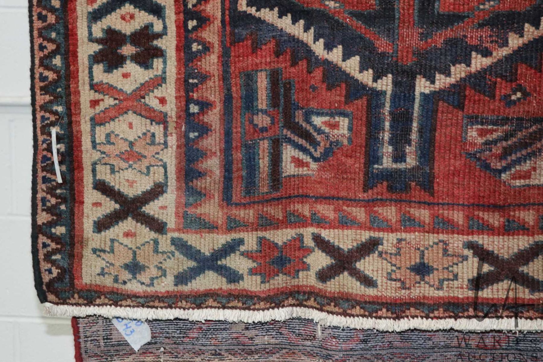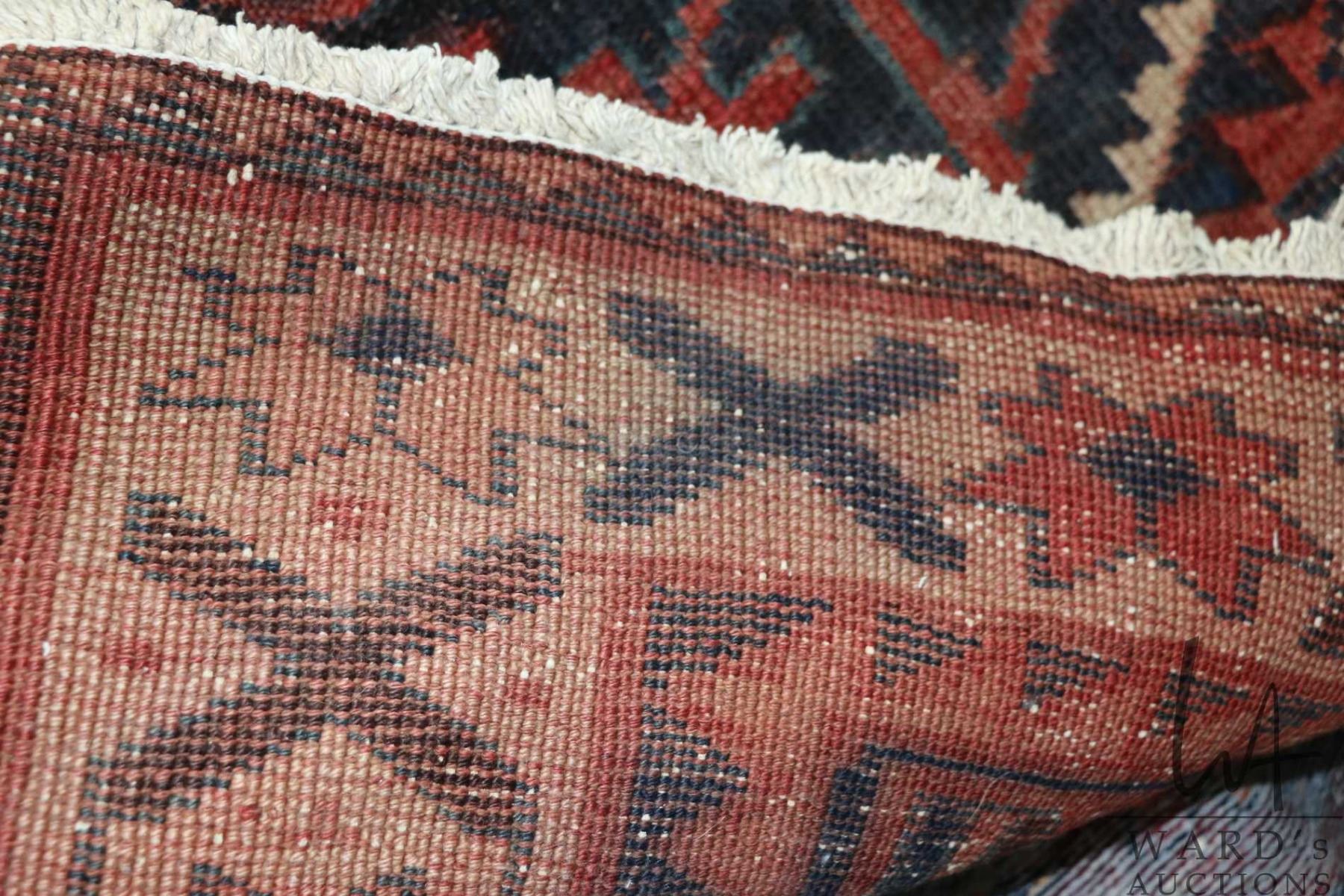 100% handmade Iranian wool carpet "Bakhtyar" with overall geometric design, red background and highlights of muted toned blue, brown and cream etc. 61" X 77"