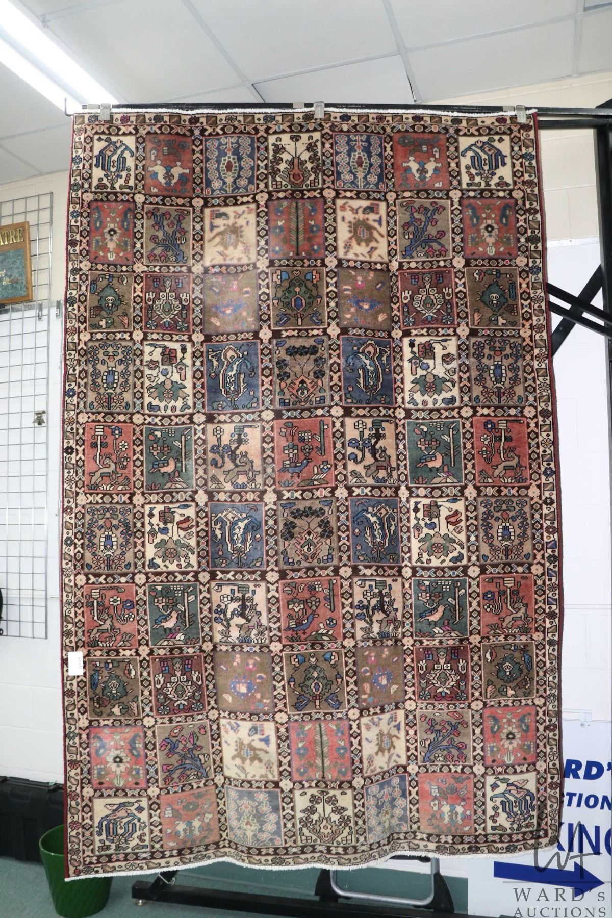 100% handmade Iranian wool carpet "Bakhtyar" with overall tile design featuring flora and fauna and highlights of blues, green, taupe, reds etc. 64" X 97"