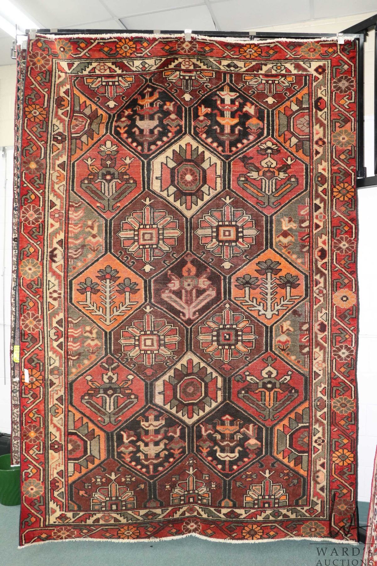 100% handmade Iranian wool carpet "Bakthyar" hexagonal tile patterned with stylized floral and geometric design, highlights of brown, orange, taupe etc. 74" X 112"