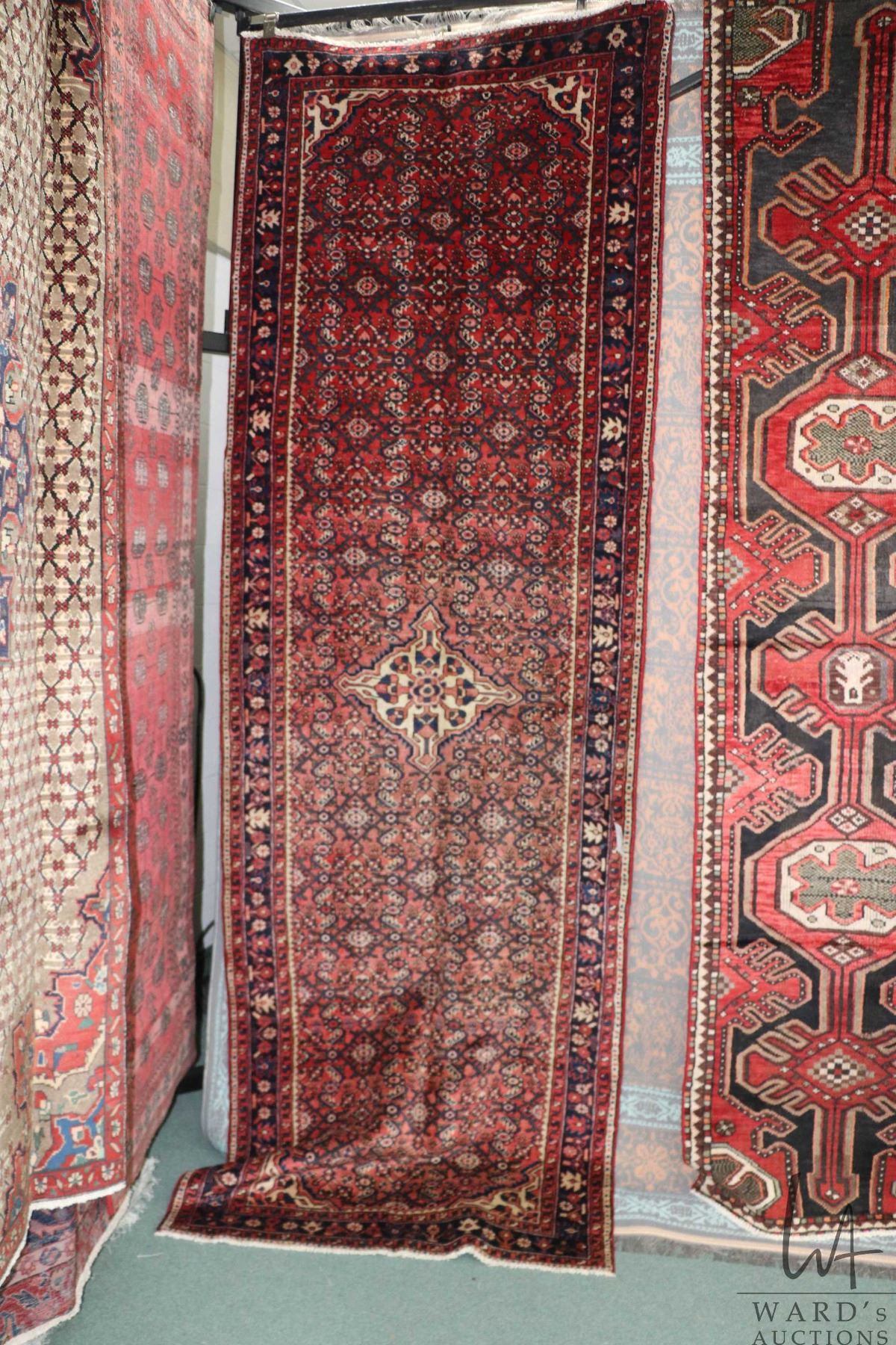 100% handmade Iranian wool carpet "Hamdan" with red background, center medallion and geometric pattern, highlights are blue, cream and taupe, 42" X 127"