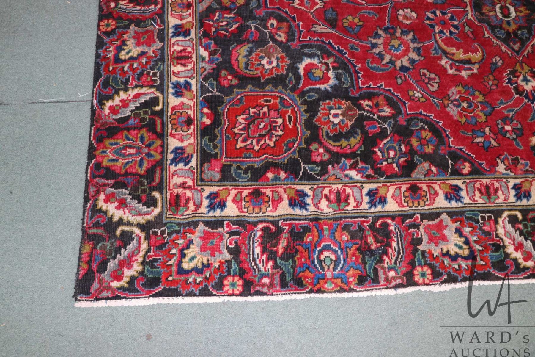 100% handmade Iranian wool carpet "Mashad" with center medallion, red background and overall floral design, highlights of blues, cream and green 108" X 153". Note: Not available for shipping. Local pickup only