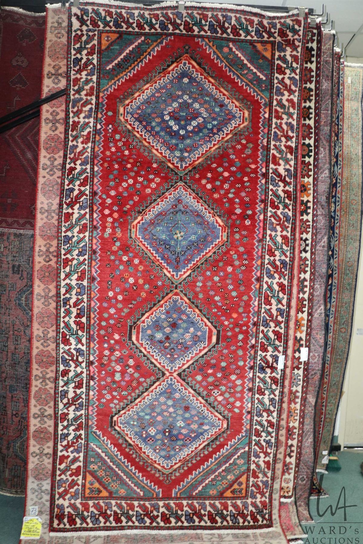 100% handmade Iranian wool carpet "Shiraz" runner with quadruple medallions, red background and highlights of green, blue, cream etc. 49" X 114"