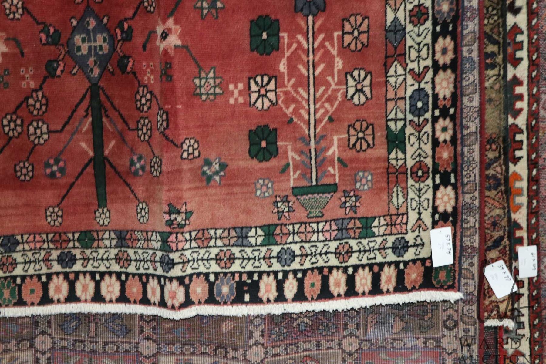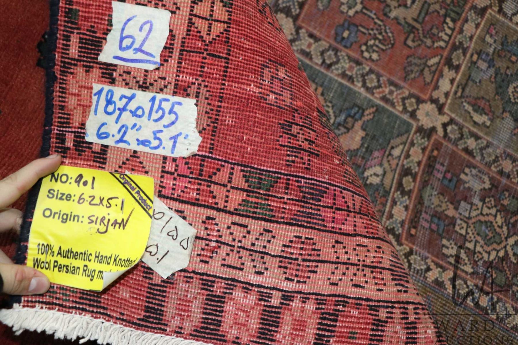 100% handmade Iranian wool carpet "Sirjan" with center medallion, overall floral design and red background, highlights of mauve, green, brown etc. 57" X 74"