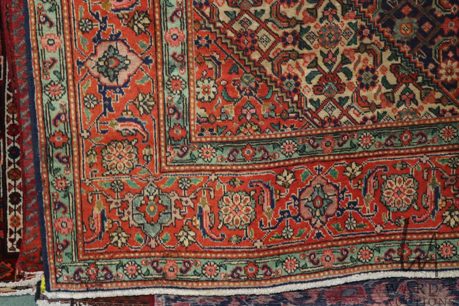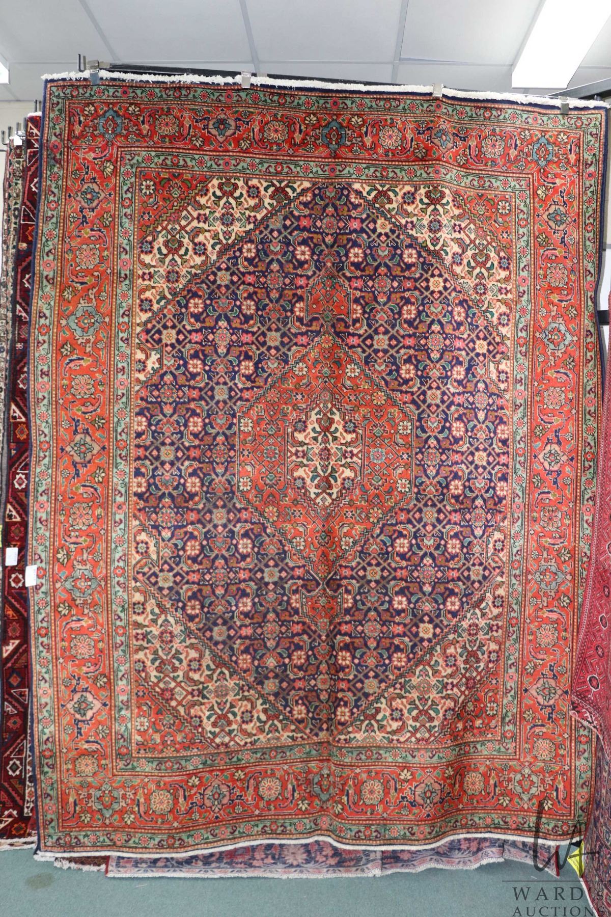 100% handmade Iranian wool carpet "Tabriz" with center medallion, orange background, tight floral design and highlights of navy, green, cream etc. 85" X 112"