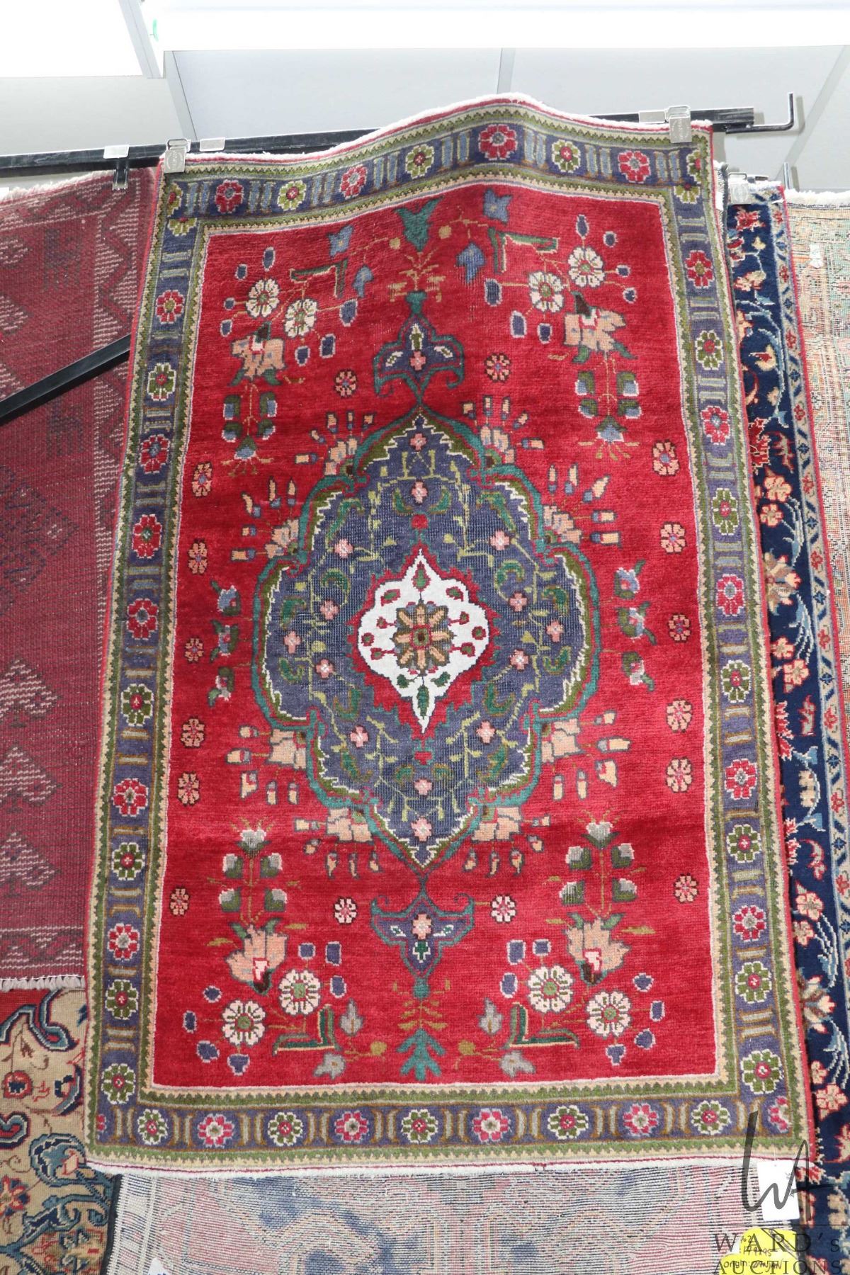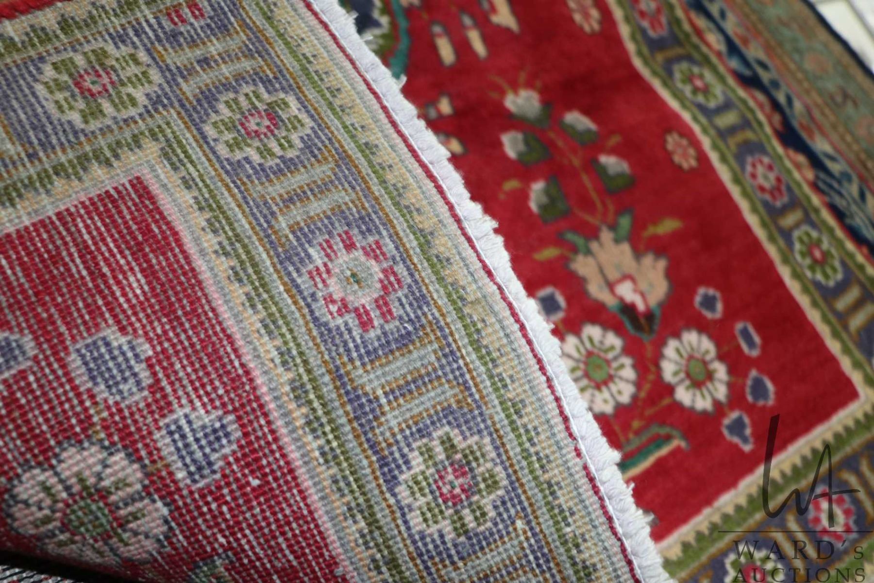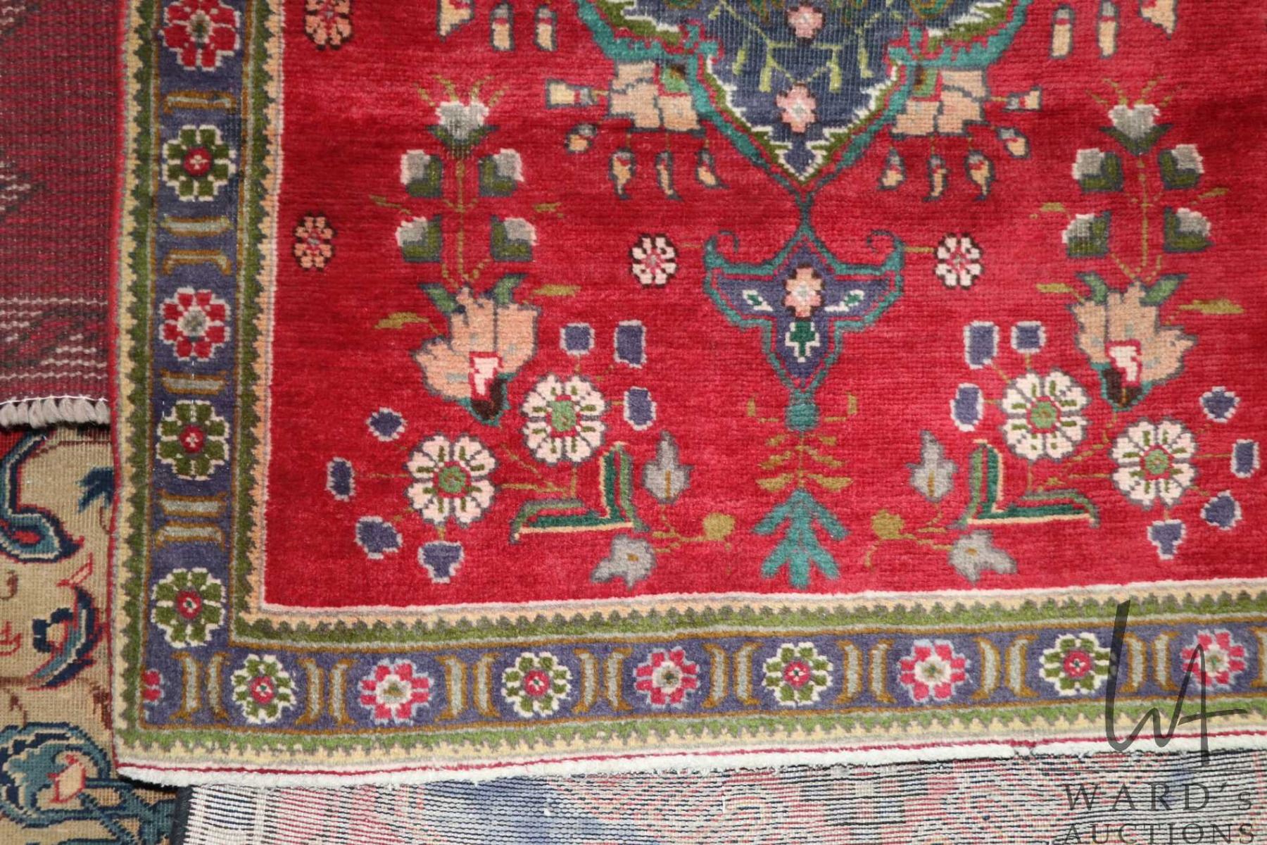 100% handmade Iranian wool carpet "Tabriz" with center medallion, red background and highlights of green, cream and blue, 38" X 58"